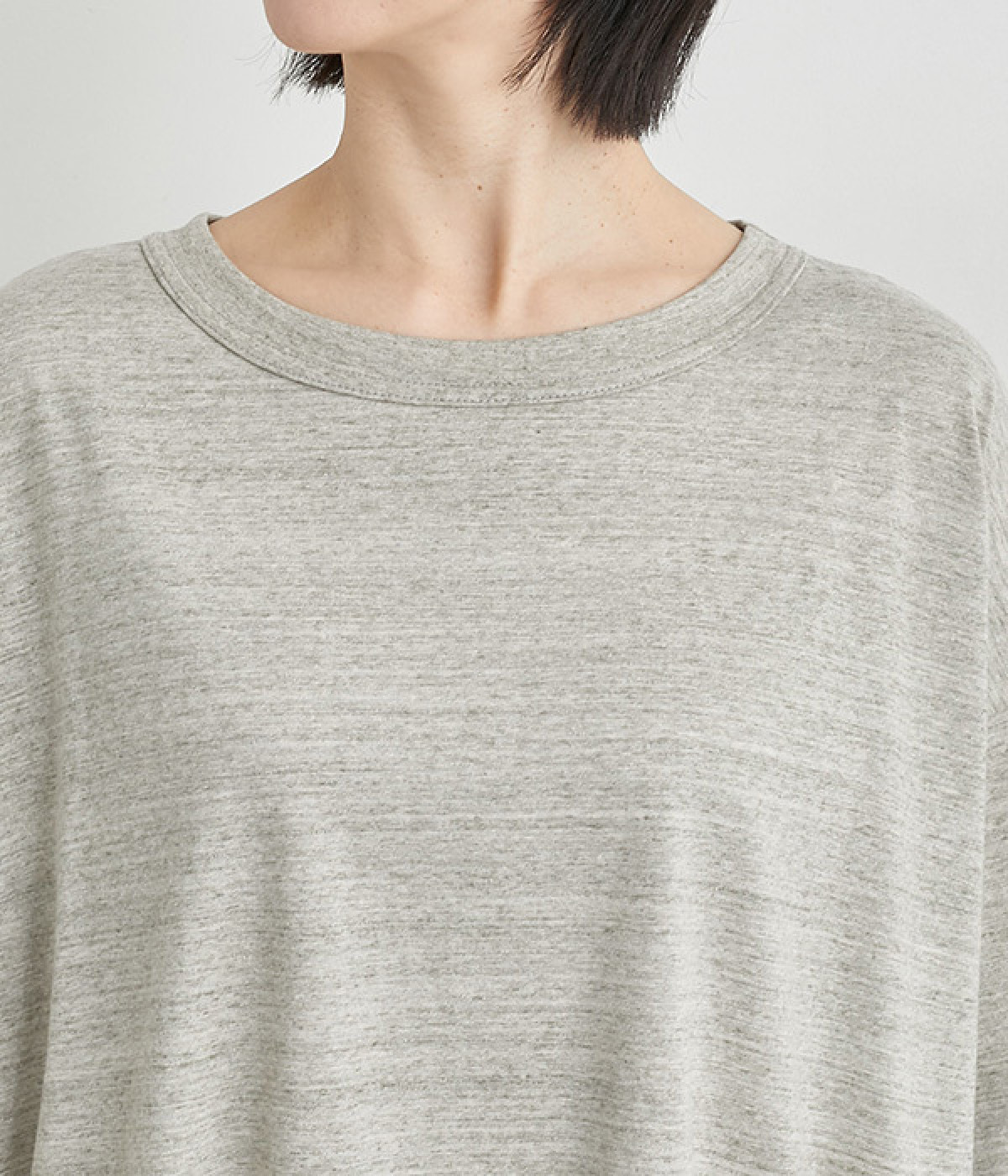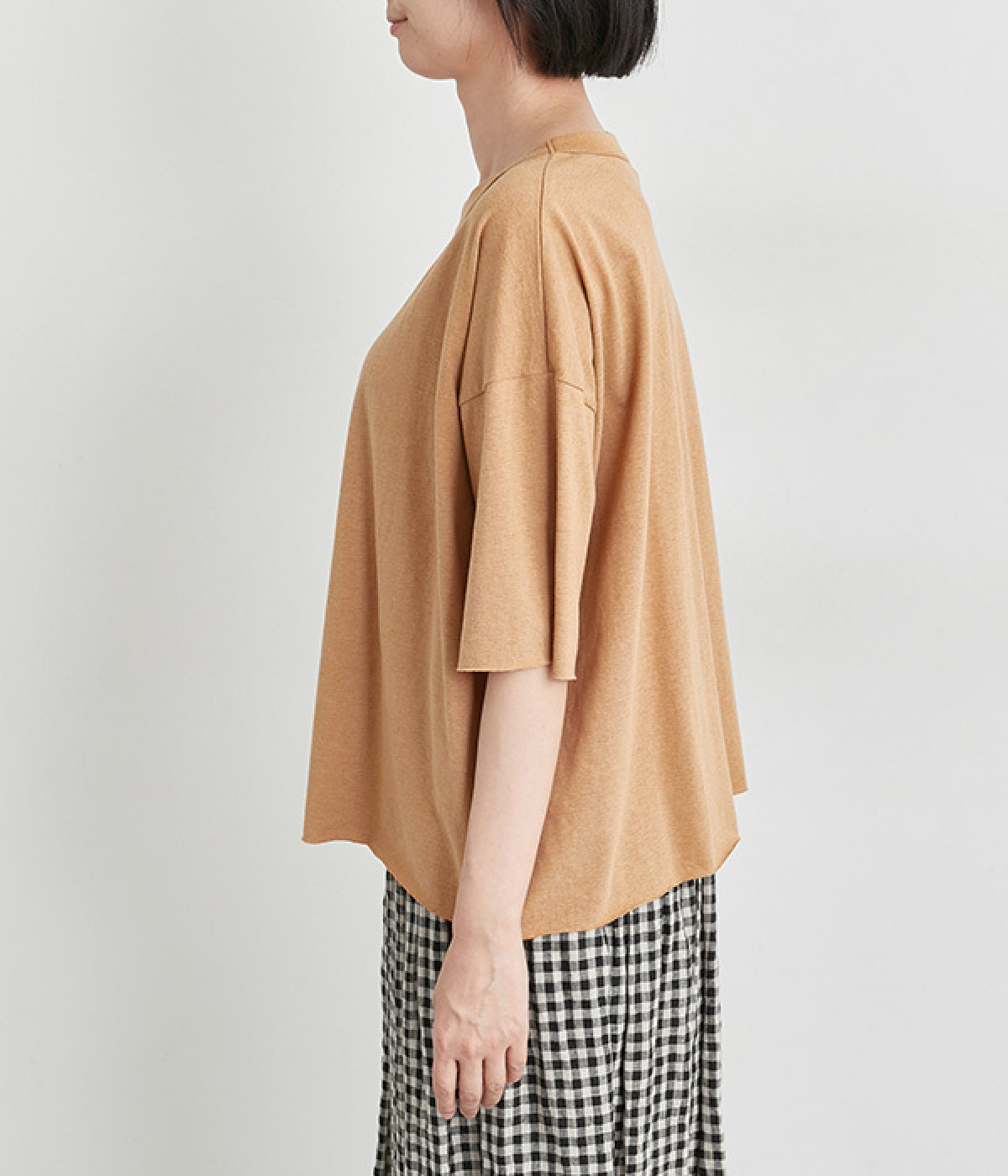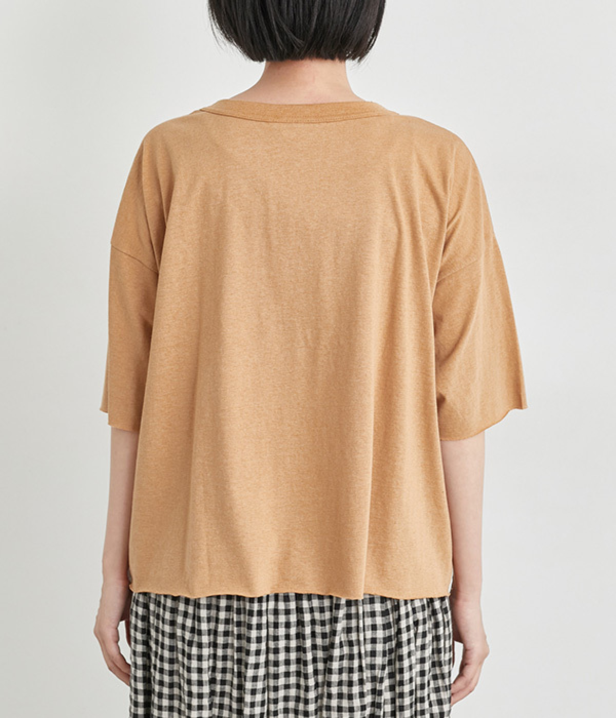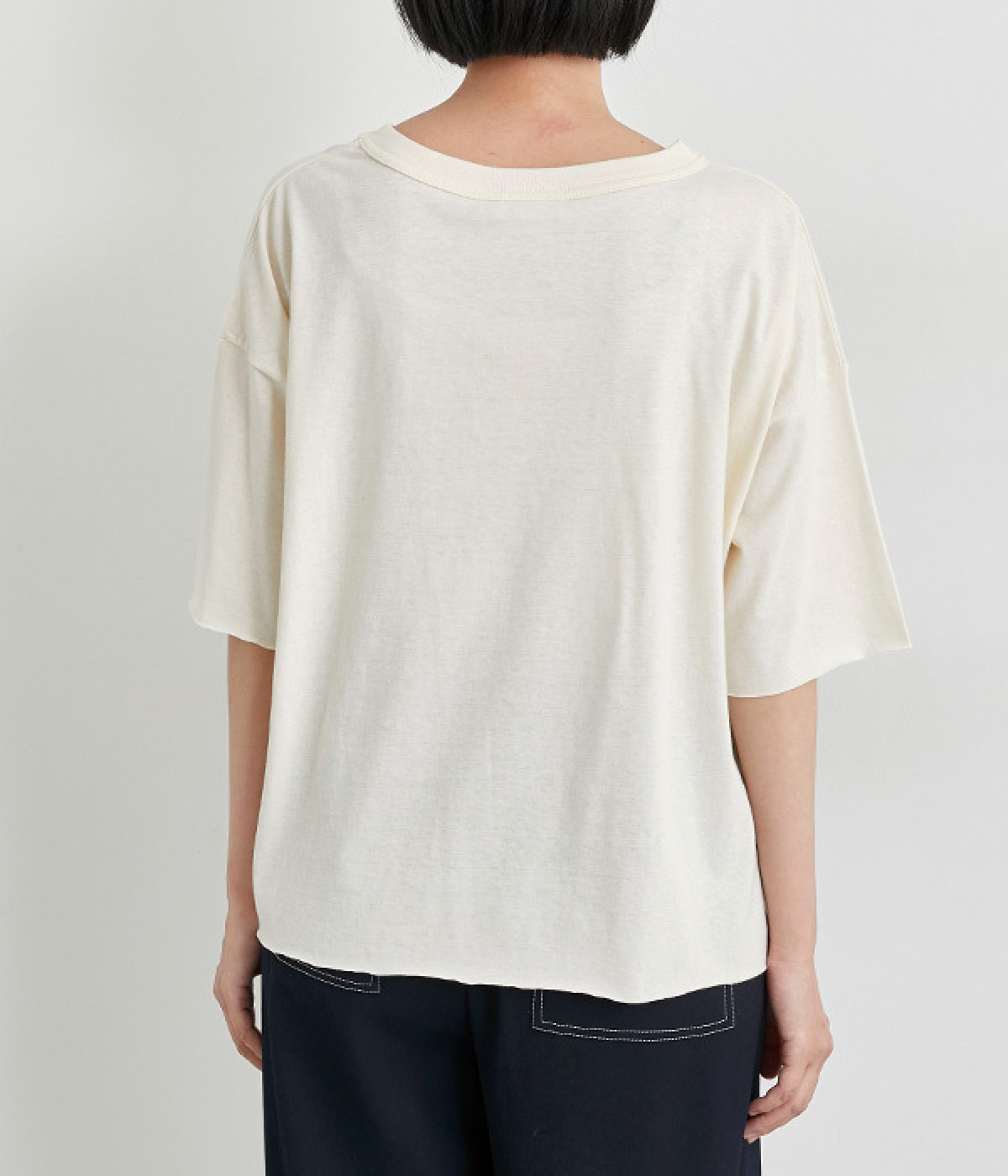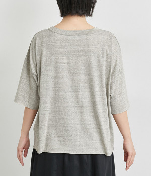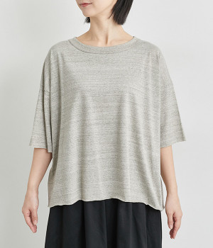 リラックス感のある着こなしがお似合いなドロップショルダーのワイドシルエットに仕上げました。カットオフしたラフさも雰囲気にマッチしています。無地でボトム合わせしやすく、シンプルな装いもサマになる一枚です。
