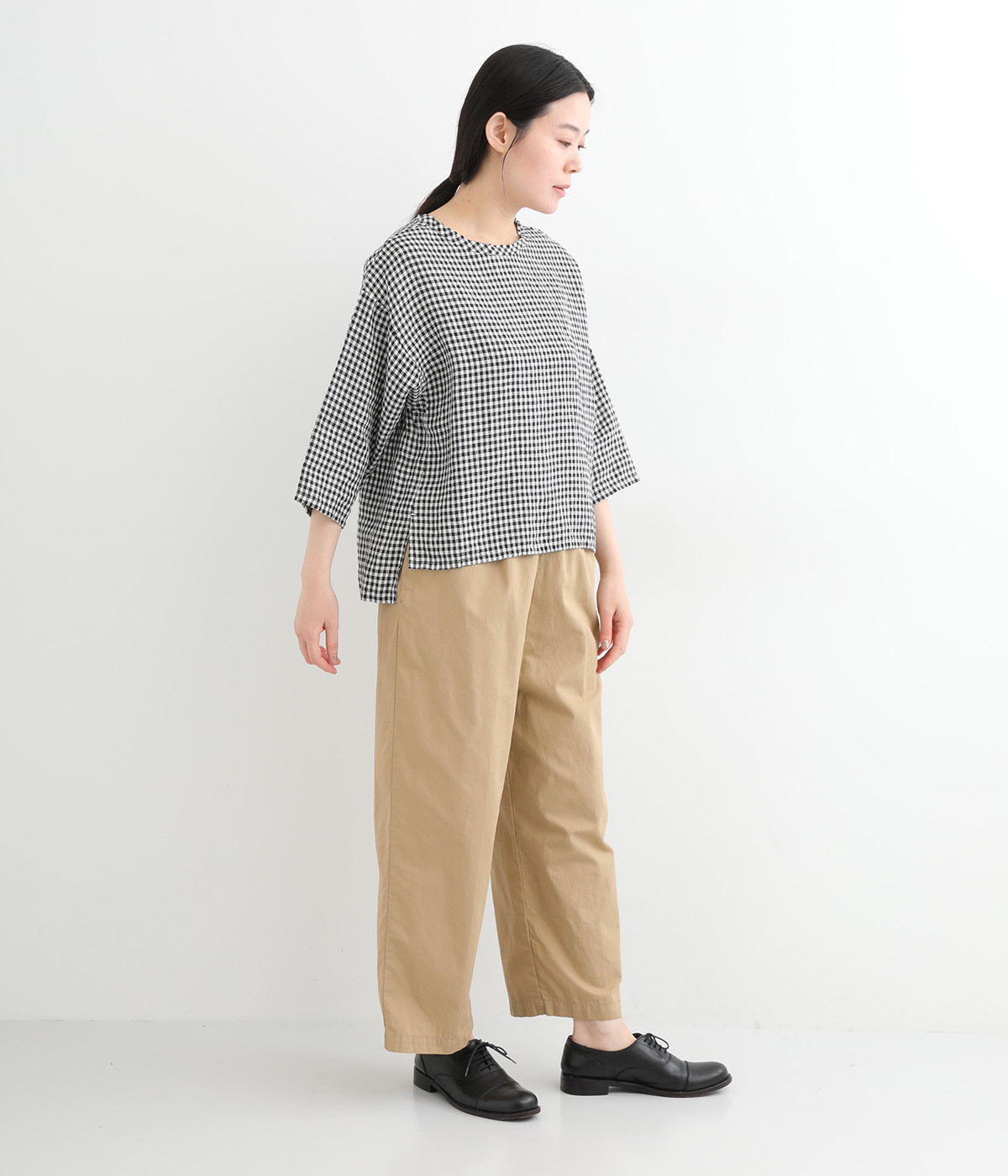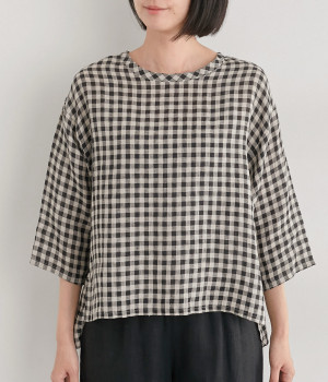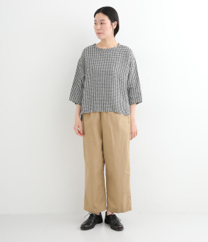 Tシャツ感覚で気軽に着られる、シンプルな仕立てのプルオーバー。リラクシーなワイドシルエットに、スリット入りの前後差ヘムで、さまざまなボトムと好バランス。かわいらしいギンガムチェックが、コーディネートにさりげないアクセントを添えます。