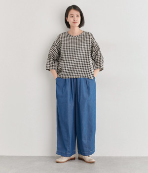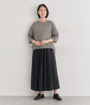 甘く織り上げた薄手素材で、独特のハリ感を持つリネン生地を使用しました。通気性が高く、暑い季節も爽やかな着心地を叶えます。