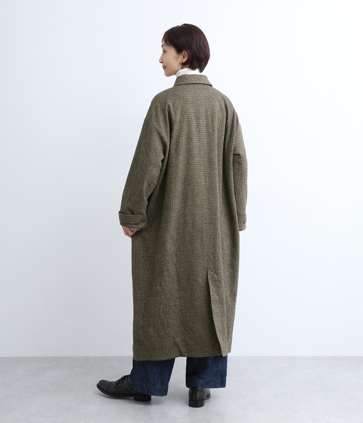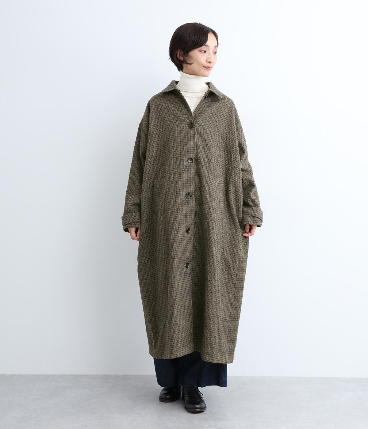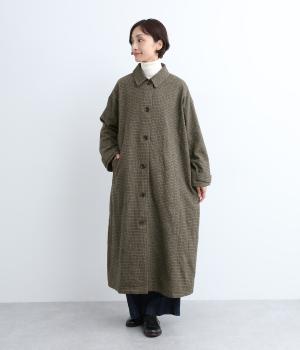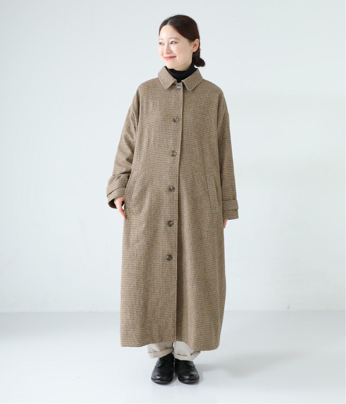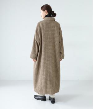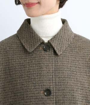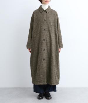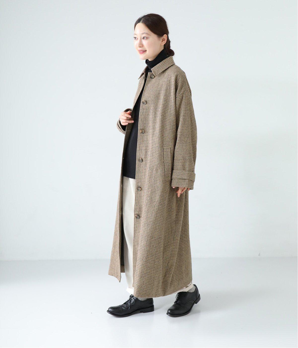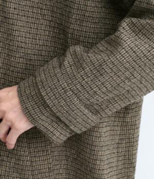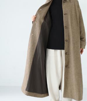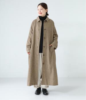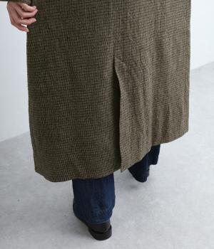 ゆとりもたせつつシルエットはすっきりまとめて汎用性高く仕上げました。落ち着いたチェック柄にロング丈がクラシカルな印象で、雰囲気を高めてくれます。ボタンをあけたラフな羽織りもさまになる襟つきで、後ろベント入りで前を留めても足さばきは快適。