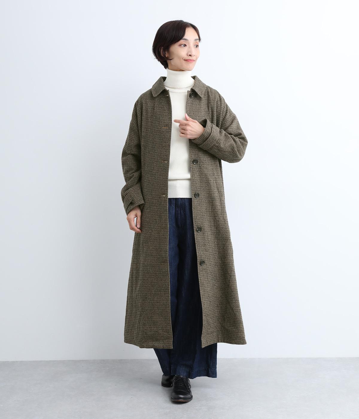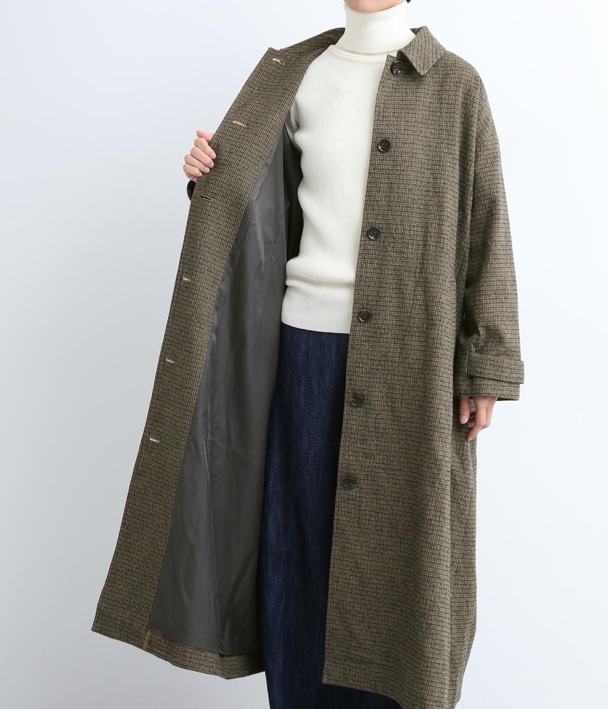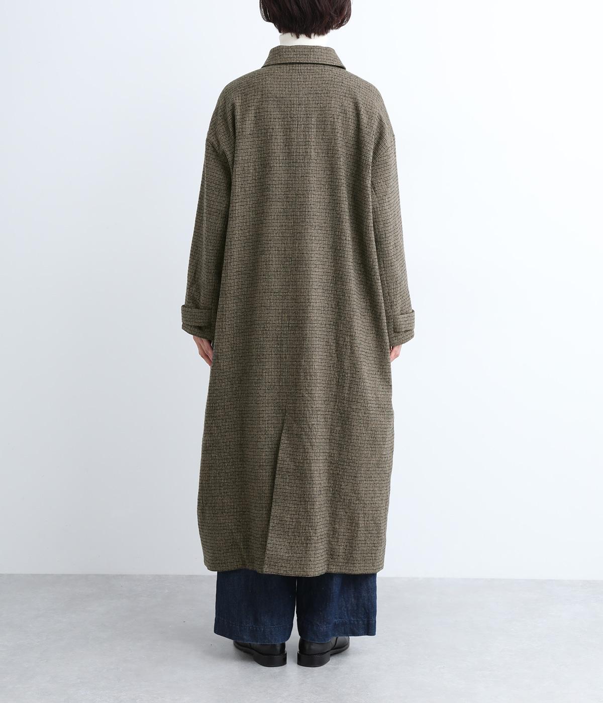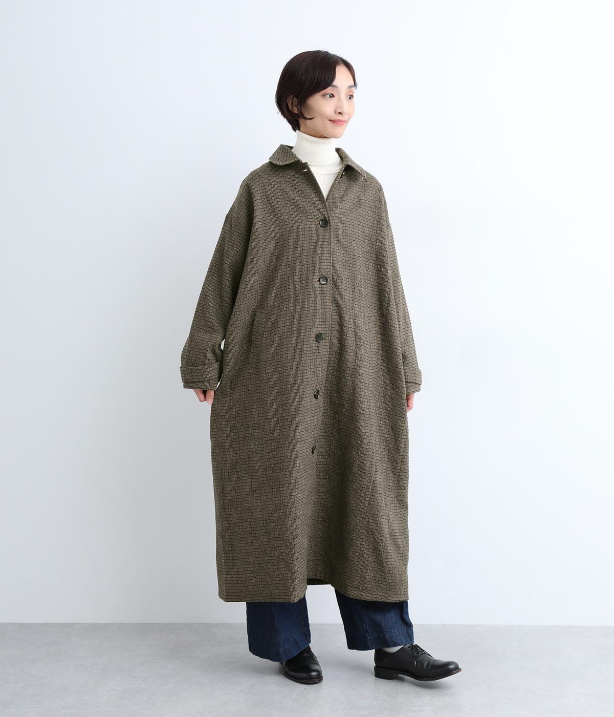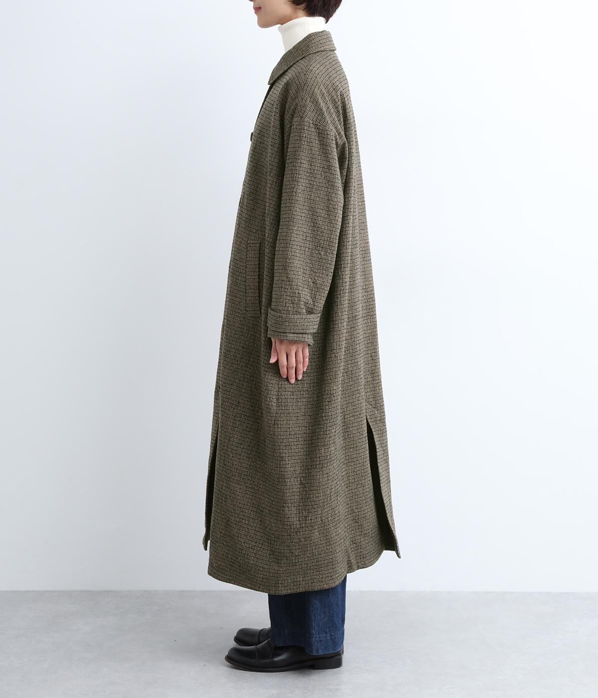 ゆとりもたせつつシルエットはすっきりまとめて汎用性高く仕上げました。落ち着いたチェック柄にロング丈がクラシカルな印象で、雰囲気を高めてくれます。ボタンをあけたラフな羽織りもさまになる襟つきで、後ろベント入りで前を留めても足さばきは快適。