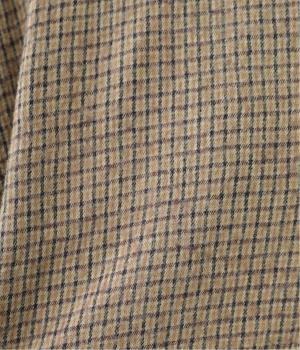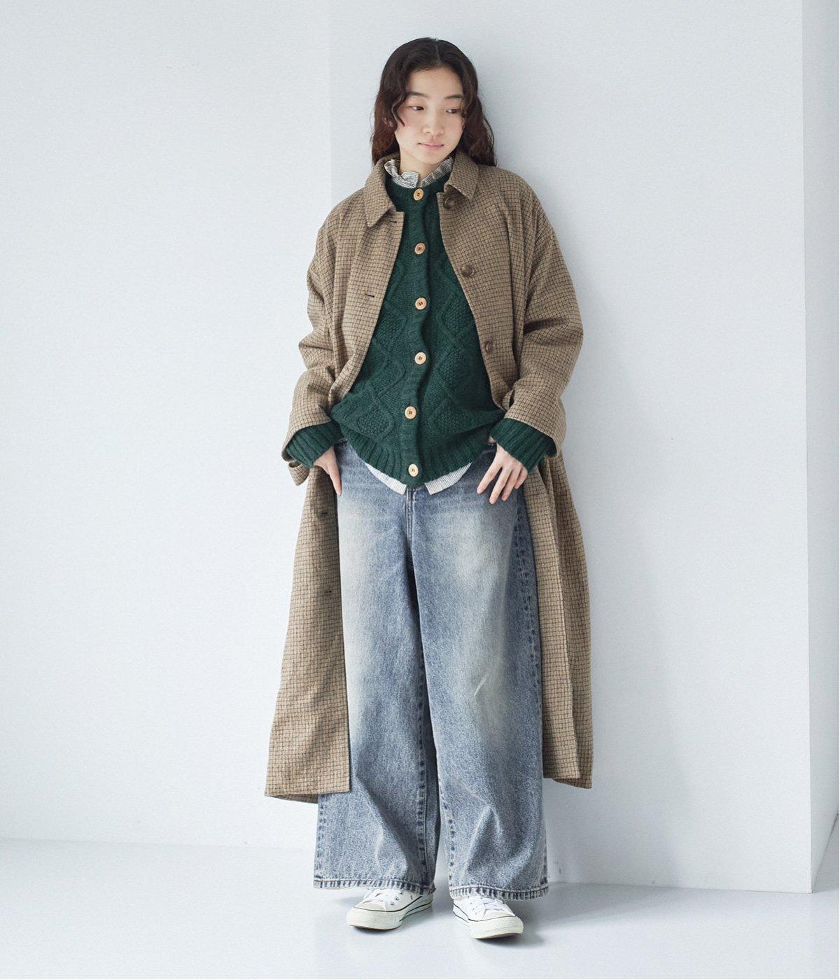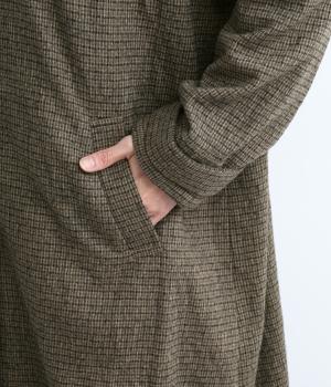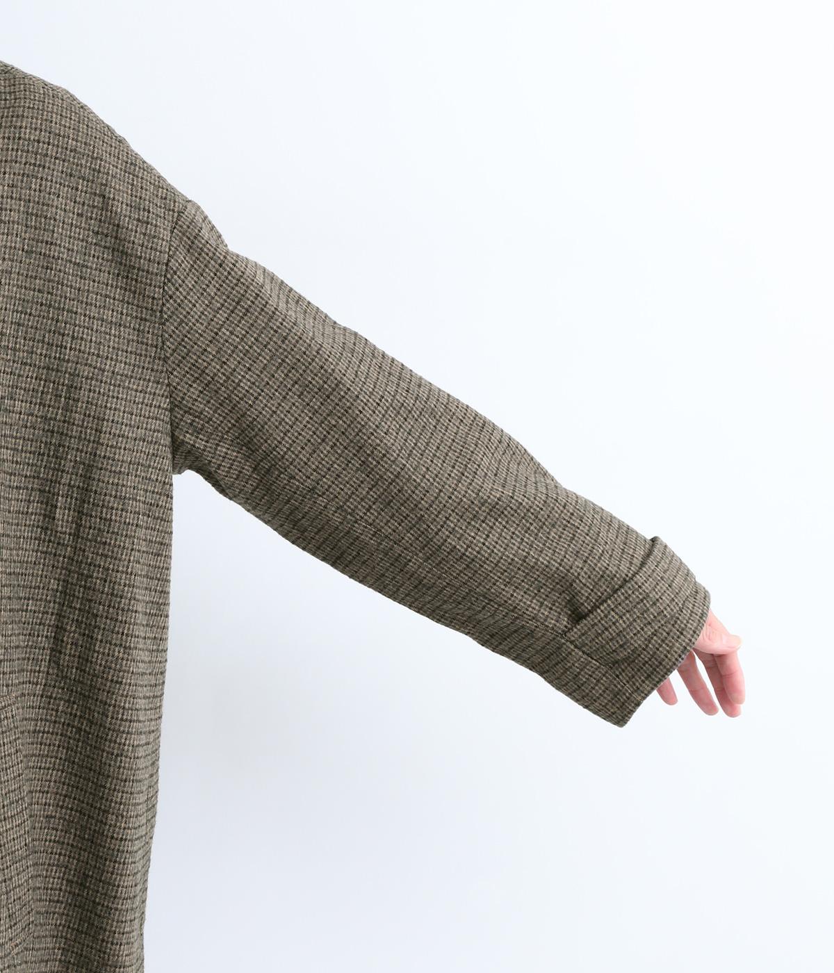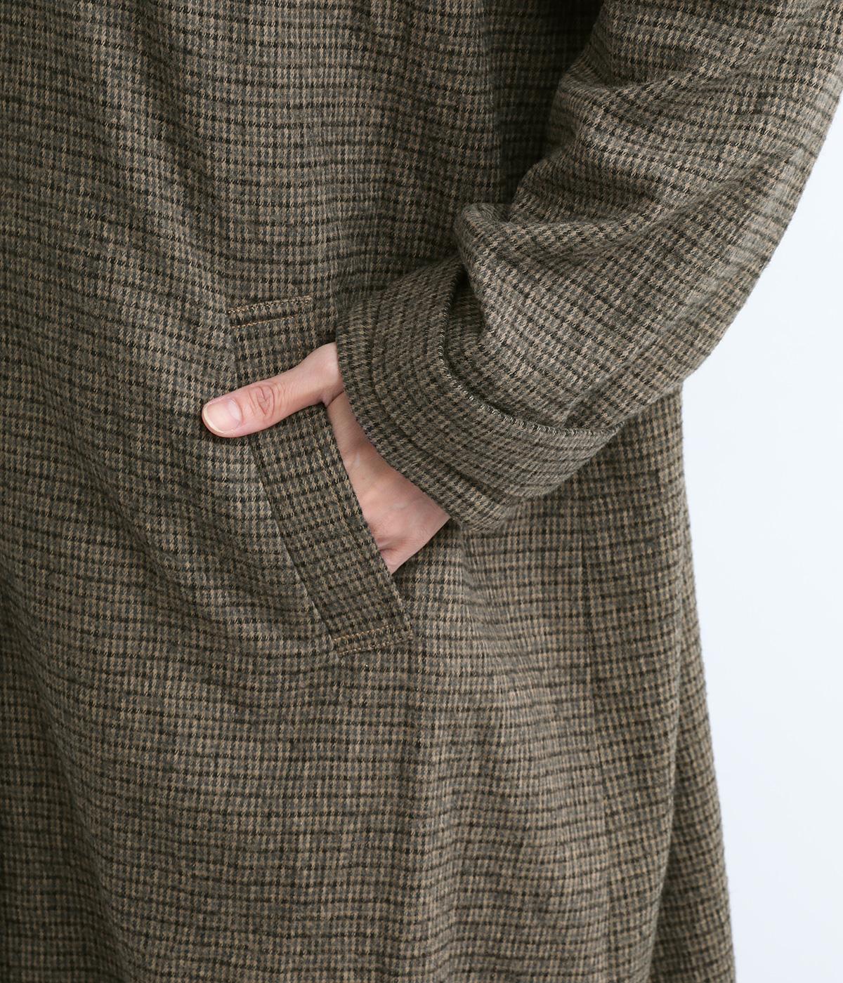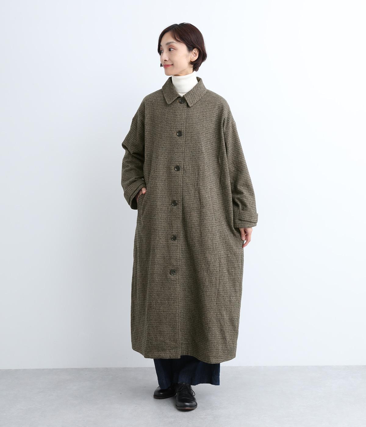 ゆとりもたせつつシルエットはすっきりまとめて汎用性高く仕上げました。落ち着いたチェック柄にロング丈がクラシカルな印象で、雰囲気を高めてくれます。ボタンをあけたラフな羽織りもさまになる襟つきで、後ろベント入りで前を留めても足さばきは快適。