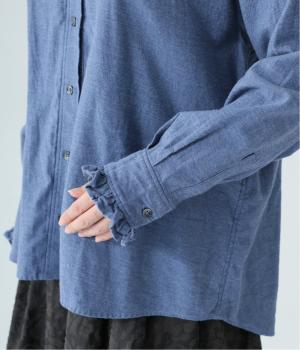 きちんと感ただようバンドカラーシャツの襟と袖口に、愛らしいフリルをあしらいました。背中にセンタープリーツを入れてゆったりと広がるシルエットに。腰をおおう絶妙な着丈で、さまざまなボトムスとバランスよく合わせられます。