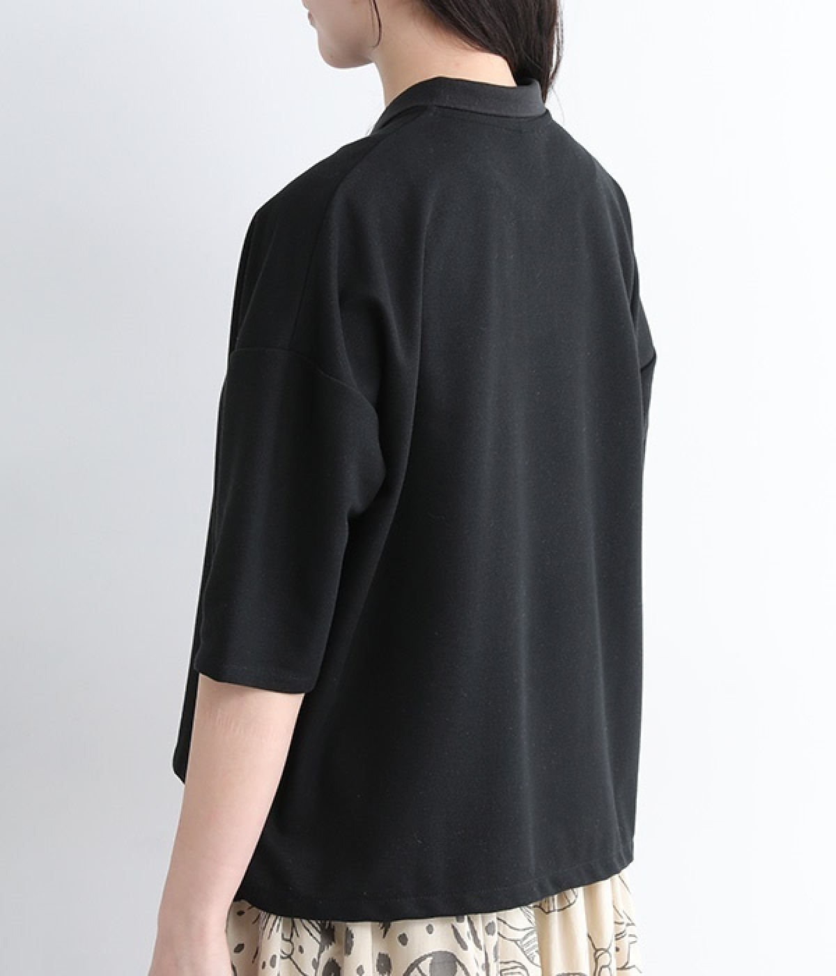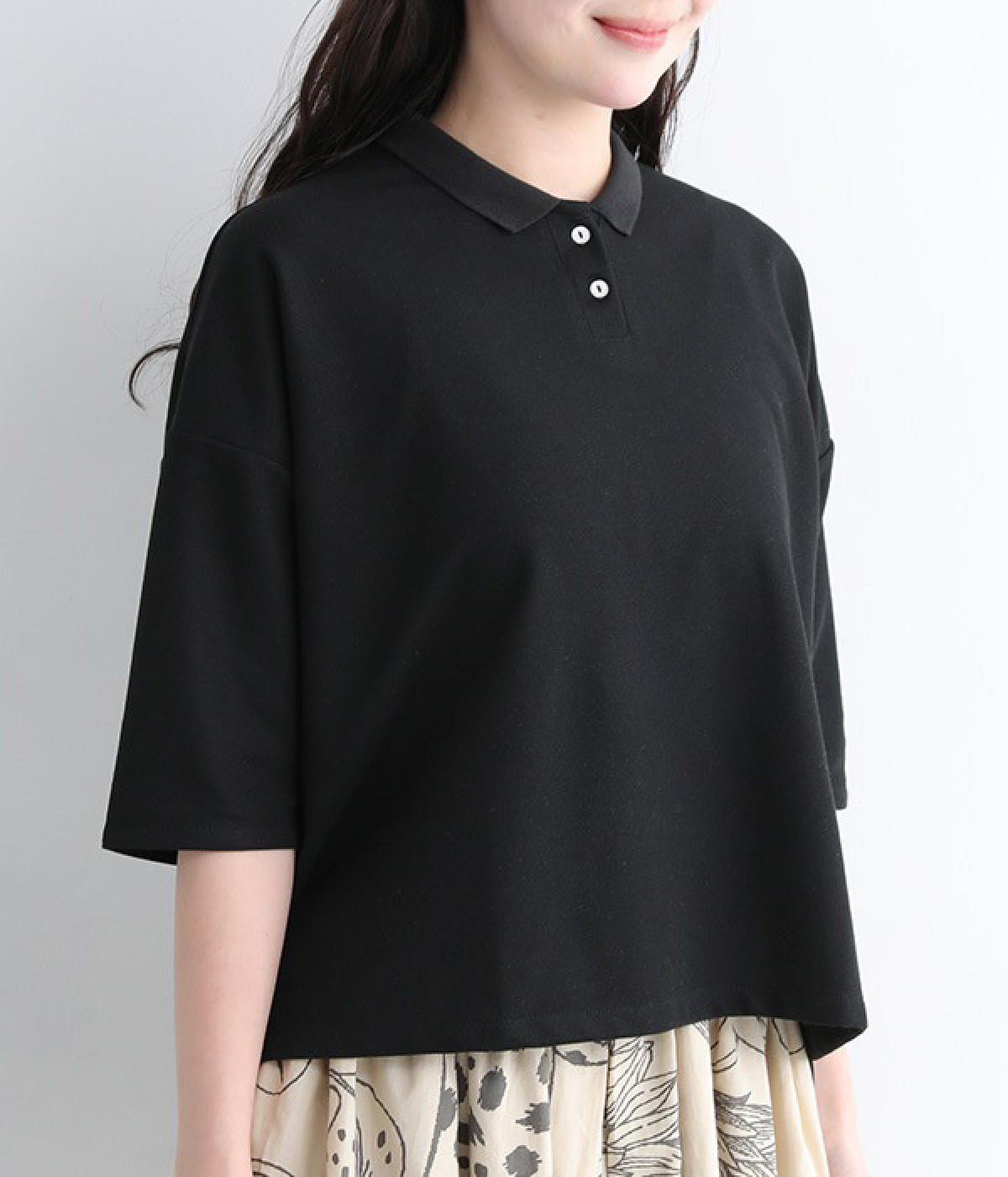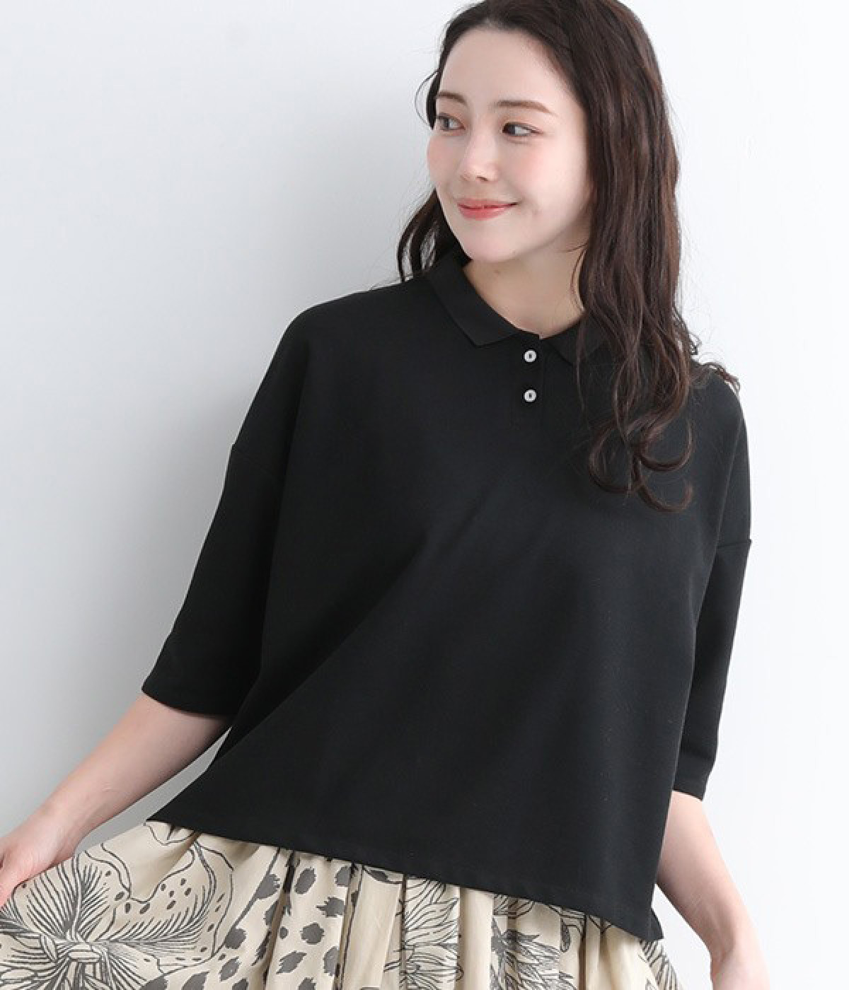 とてもなめらかなタッチのハニカム組織で編み立てたポロシャツ。ボタンの数を控えめにし、袖丈もやや長めにとってオリジナリティを高めました。ワイドな身幅&コンパクトな着丈のボクシーシルエットでゆったりと着られるのも魅力。襟の形が小ぶりなのでスポーティーな雰囲気になりにくく、普段のスタイリングにスッと溶け込みます。