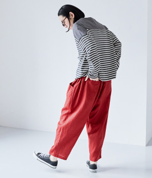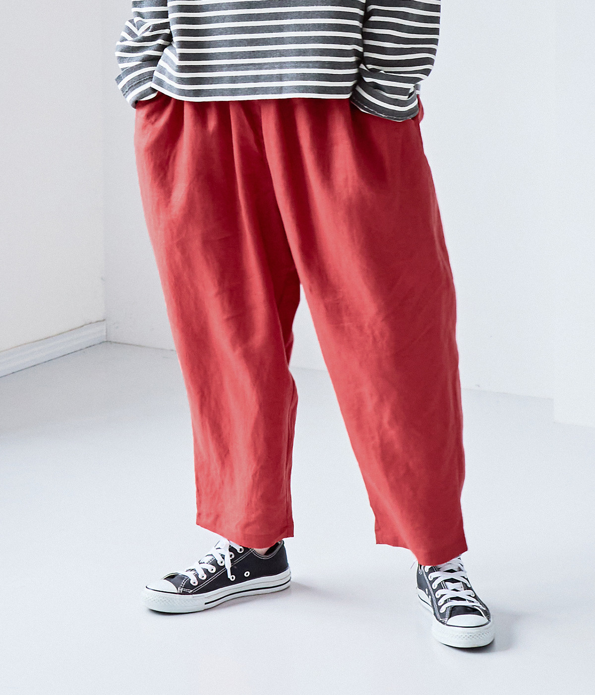 腰まわりにたっぷりゆとりを持たせつつ、股下から裾にかけて細くなるテーパードシルエットで、すっきり見えを叶えます。
