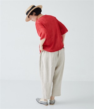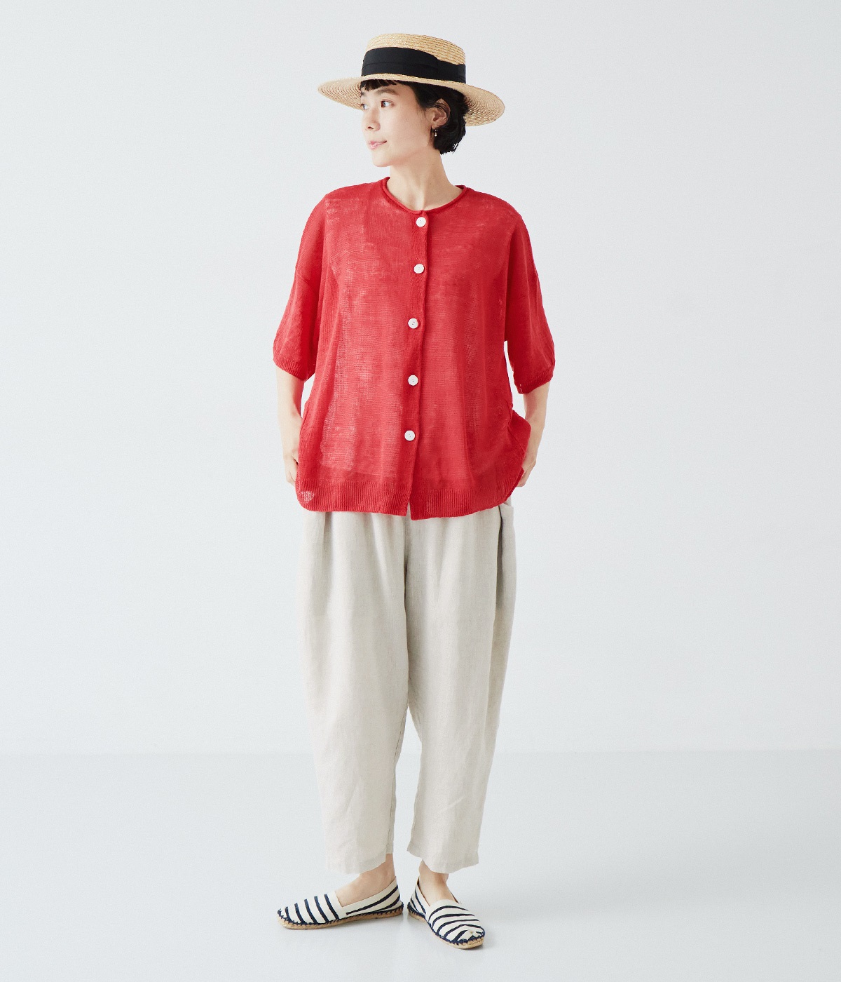 リネンの風合いをより感じられる <ナチュラル>。華やかな赤のサマーカーディガンを合わせれば、メリハリのある上品な佇まいに。