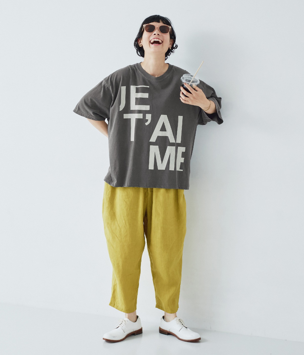 見ているだけで明るい気分にしてくれる<イエロー>。やわらかな素材感で、普段の装いにも溶け込みます。旬のロゴTシャツを合わせれば、夏らしいアクティブなコーディネートが完成。