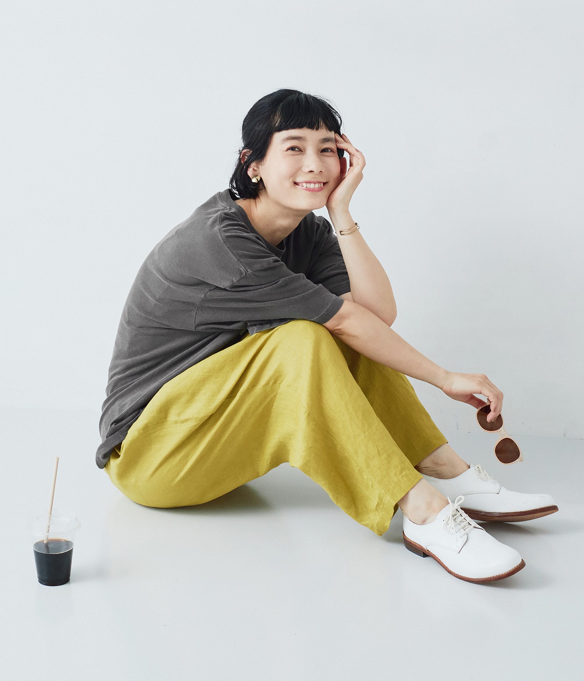 Tシャツ合わせのカジュアルスタイルも、リラックス感のあるシルエットでどこかこなれた雰囲気にまとまります。
