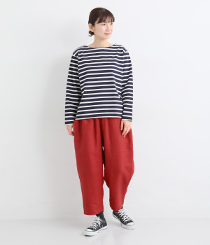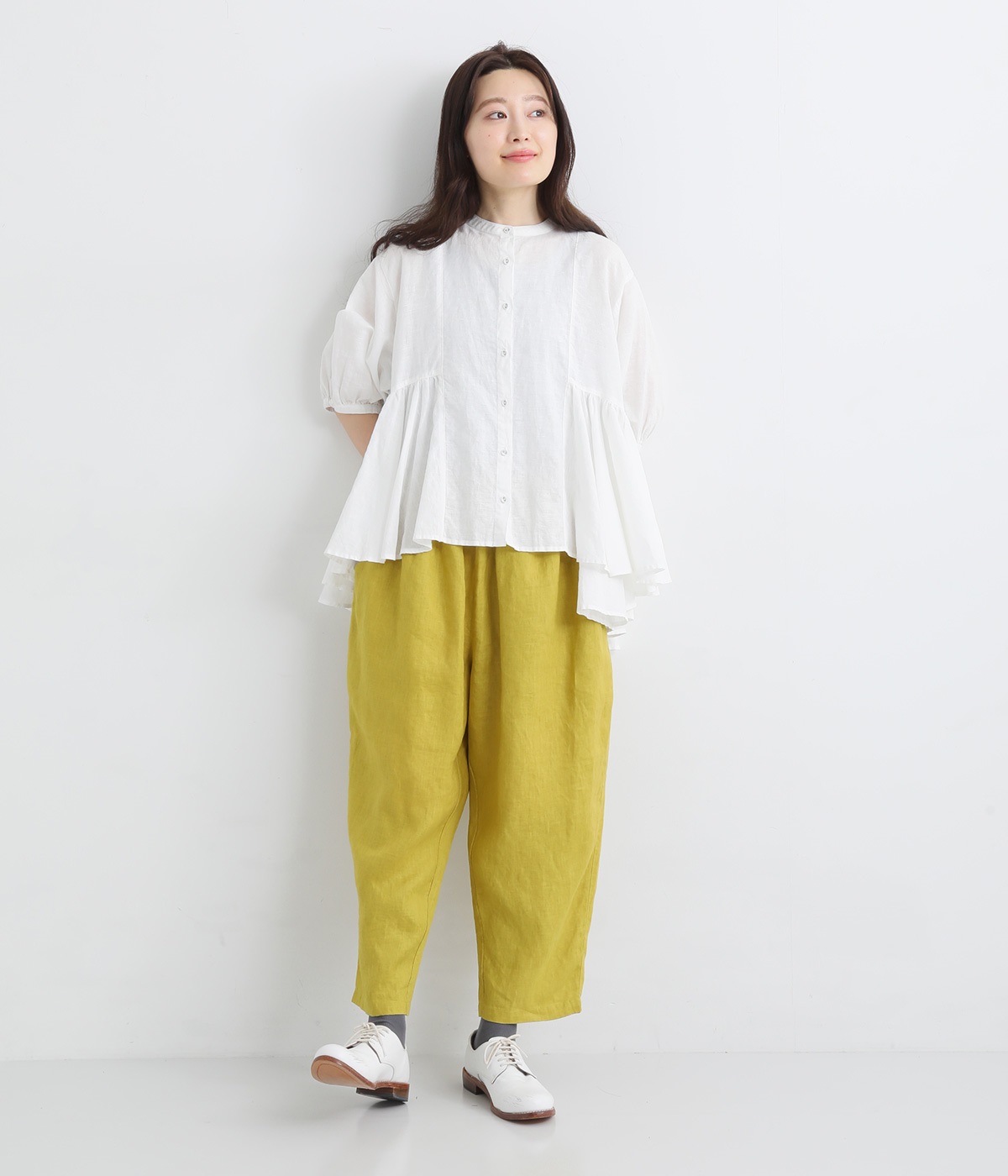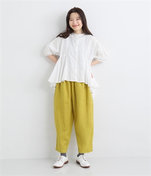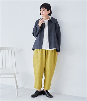 ふんわりとした愛らしいフォルムが、ほんのりラフさを加えます。おなか周りや腰周りなど、気になる部分をさりげなくカバーする深めの股上も大人にうれしいデザインです。