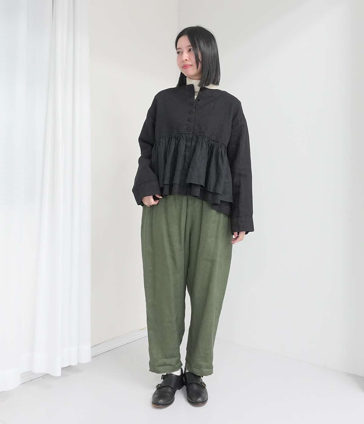 平織りリネンの光沢が映える<ブラック>は、どんなアイテムとも好相性。ブラウスやカーディガンを合わせた、きちんと感のあるスタイルも素敵に決まります。