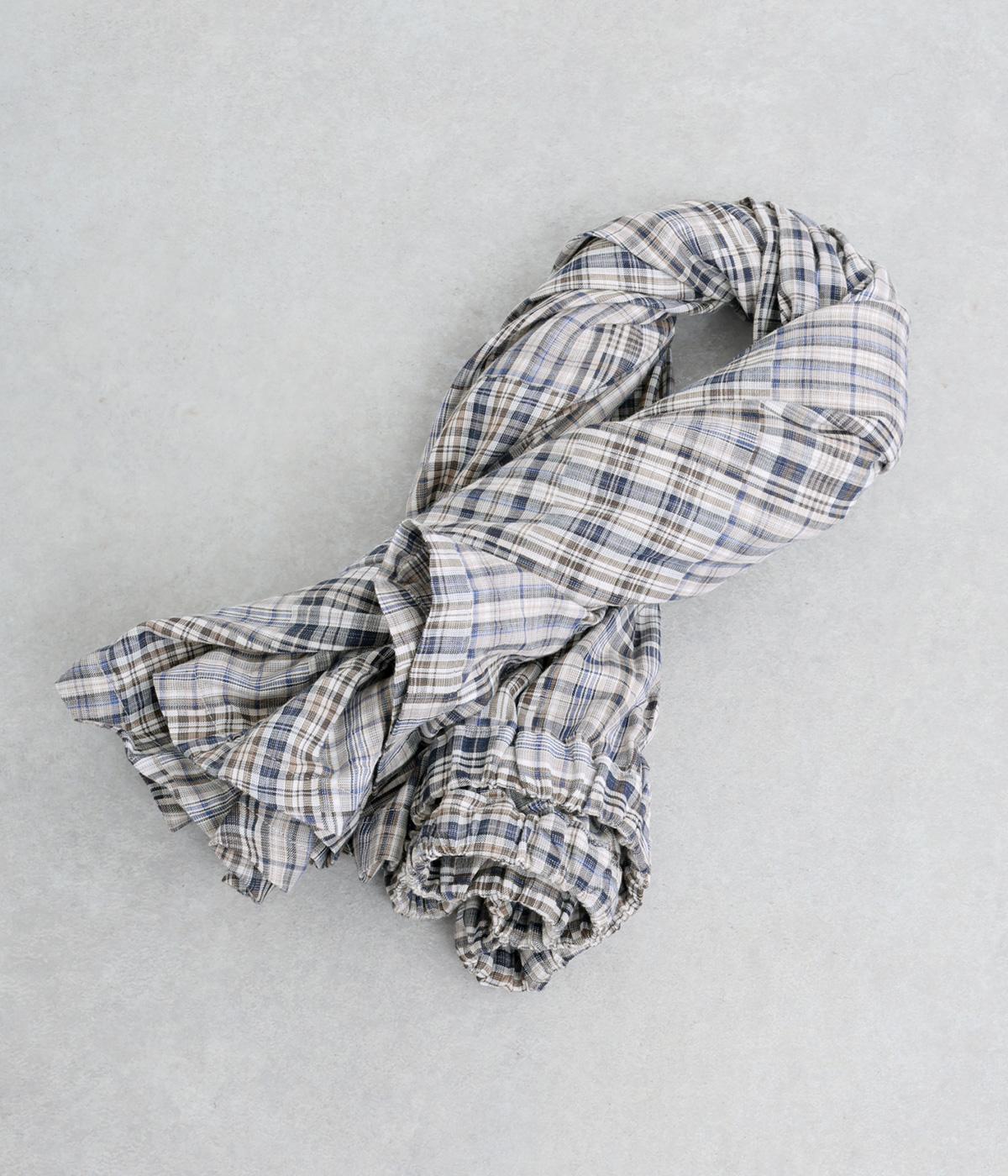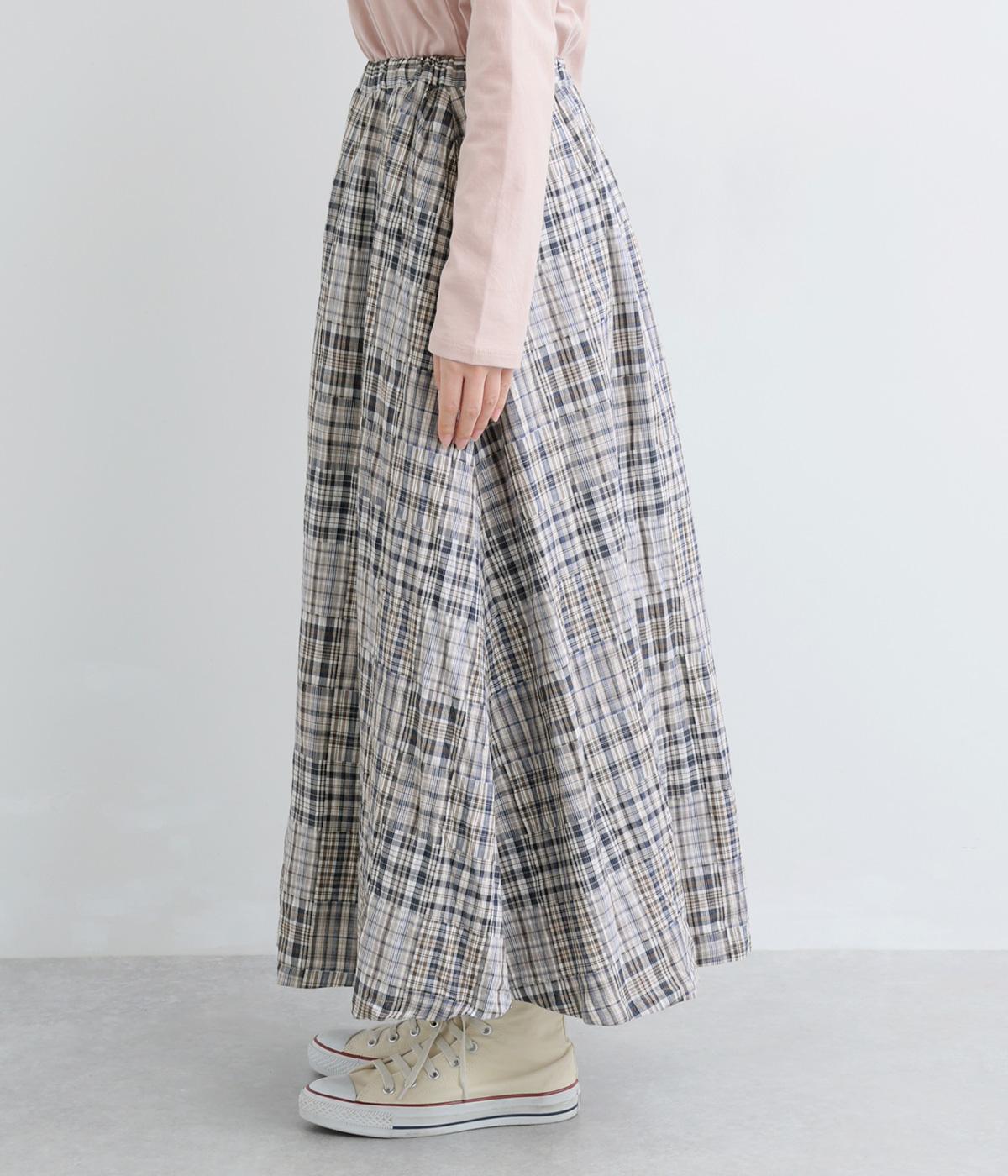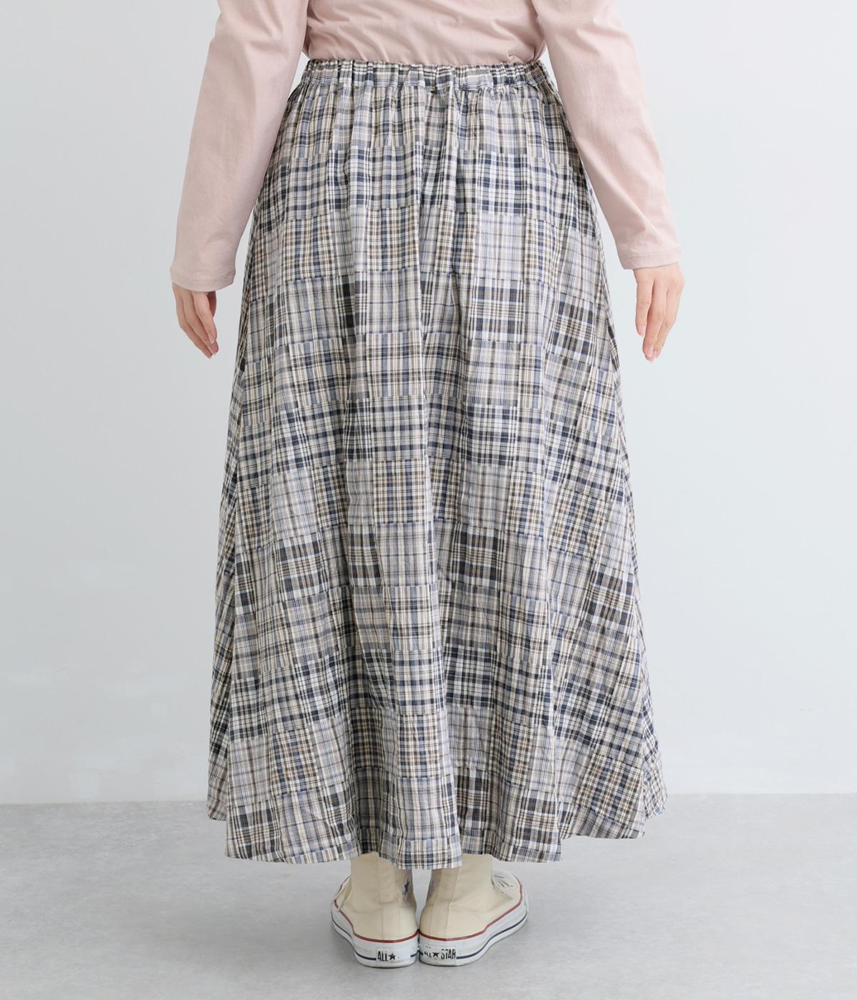 パッチワークの細かいチェック柄が目を引くギャザースカート。ふわりと揺れる軽やかさが魅力です。淡いトーンとナチュラルな風合いで優しい印象を与えてくれます。