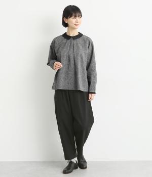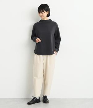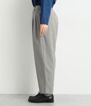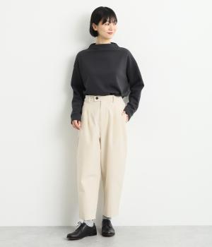 タックでワタリ幅をゆったり取り、裾に向かってすっきりとしたシルエットに仕立てました。ベルトまわりのデザインを活かしたトップスインの装いもおすすめ。前ファスナーで脱ぎはきしやすく、ウエスト後ろゴムでフィット感も◎。