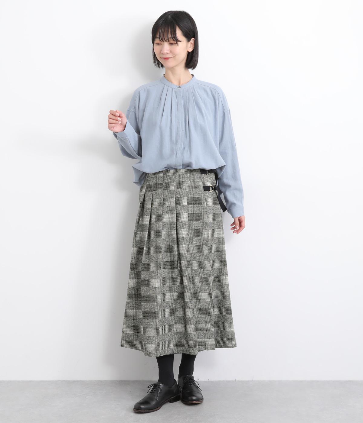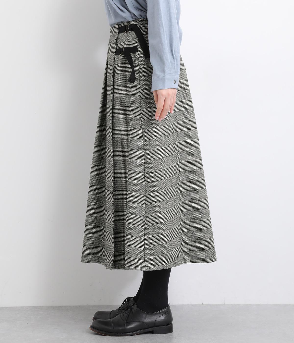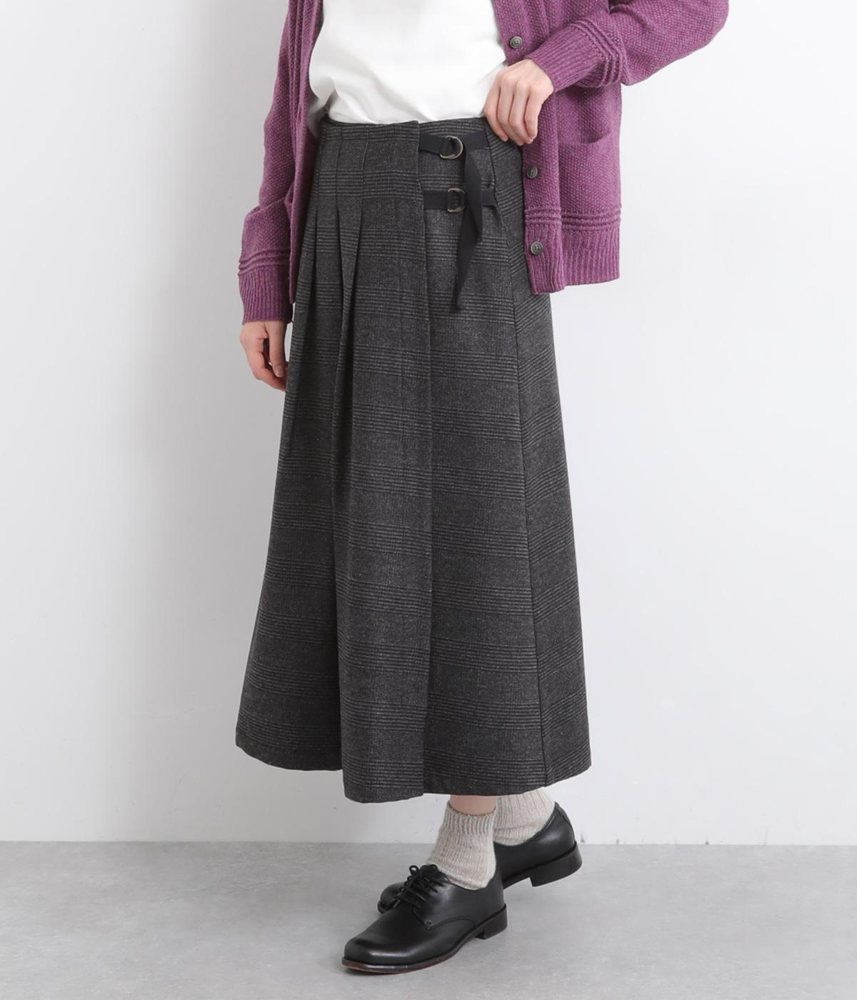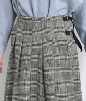 バックルベルトで調整できる、クラシカルな雰囲気のラップスカート。前面に入れたタックが、きれいなドレープを描きます。ウエストはボタン留めで、内側にもボタン付きタブを配しているため、着用時も安定感のあるつくりです。