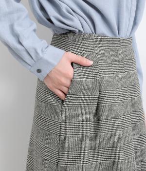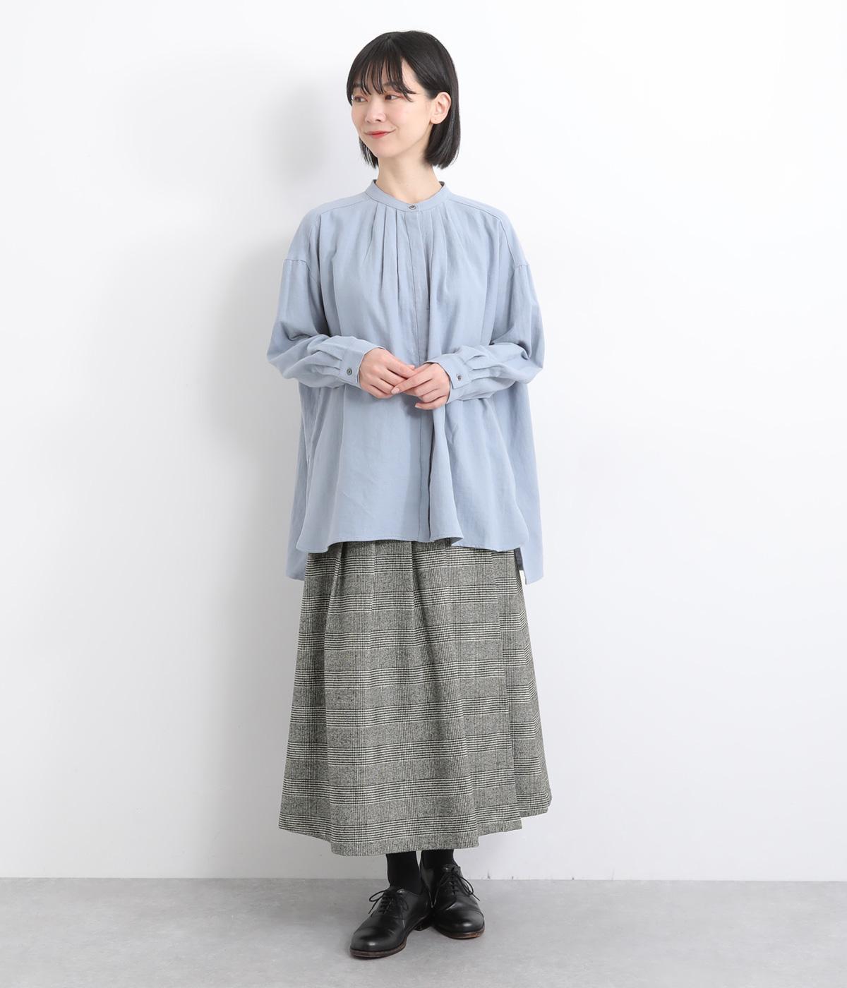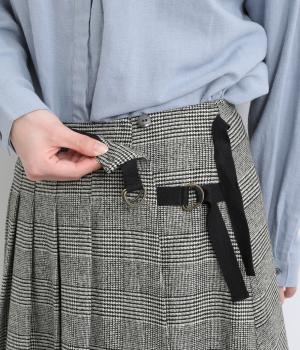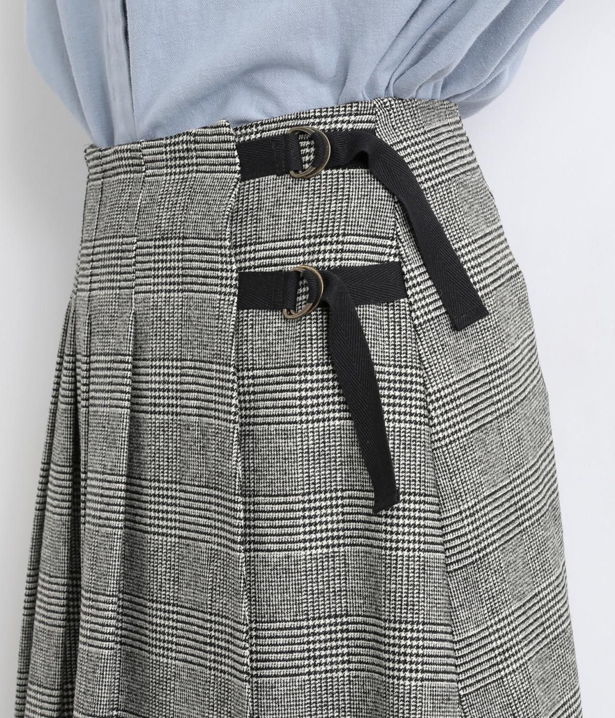 バックルベルトで調整できる、クラシカルな雰囲気のラップスカート。前面に入れたタックが、きれいなドレープを描きます。ウエストはボタン留めで、内側にもボタン付きタブを配しているため、着用時も安定感のあるつくりです。