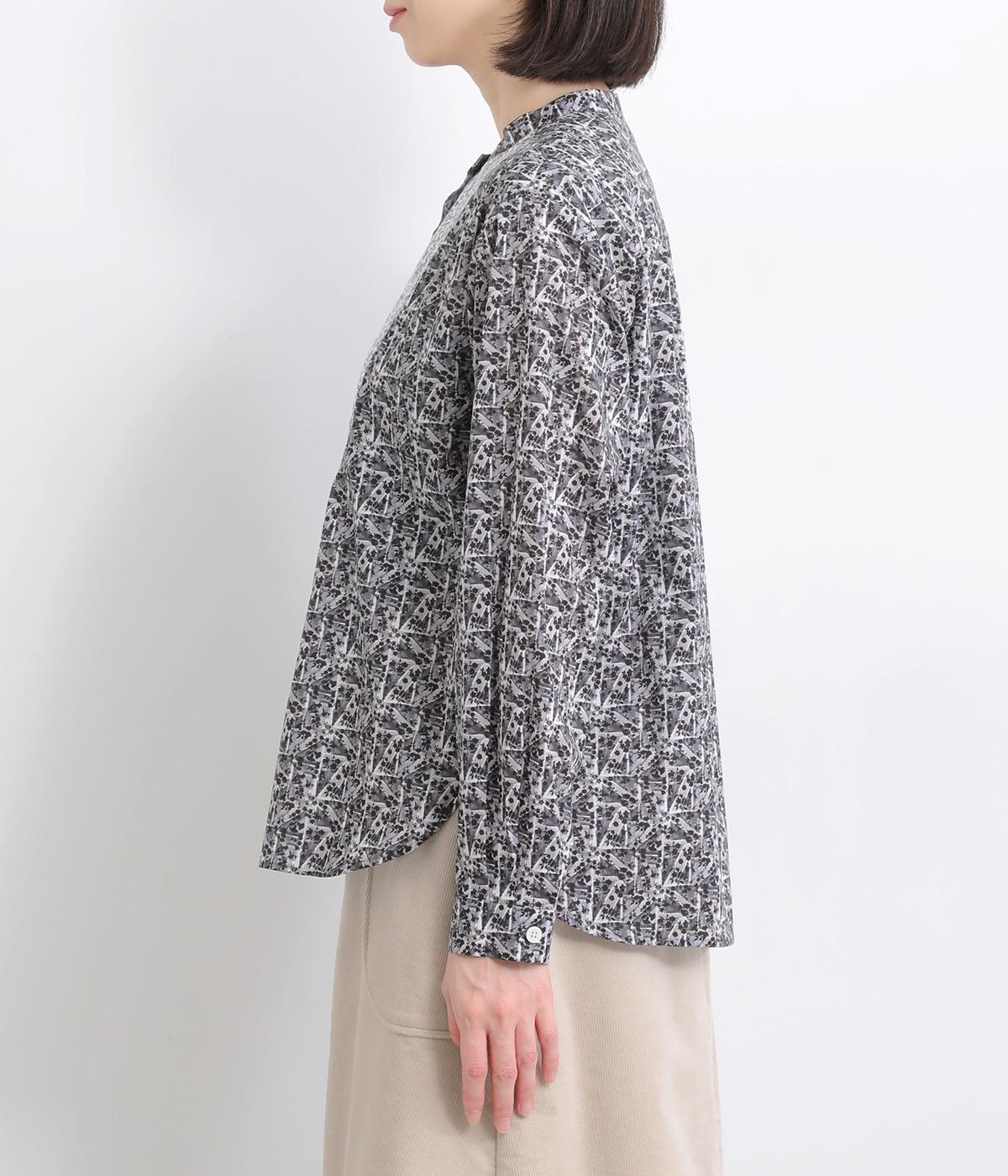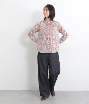 鮮やかなリバティプリントが目を惹くブラウス。フロントのヨーク切り替えは別柄をチョイスしてデザイン性もアップ。着こなしの主役になる存在感があり、サロペットのインに着たり、羽織り物を合わせたり、チラ見せ要素としても活躍します。
