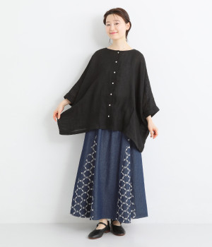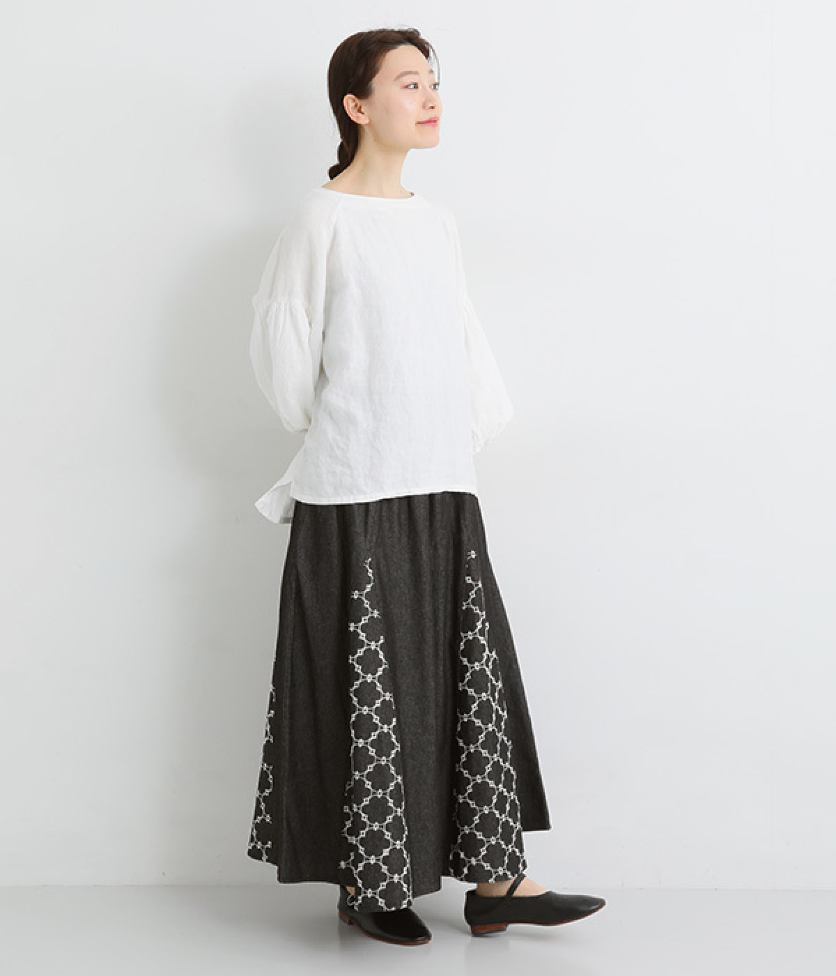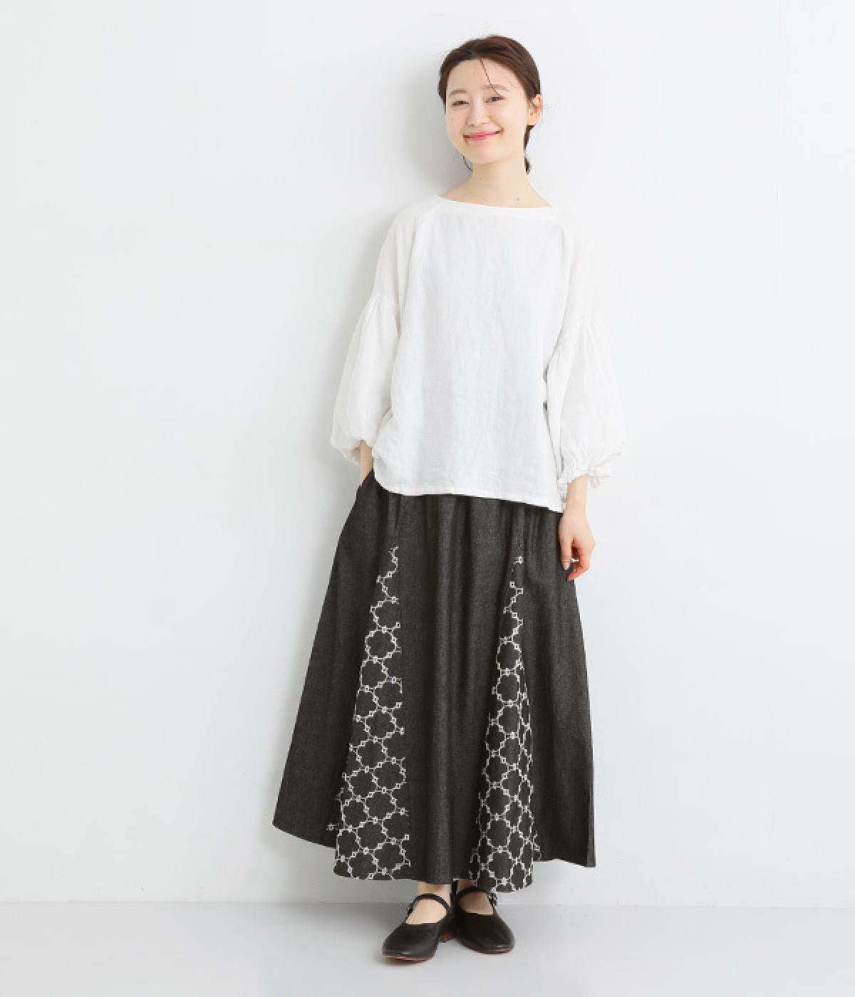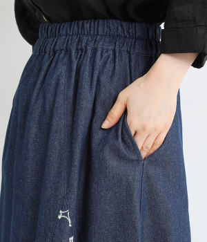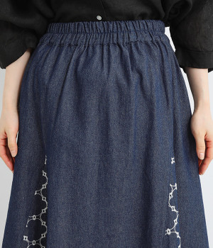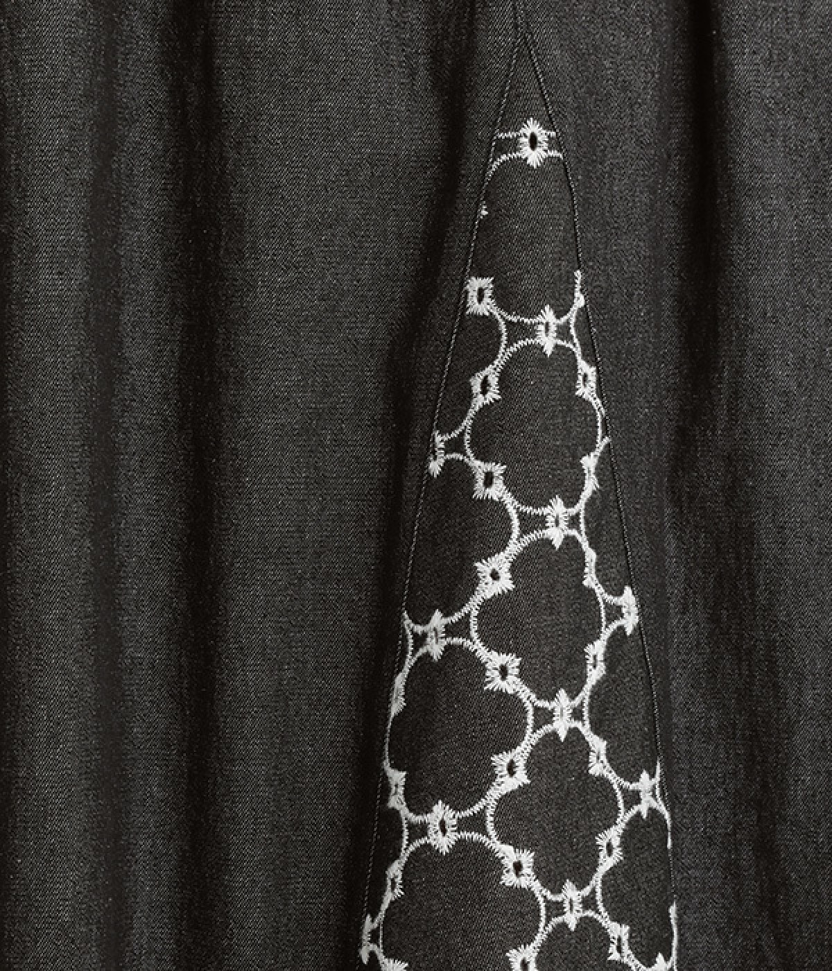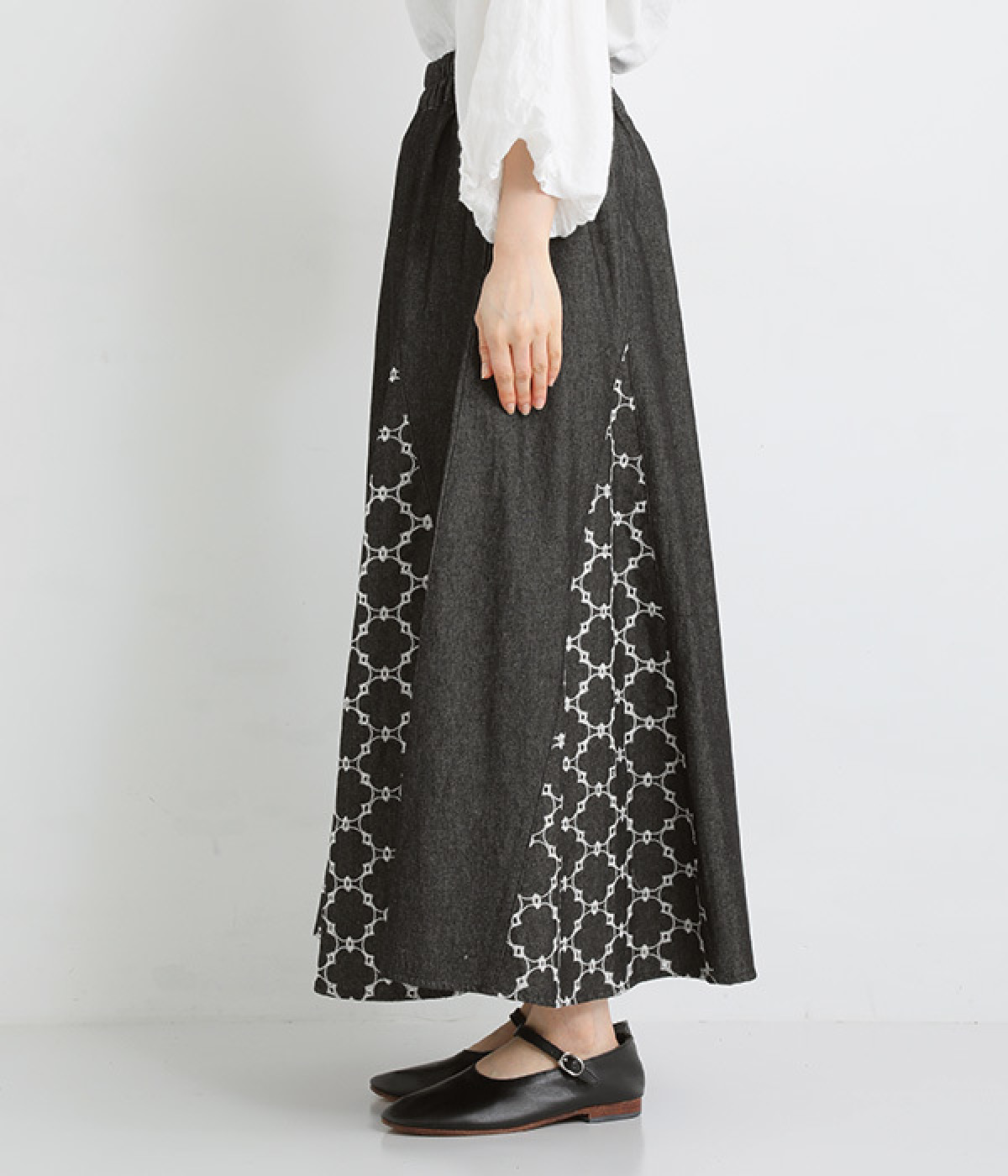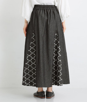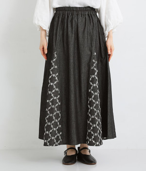 デニムと刺しゅう生地のパネル切り替えでりコーディネートをおしゃれに演出、メリハリのあるデザインなのですっきりと着こなせます。きれいに広がるフレアシルエットが大人の着こなしにマッチ。心地よくフィットする総ゴムウエストでリラクシーに。