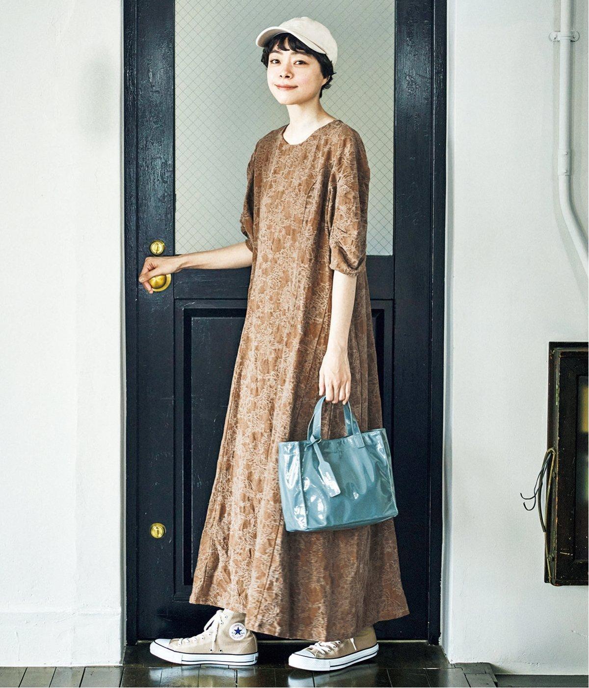 切り替えを入れて何枚も接ぎ合わせたフィット&フレアなシルエットにギャザーを寄せた袖が、クラシカルで優雅な印象。一枚着でスタイリングが完成する雰囲気のいいアイテムで、スニーカー合わせでカジュアルダウンさせても素敵。後ろボタンあきです。