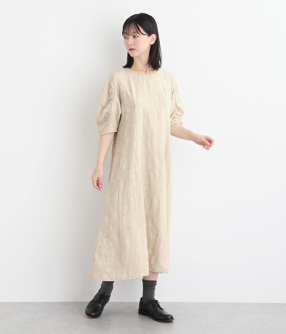コットンとリネンにレーヨンもまぜた、ナチュラルな風合いとやわらかな質感が魅力的な混紡生地です。花柄のジャカード織りが品よく目を惹きます。