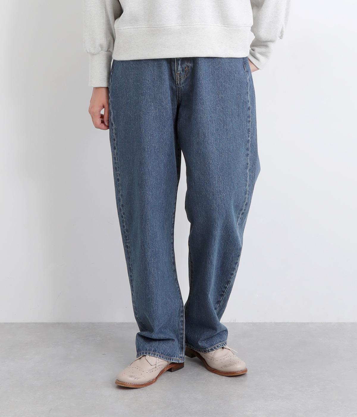 股上をしっかりと取ったリラックス感のあるテーパードデニムパンツ。前ファスナーで脱ぎはきしやすく、ワイドなサイズ感は後ろウエストのゴムでベルト要らずで着用できます。長めに設定してた股下サイズはロールアップがおすすめ。