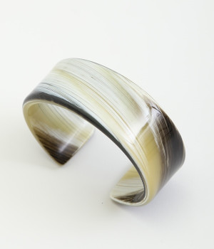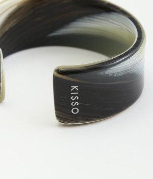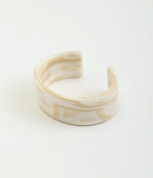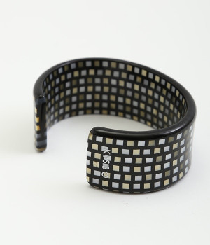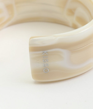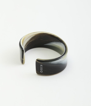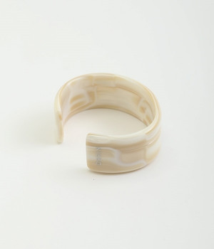 着こなしのアクセントとしてコーディネートに彩りを与えてくれるバングル。存在感を与える太めのデザインでも、フラットタイプなので品よく見せることができます。コットンを主原料としたセルロースアセテートでできた、軽量で肌なじみのいいアクセサリーです。熟練の職人が手作業で柄を組みあげ独特の模様を出し、さらに何層にも貼り合わせることで鮮やかな色に仕上げています。天然素材由来の材料のためアレルギーが少ないのもうれしいところ。