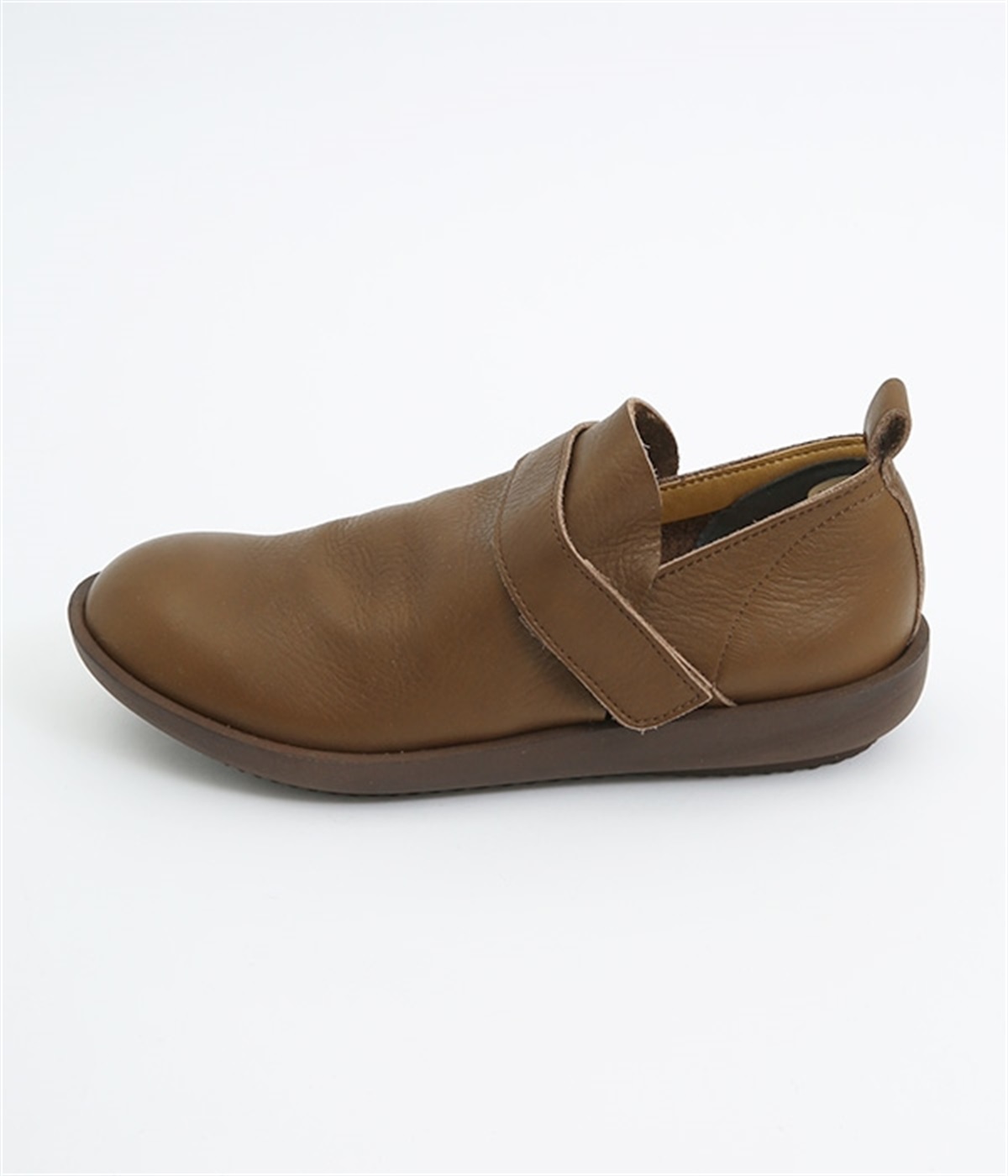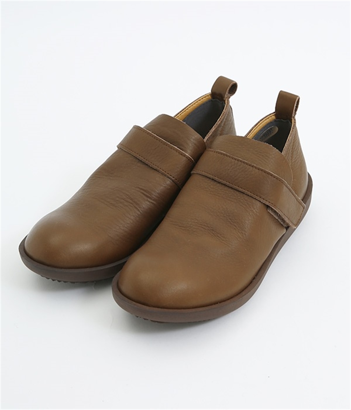 装飾を省いたシンプルな佇まいで使いやすいシューズ。はくほどに足にやさしくなじんでいく牛革素材を使用しています。アッパー部分には面ファスナーつきのベルトが備わり、甲高の方にも着用しやすいデザイン。足裏の形に寄り添う、心地良いクッション性を持つインソールも装備した気の利いたつくりです。靴ひもがなく足入れも簡単なのでデイリー使いに適しています。