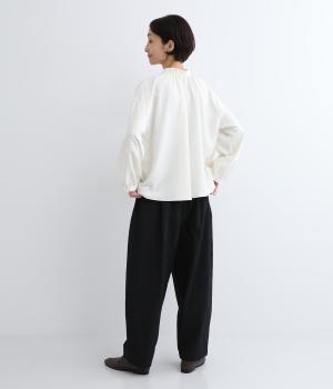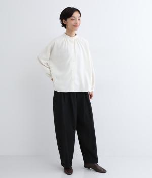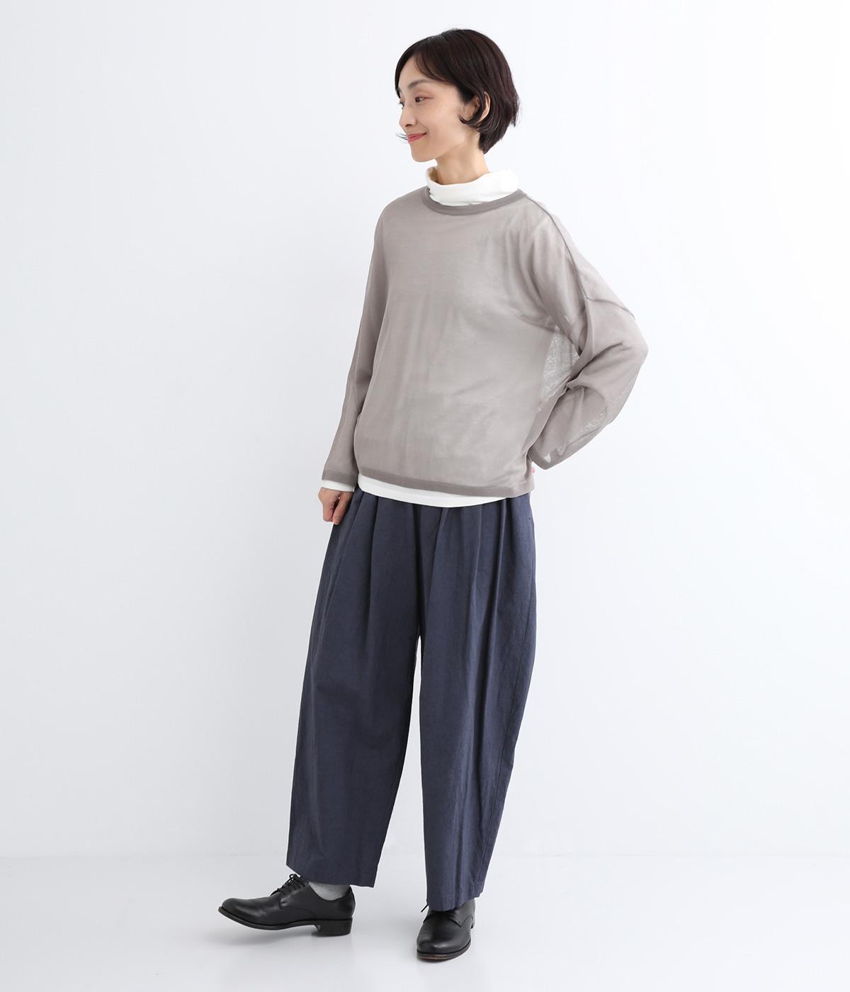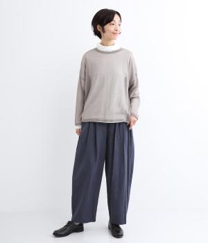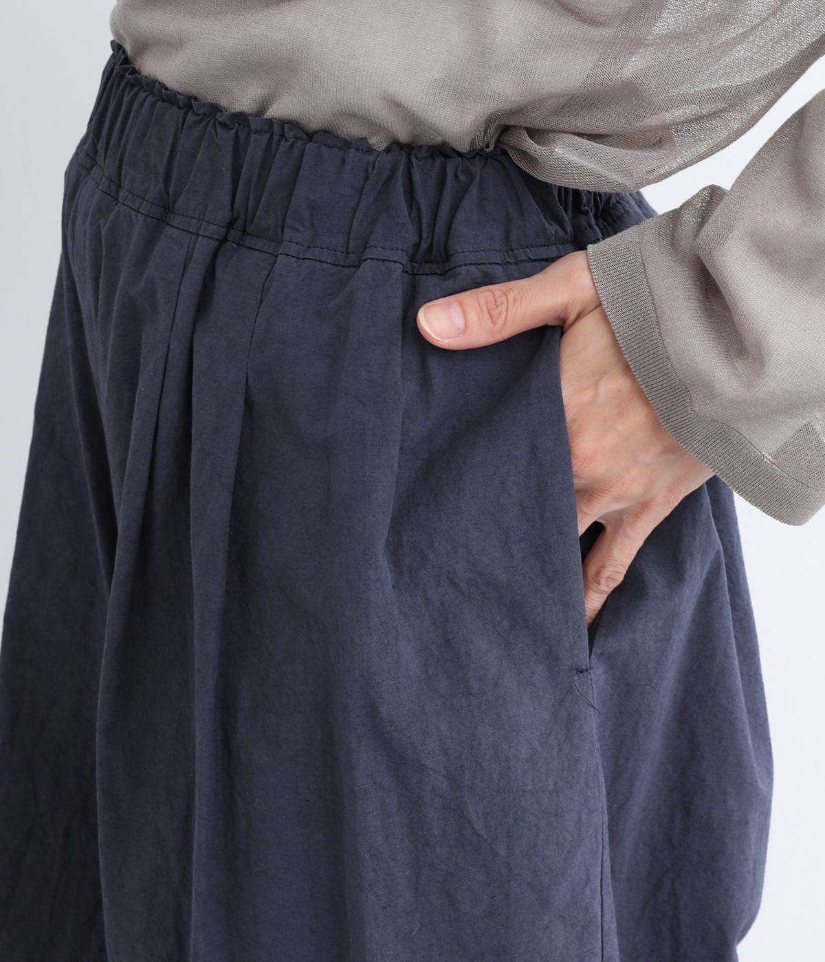 ウエストにタックをとり股上深めのゆったりとしたシルエットに仕上げたテーパードパンツ。裾に向かってきゅっと細くし、全体のバランスをすっきりと整えています。とても軽い生地感が足さばきのよさをアップ。ウエストはお腹まわりにやさしくフィットする総ゴム仕様です。