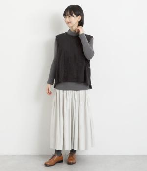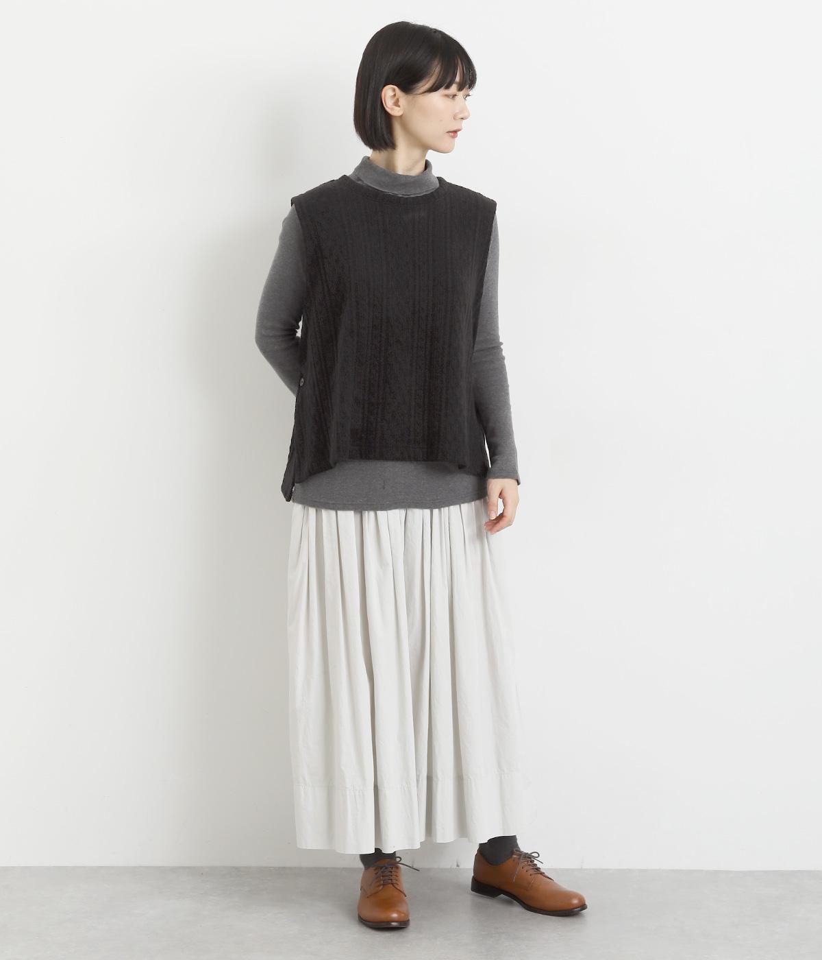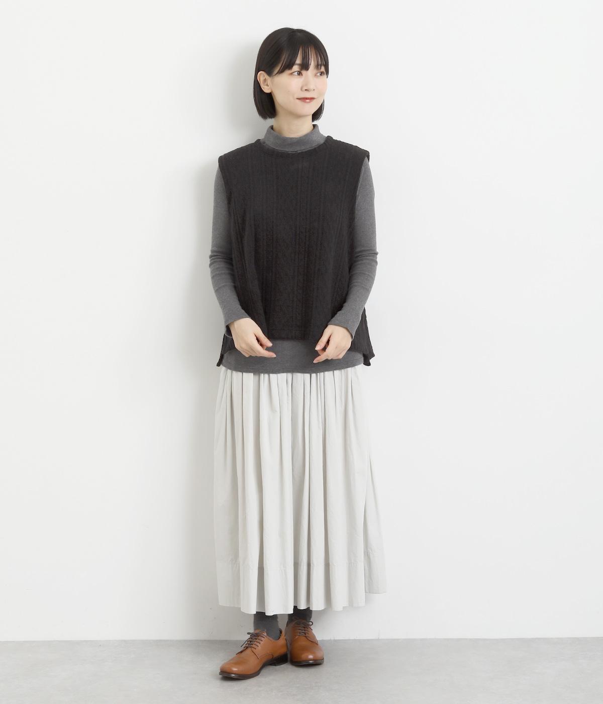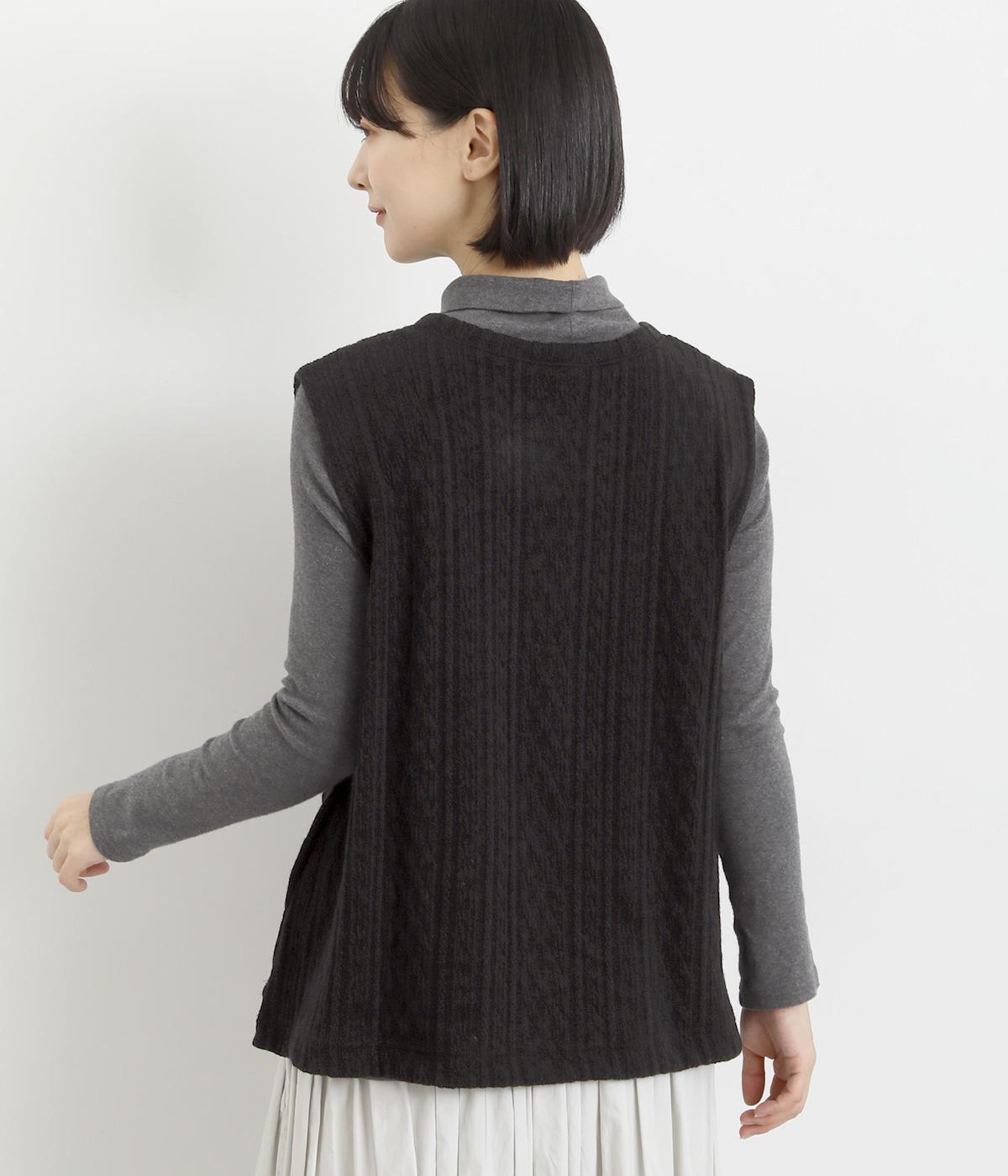 サイドにボタンをあしらい、スタイリングに合わせてあけ閉めできるベストです。ケーブル柄編みでさり気なく表情をつけつつ、アイテム合わせしやすいデザインに。アームホールも広く、ボリュームトップスとも好相性。
