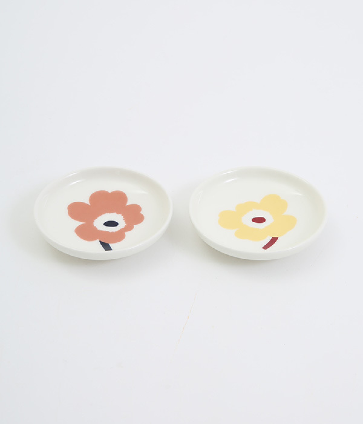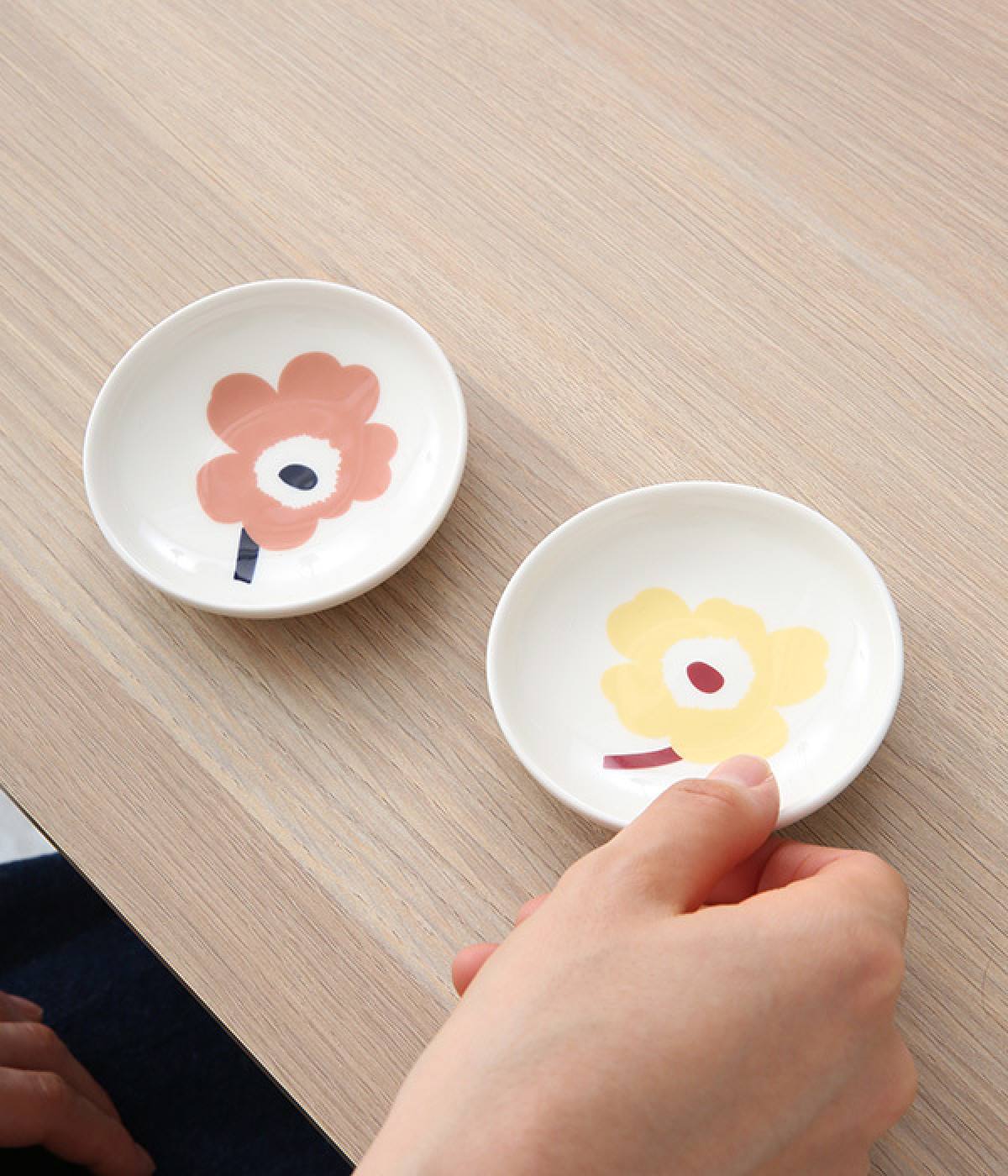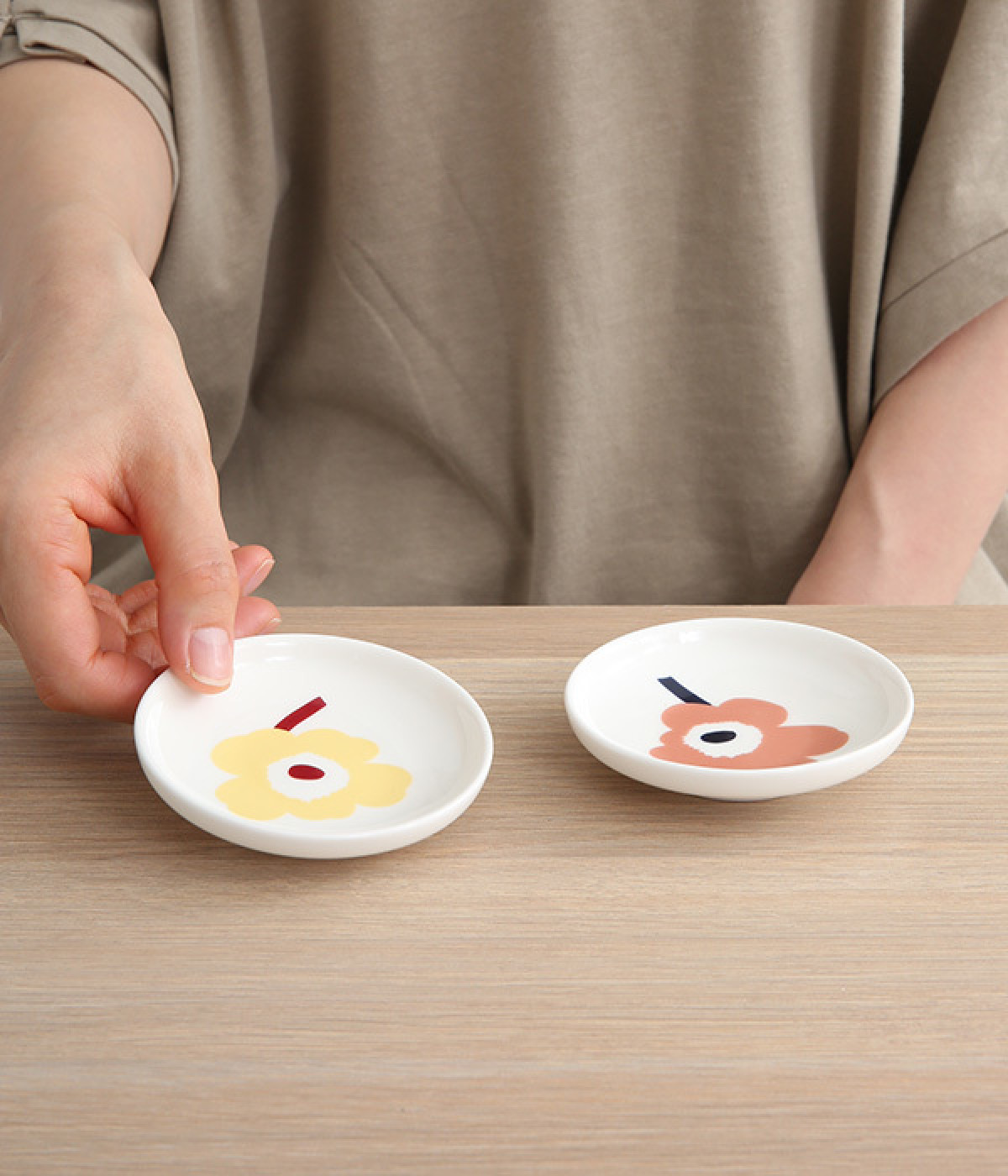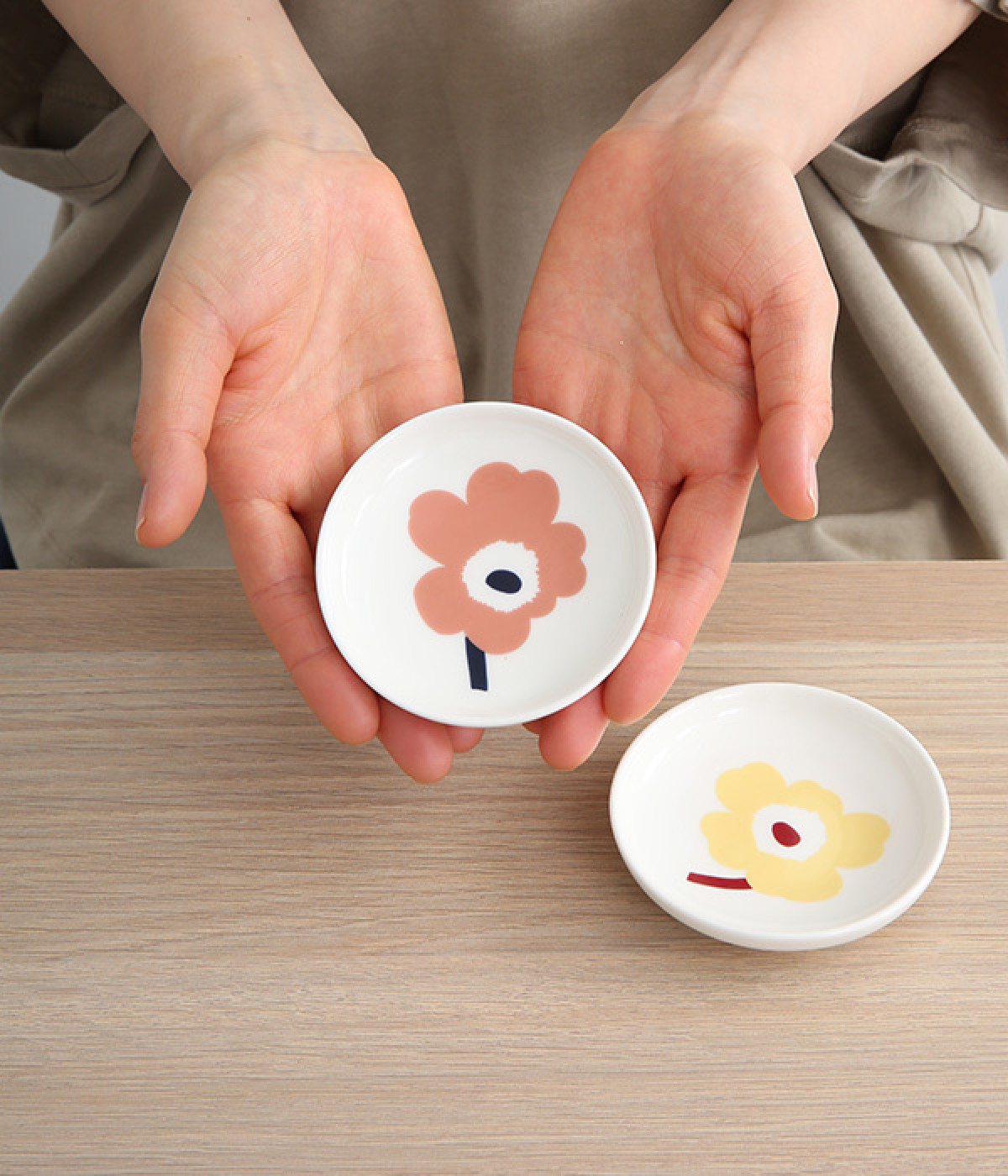 マリメッコを代表するウニッコ柄のプレート2点セット。北欧ブランドらしいやわらかな色合いに心も和みます。お茶タイムに添えるちょっとしたお菓子やデザート用に、またはおかずをちょこんと乗せる豆皿としても重宝するコンパクトなサイズ感。少し立ち上がった縁のおかげで、食べ物をしっかり受け止めてくれる使い勝手のよさも魅力です。愛らしい柄を活かし、インテリアとして飾ったり小物置きにしたりと、さまざまな使い方が楽しめます。