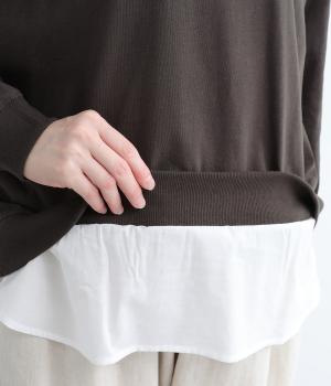裾から布帛をのぞかせてシャツをレイヤードしているようなフェイクデザインが特徴。カジュアルに着こなしやすくもお洒落なスタイリングを叶える優秀な一枚。布帛は裾部分のみについているのでもたつくことなく快適に着用できます。