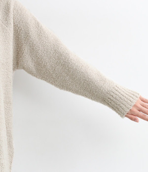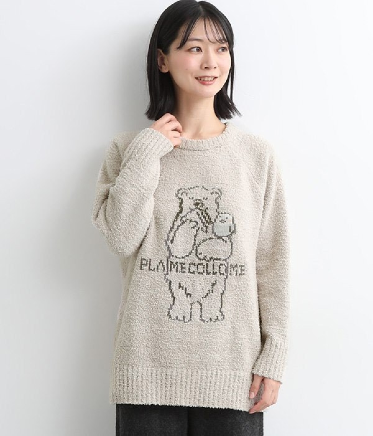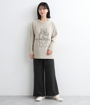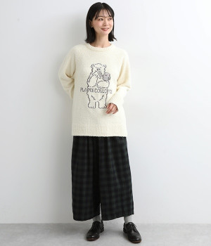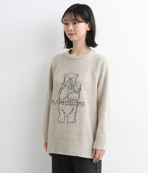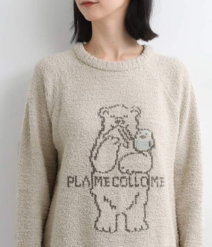 もこもこのモールニットで仕立てた、触り心地抜群のニットプルオーバー。くまのキャラクター「メルるん♪」にコトリが乗ったデザインがほっこりとした気分にしてくれます。モールニットがやさしく体をあたため、寒い季節のルームウェアに最適。肩が動かしやすいラグランスリーブでおやすみ時間も心地良く過ごせます。
