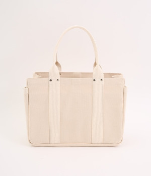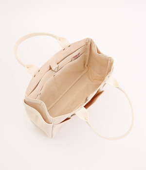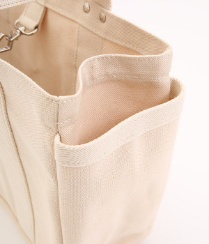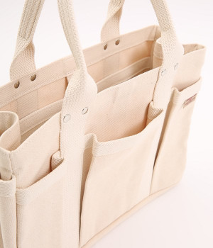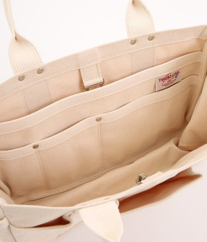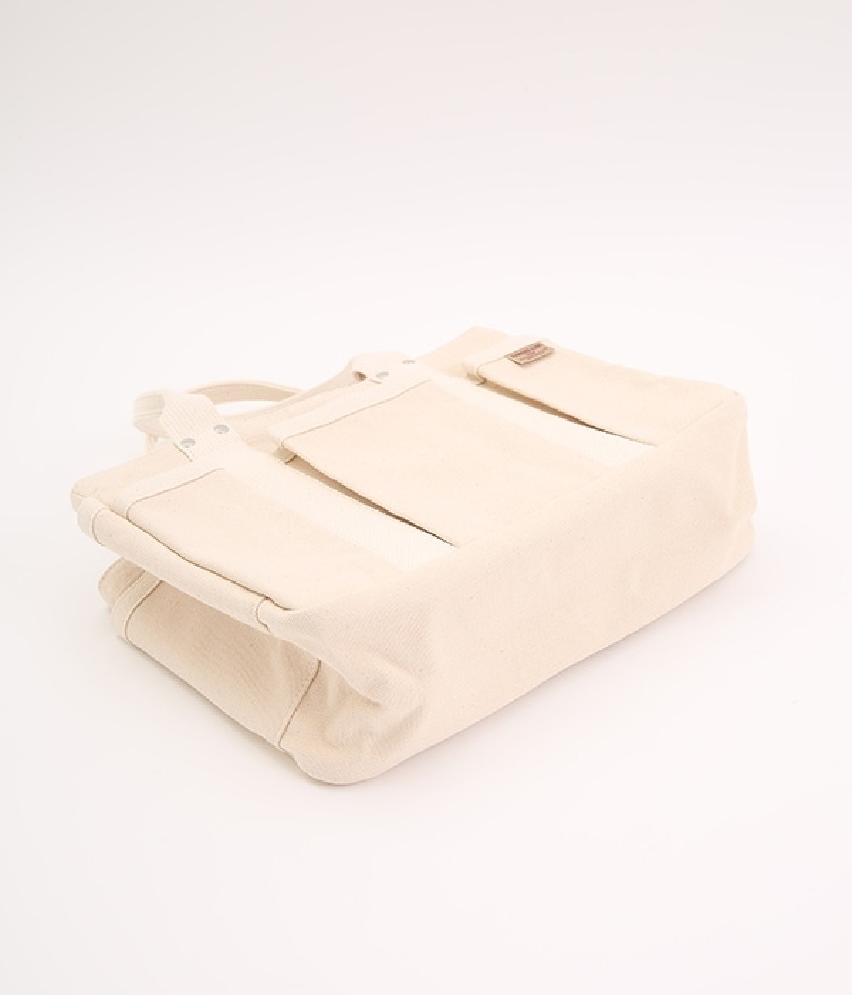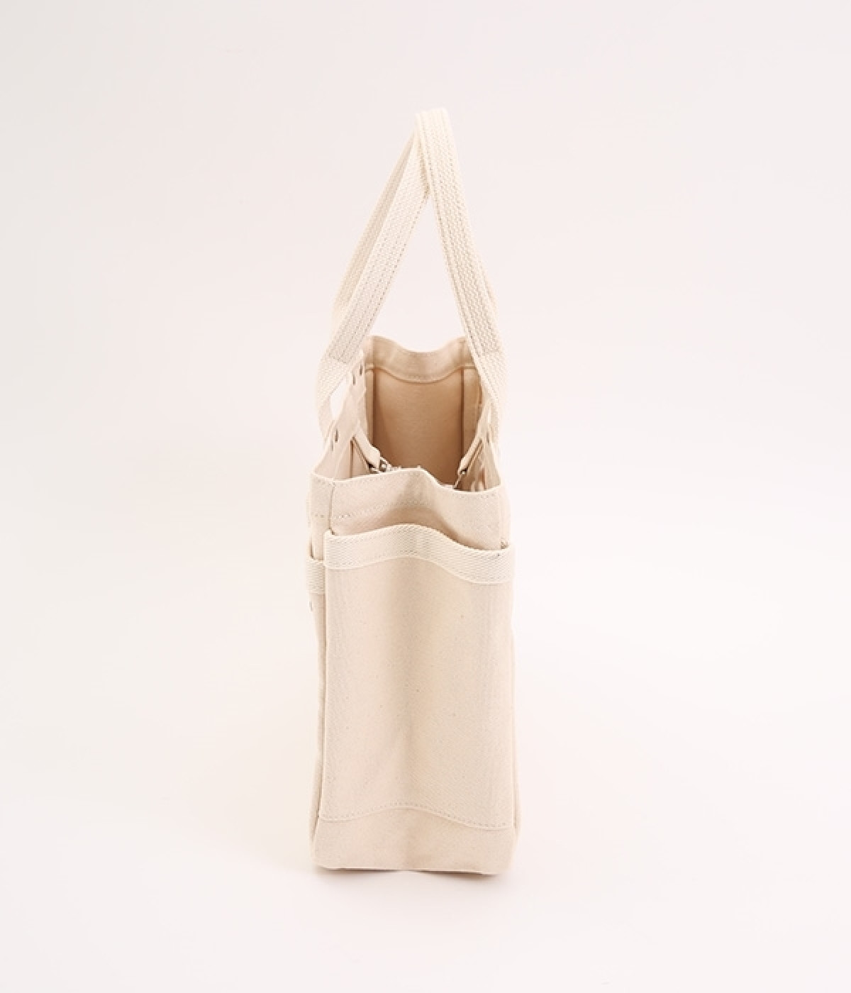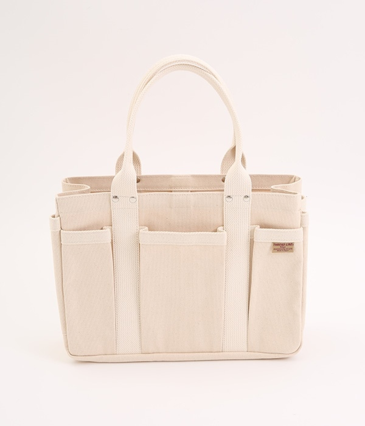 岡山県の厚手6合帆布を使用したトートバッグ。しっかりとしたキャンバスで、お買い物からアウトドアまで多岐にわたって重宝するアイテムです。外側にポケットが5箇所あり、小物を小分け収納したり、すぐに出し入れしたいものを入れたりするのにとても便利。A4サイズ収納可能、マチもとってあるので、ざくざくと荷物を入れていただけます。