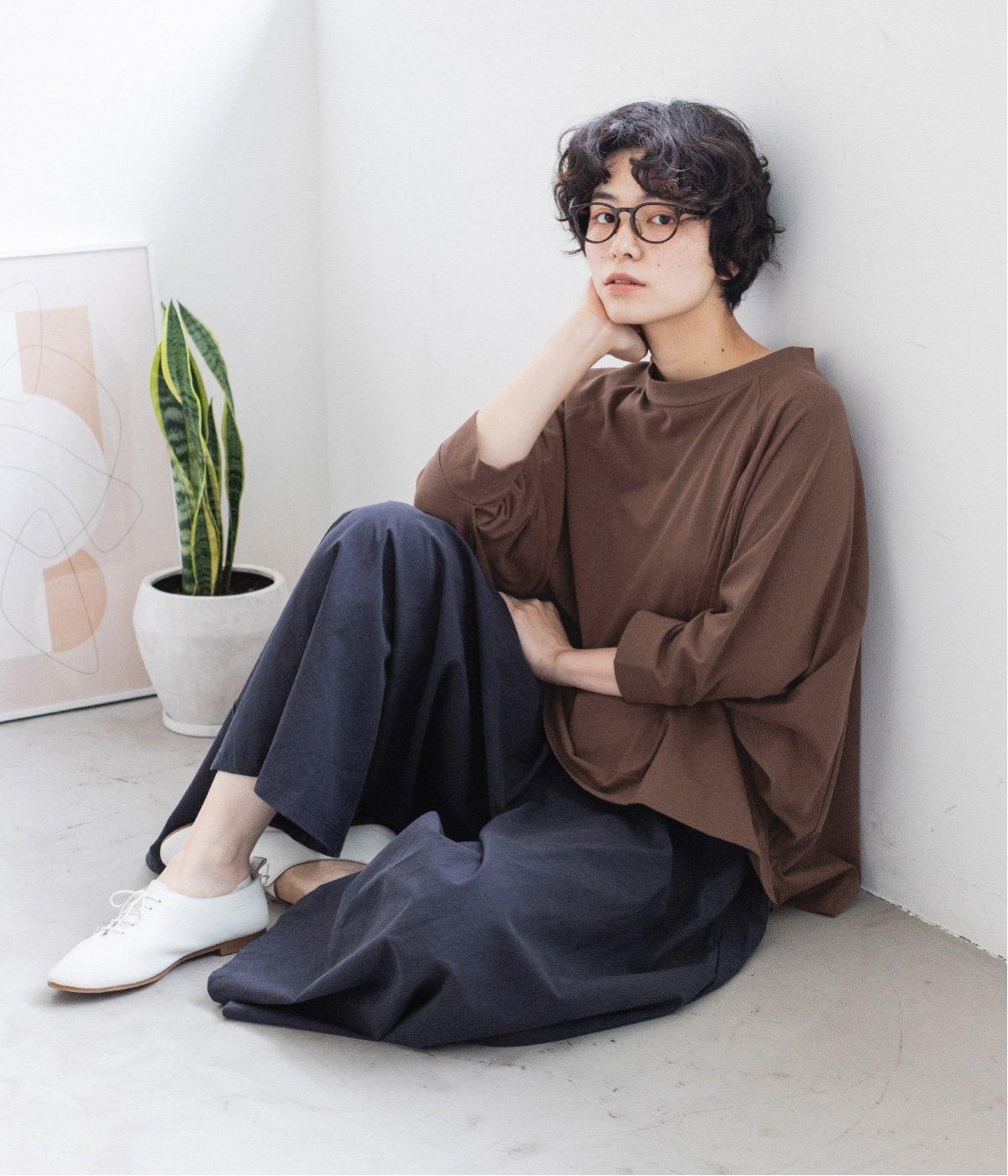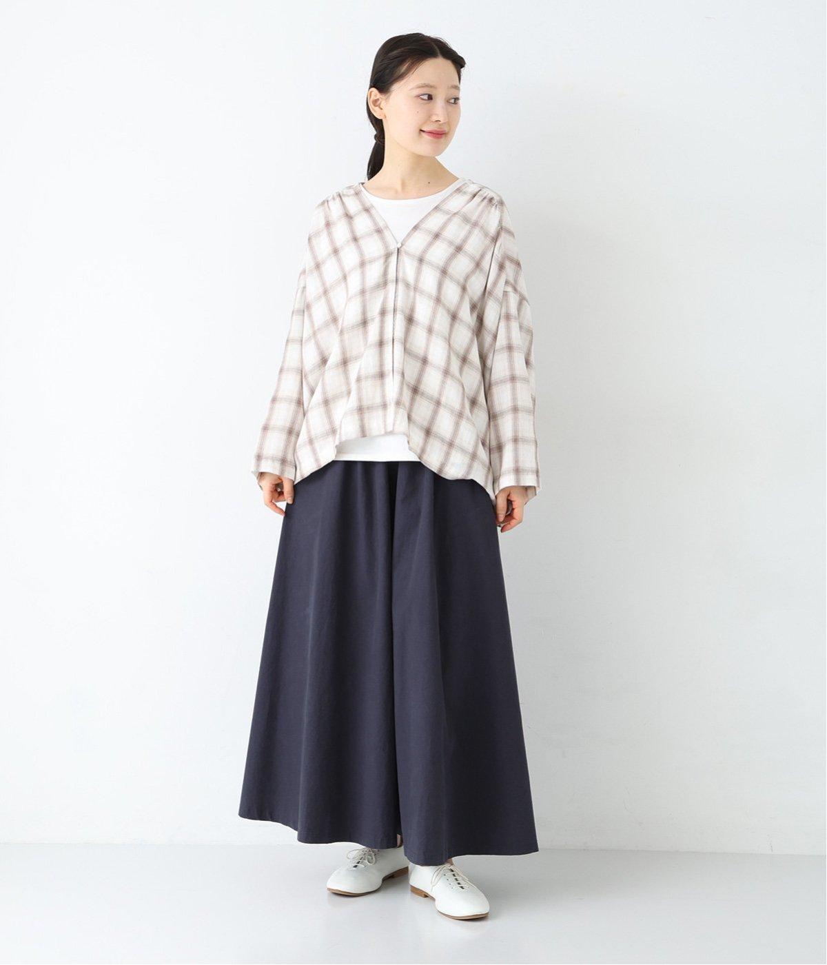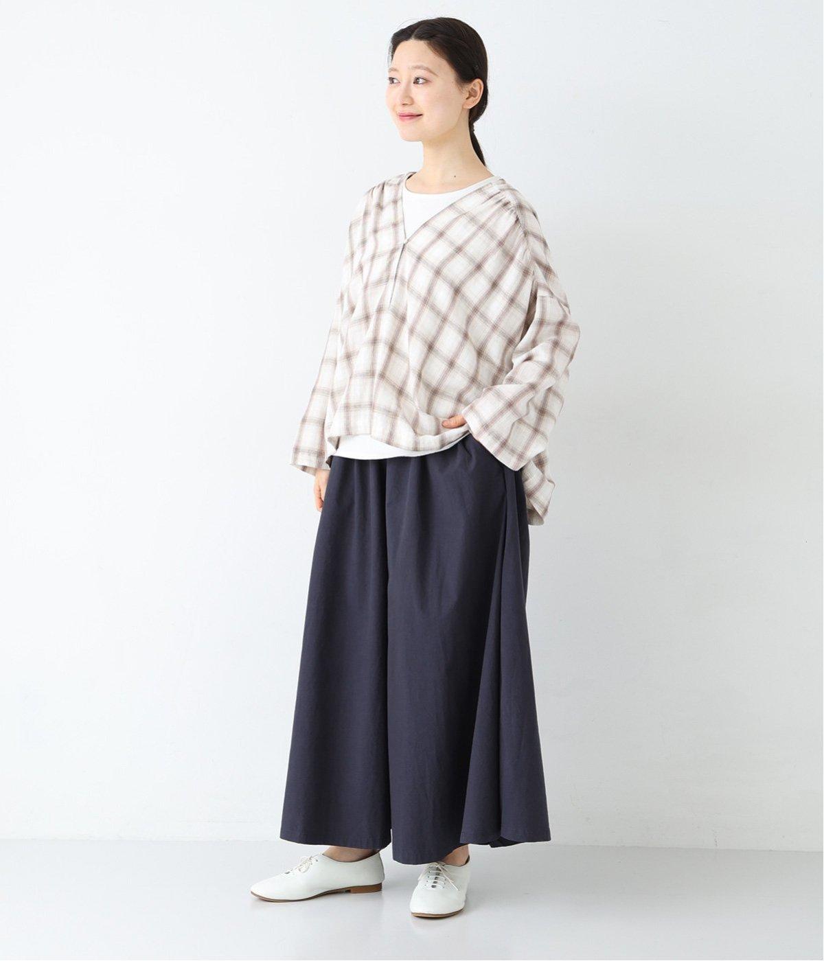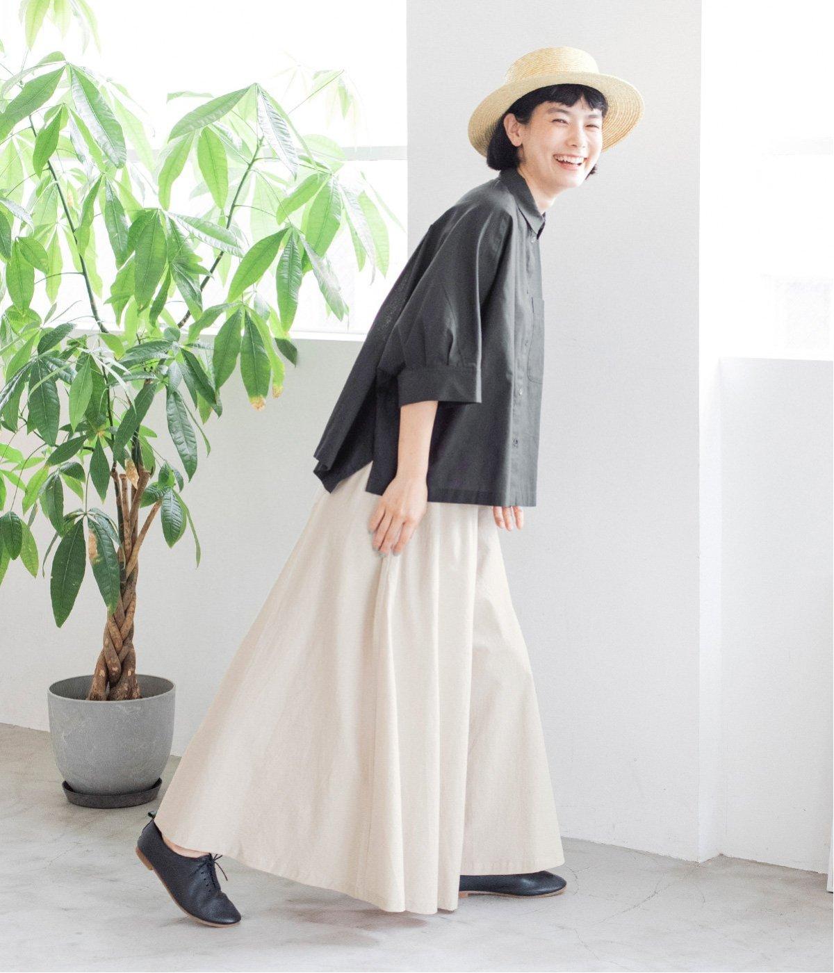 装いに軽さを添える明るめのグレージュは、チャコールのブラウスとシックにまとめました。風をはらむワイドシルエットながら、広がりすぎずストンと落ちるラインが美しく、大人の余裕を感じさせる着こなしです。