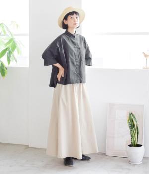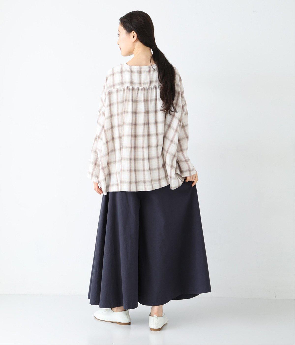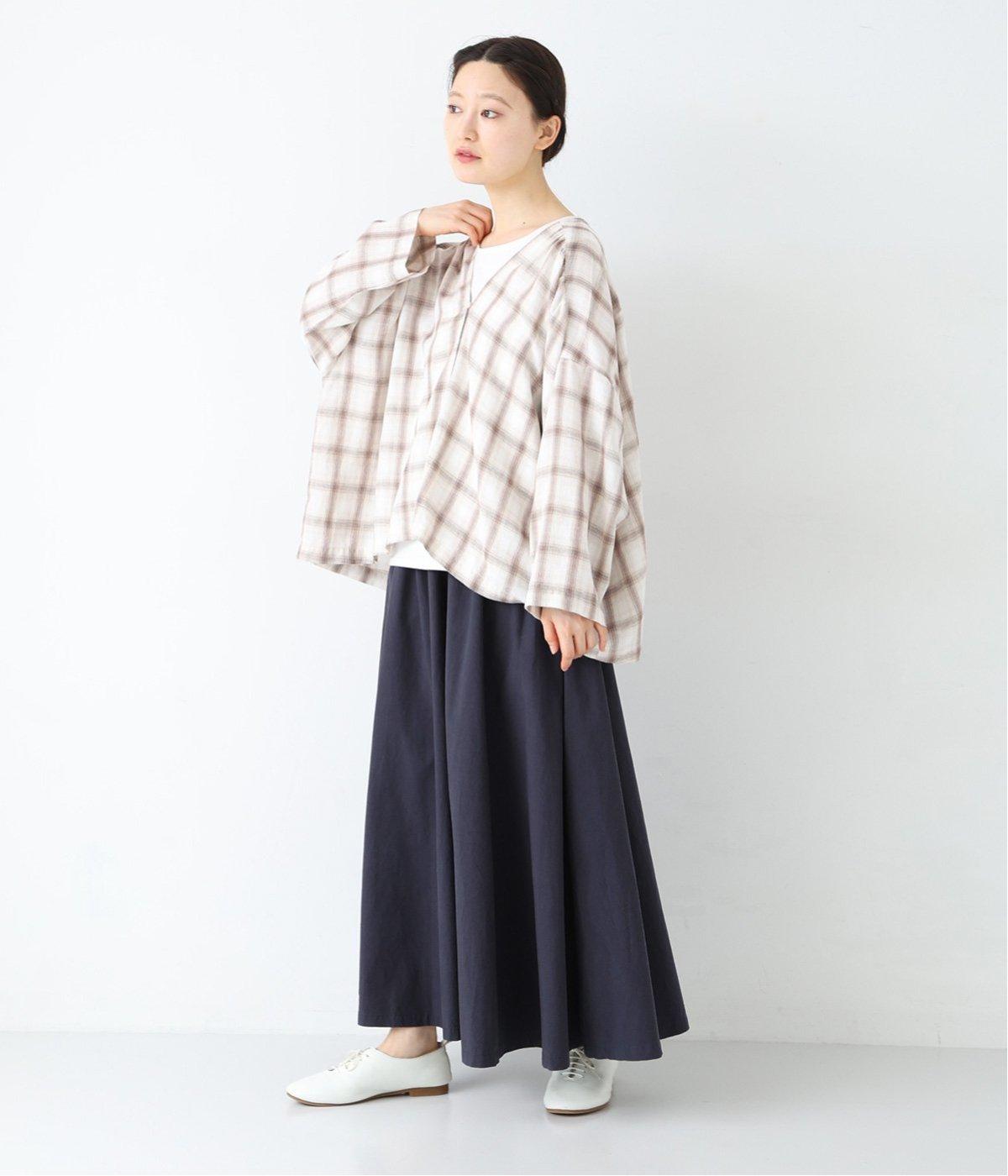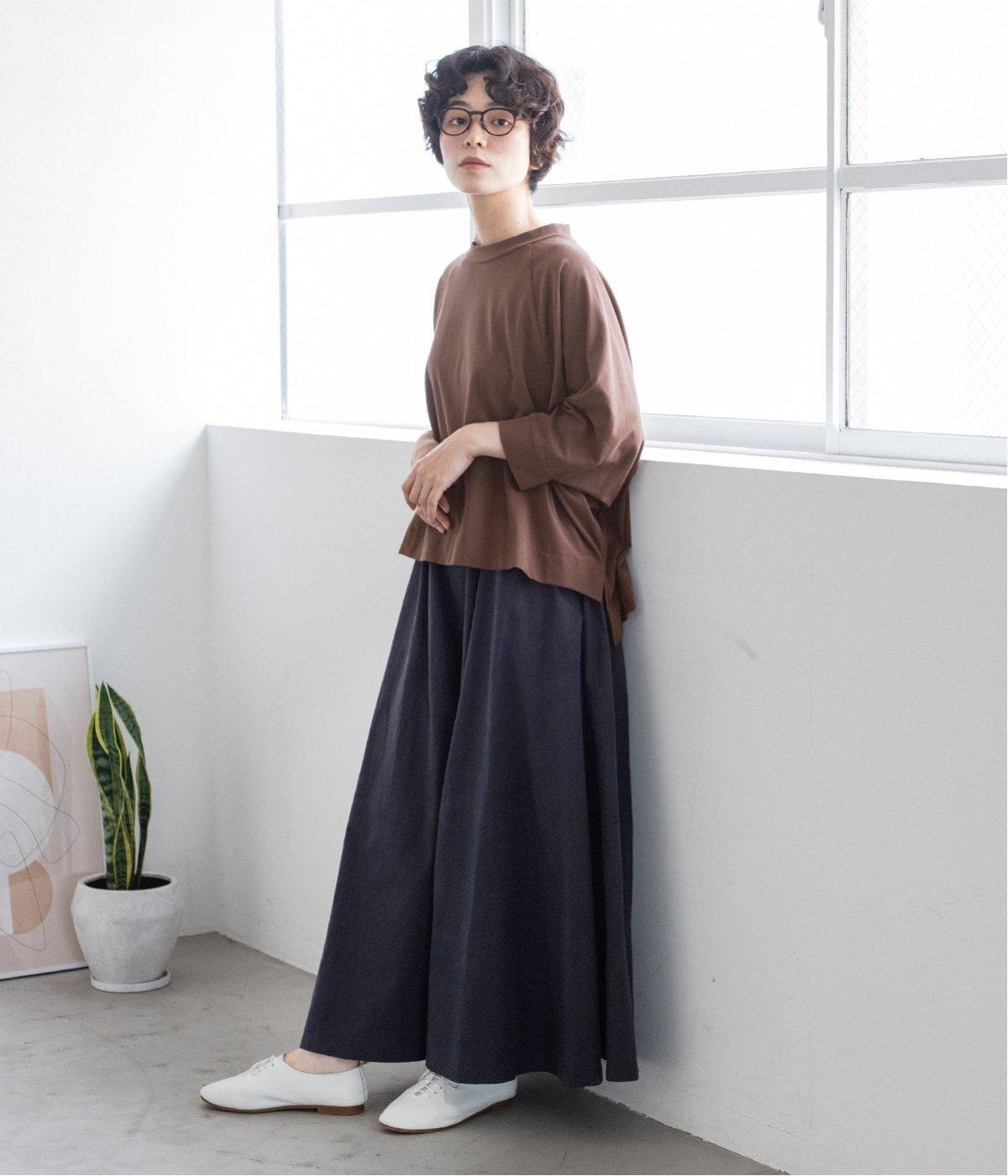 装いに軽さを添える明るめのグレージュは、チャコールのブラウスとシックにまとめました。風をはらむワイドシルエットながら、広がりすぎずストンと落ちるラインが美しく、大人の余裕を感じさせる着こなしです。