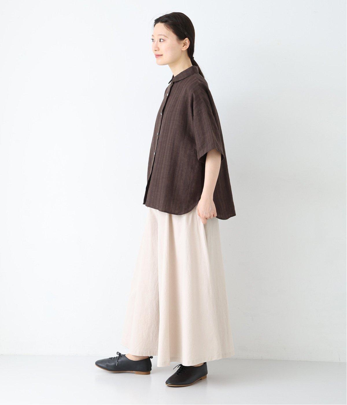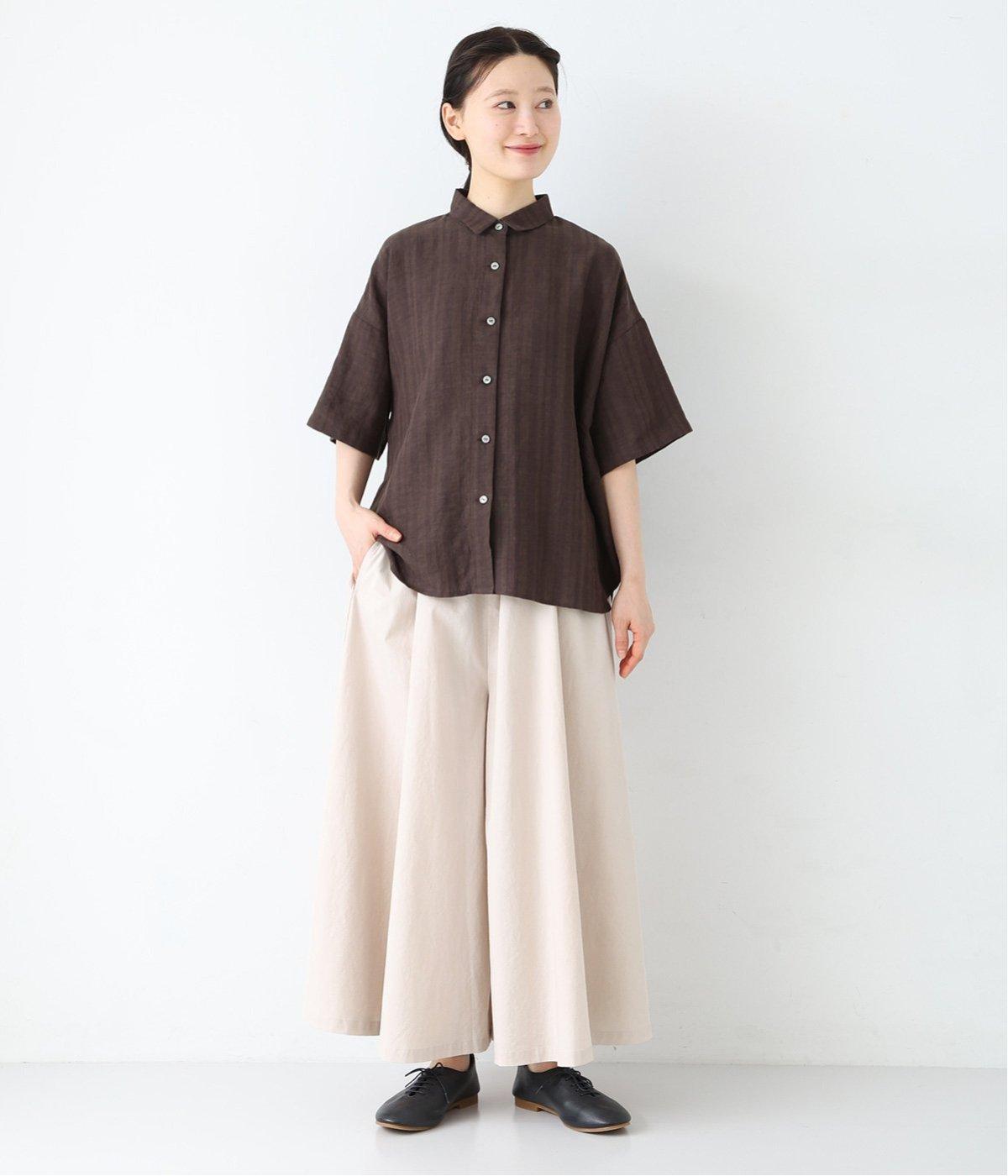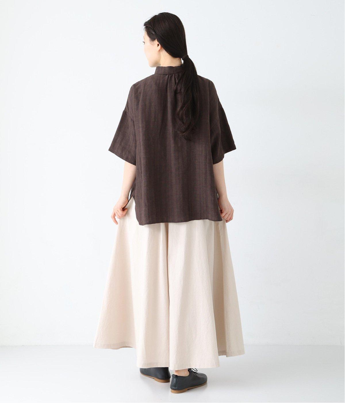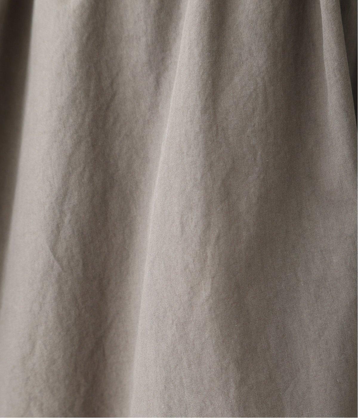 装いに軽さを添える明るめのグレージュは、チャコールのブラウスとシックにまとめました。風をはらむワイドシルエットながら、広がりすぎずストンと落ちるラインが美しく、大人の余裕を感じさせる着こなしです。