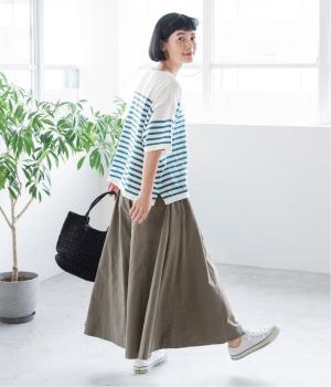 爽やかなカラーのボーダーTシャツと合わせて、さらっとラフに仕上げたスタイリング。上品な素材感のパンツが、大人らしさを引き立てます。
