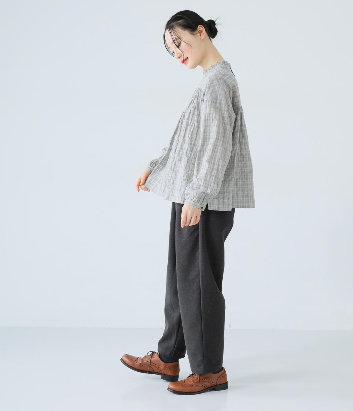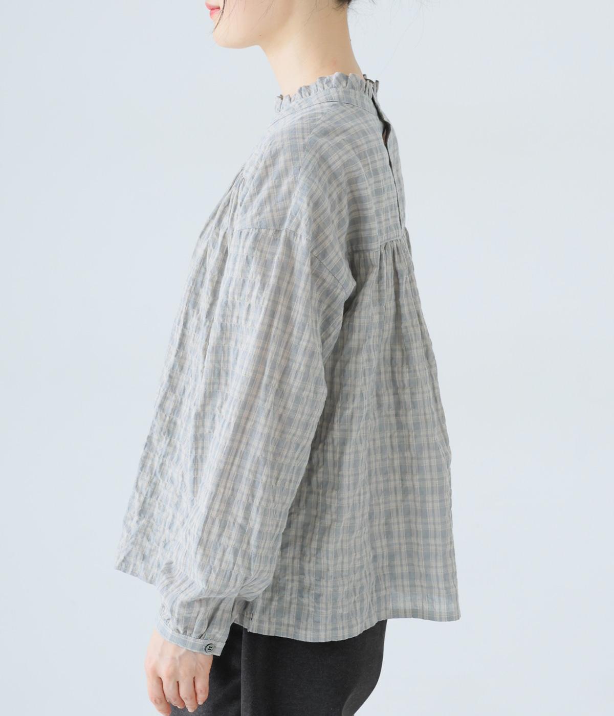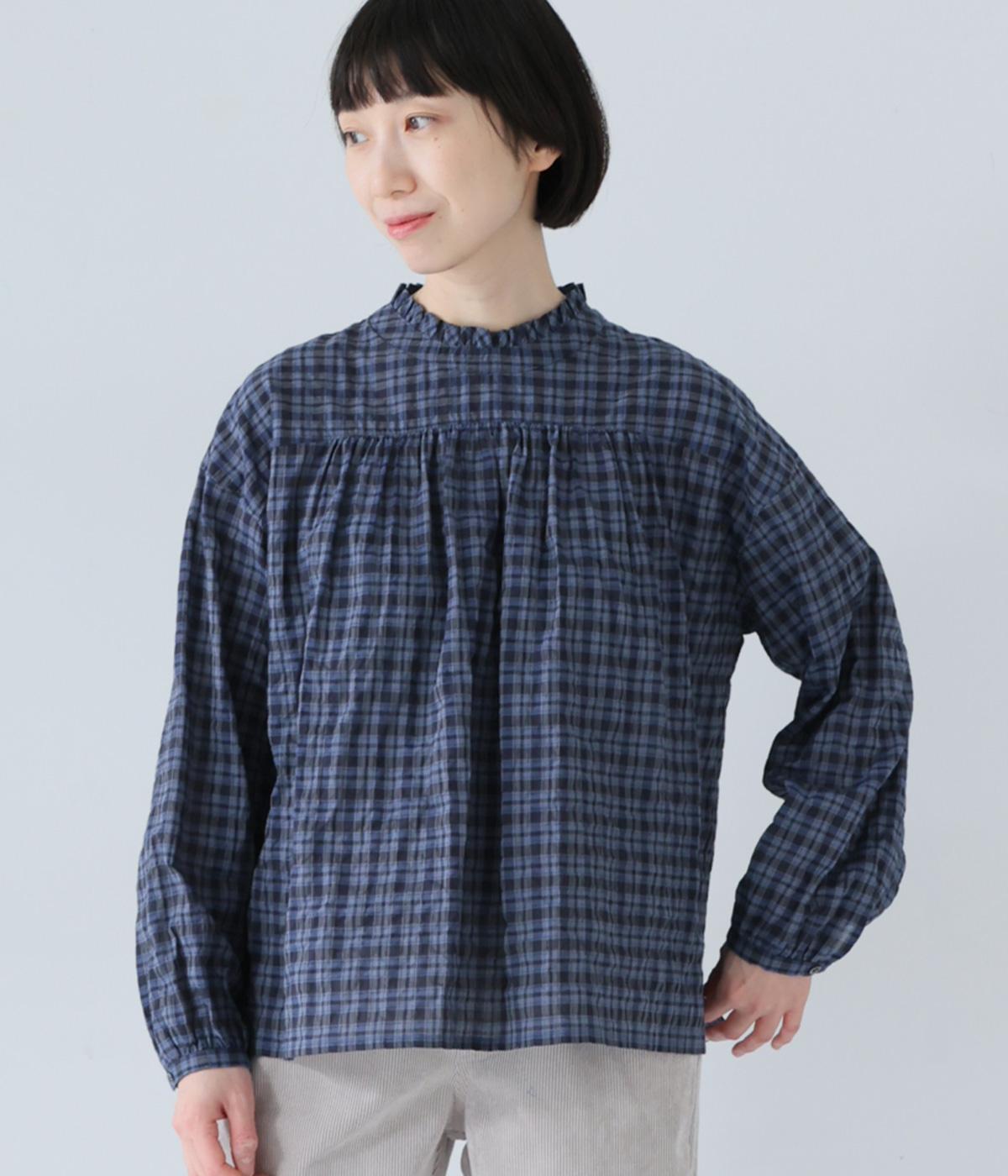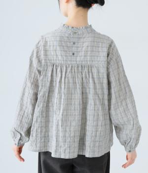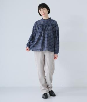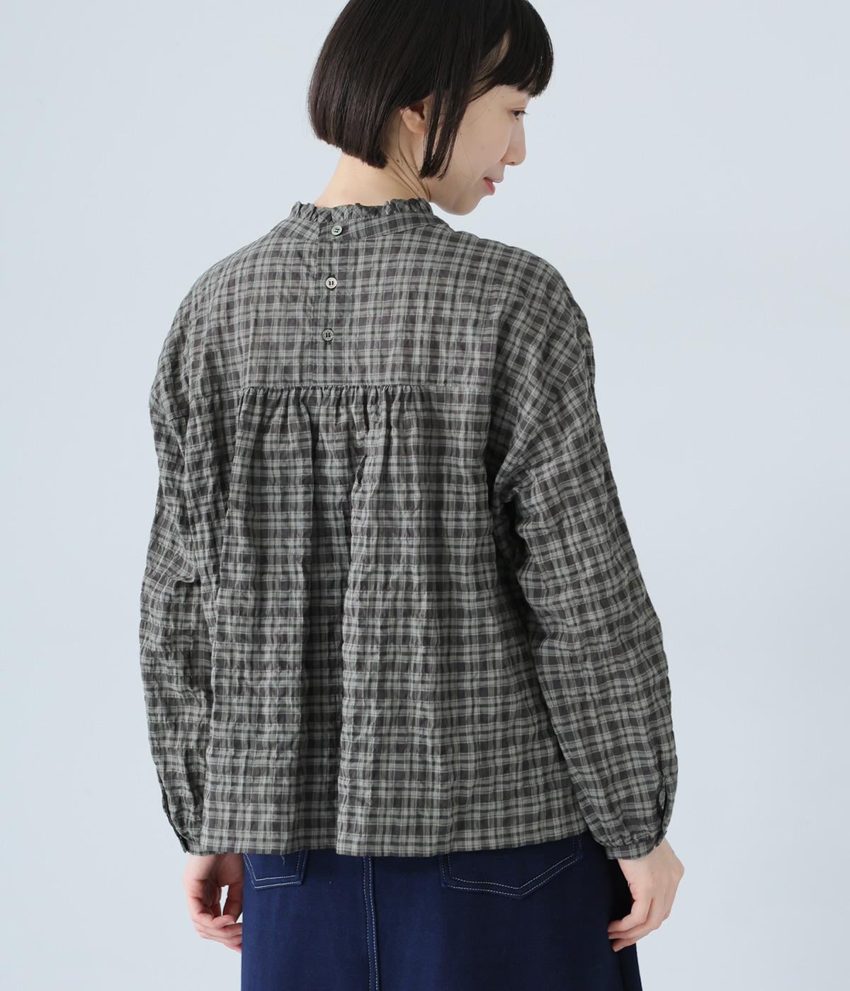 クシュっとした薄手のシャーリング生地にチェック柄をあしらいました。コットンならではの軽やかさと通気性の高さを存分に味わえる生地感です。