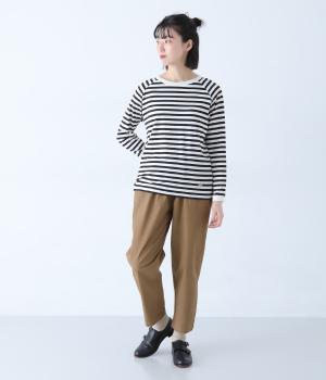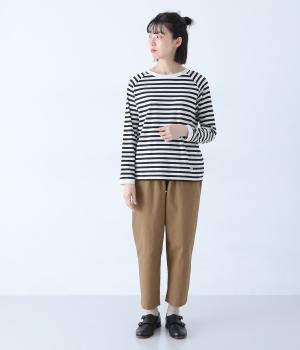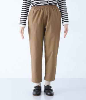 脚のラインをすっきりと見せる裾に向かって細くしたテーパードパンツ。トップスにボリュームが出やすい秋冬にもバランスの良い着こなしがたのしめます。ヒップポケットが後ろ姿のアクセントになりつつ、お尻のラインをさりげなくカバー。ウエストは総ゴム仕様で内紐つきです。