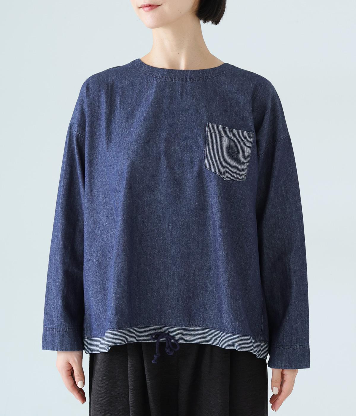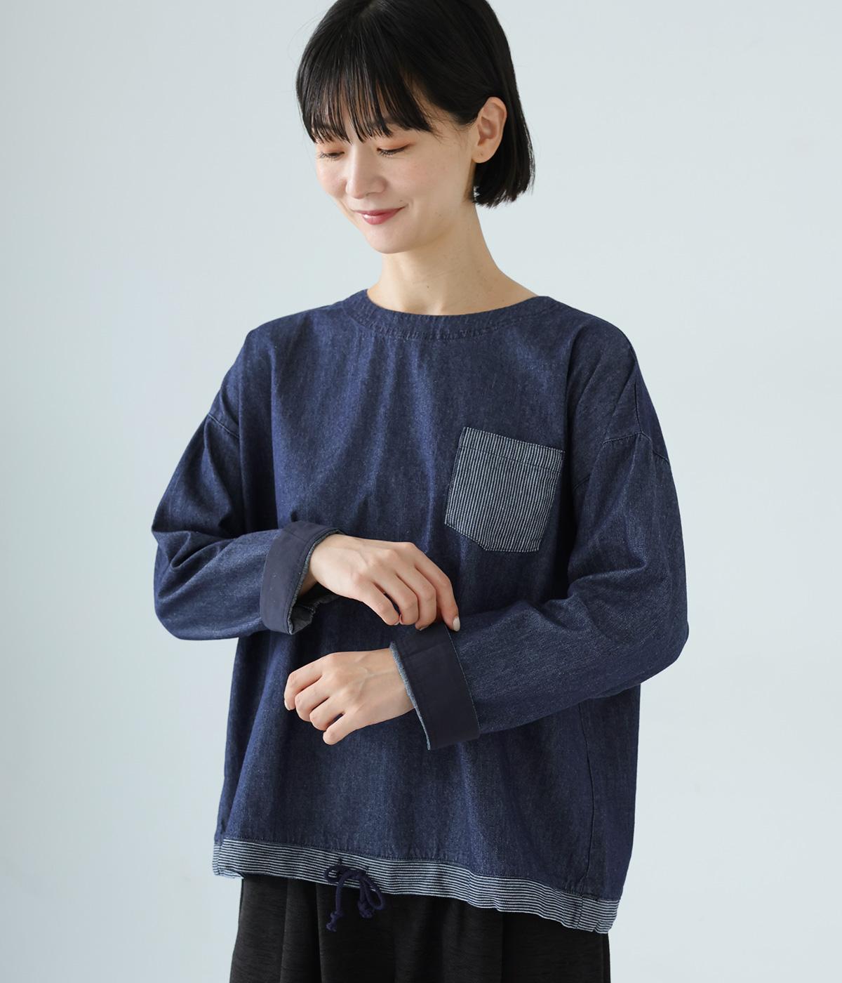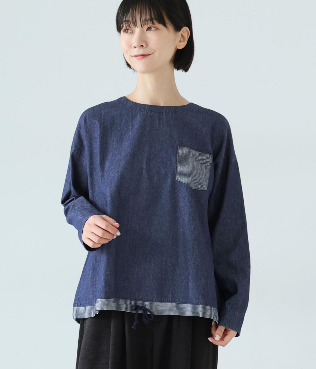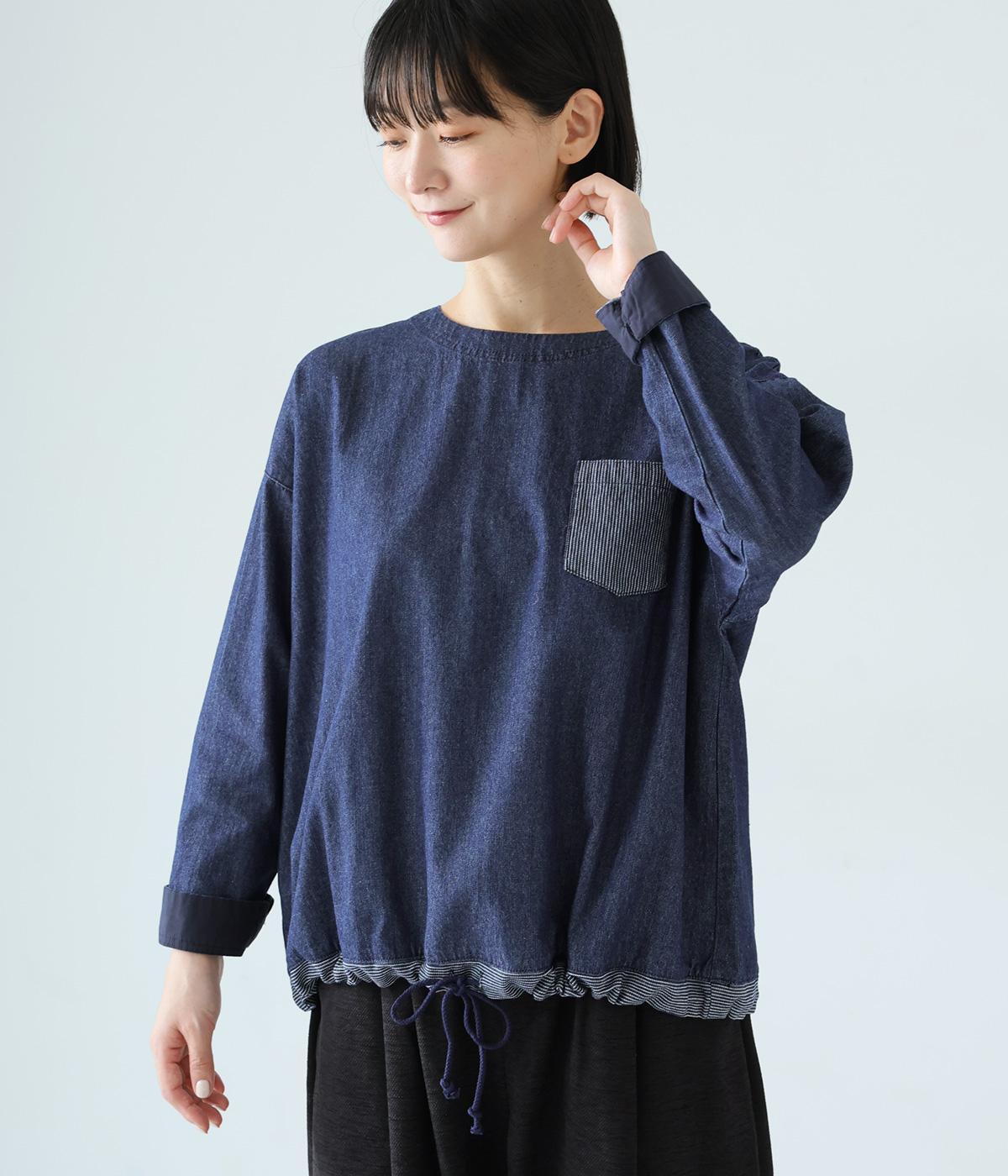 胸ポケットと裾にストライプ生地をドッキングしたデザインブラウス。後ろにタックを入れたゆとりのあるシルエットでラフに着用できます。裾の紐を絞れば丸みのあるフォルムにアレンジ可能。バックネックのボタンは着脱をアシストしつつ、後ろ姿のアクセントにもなります。