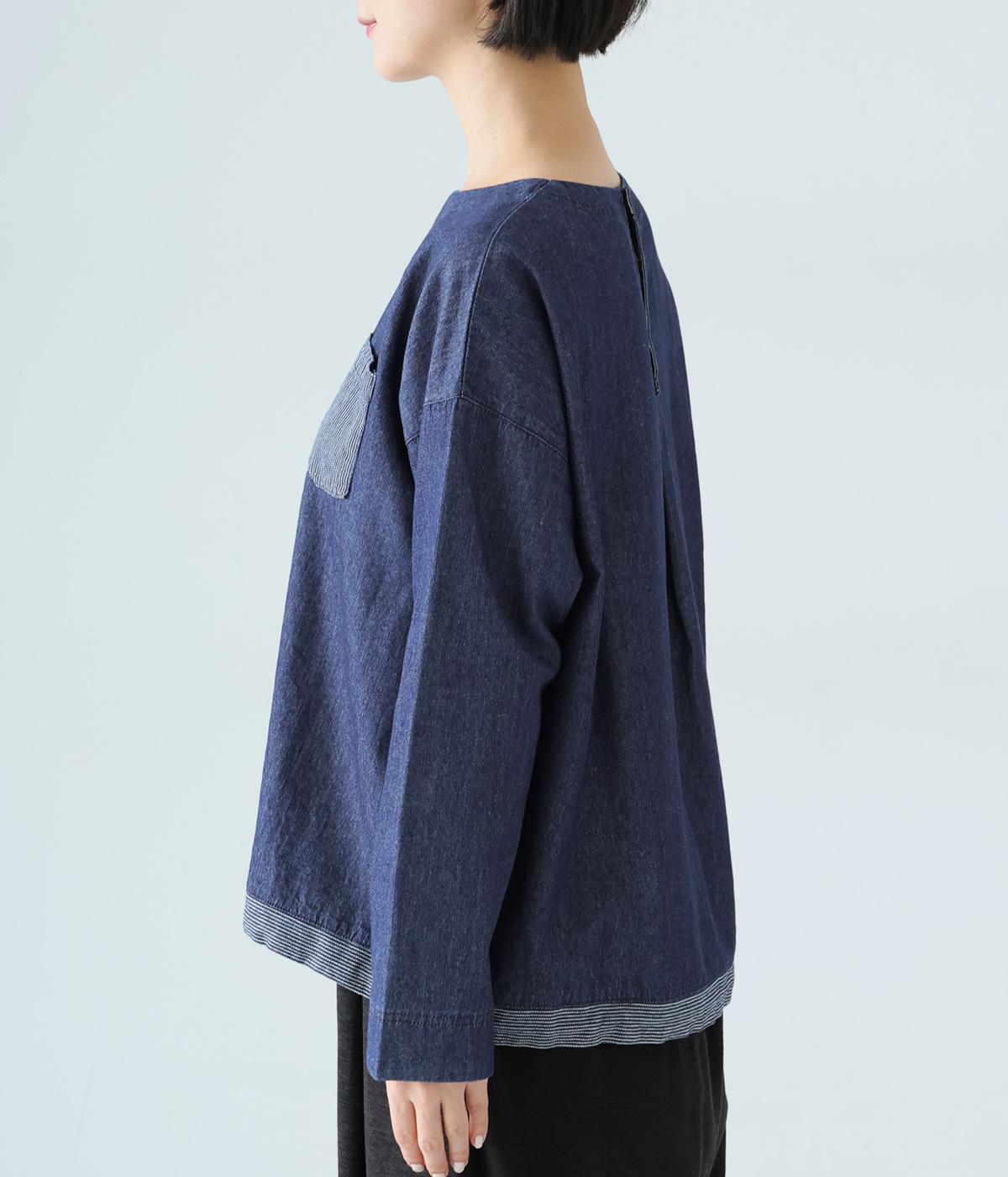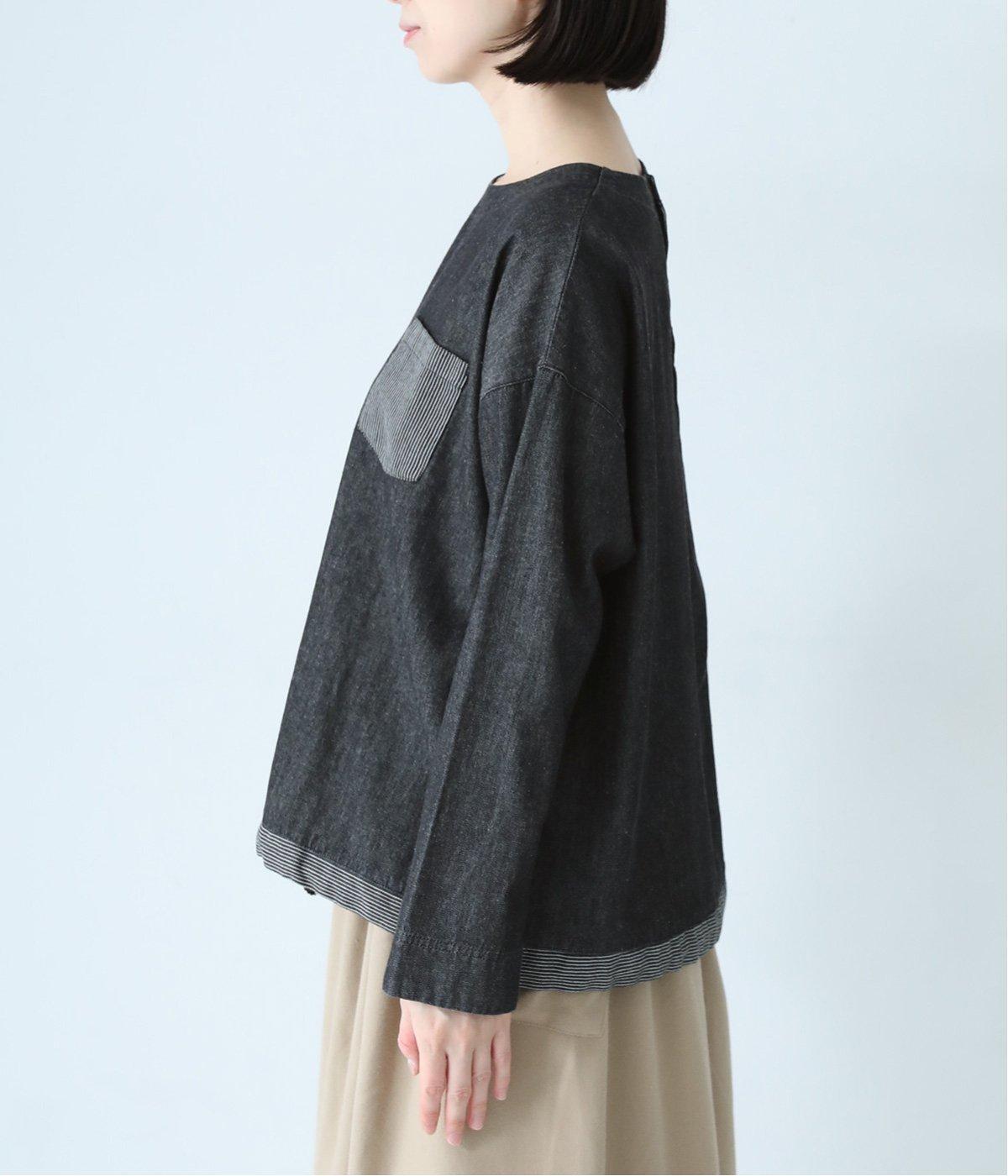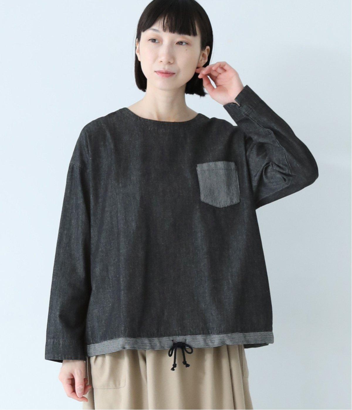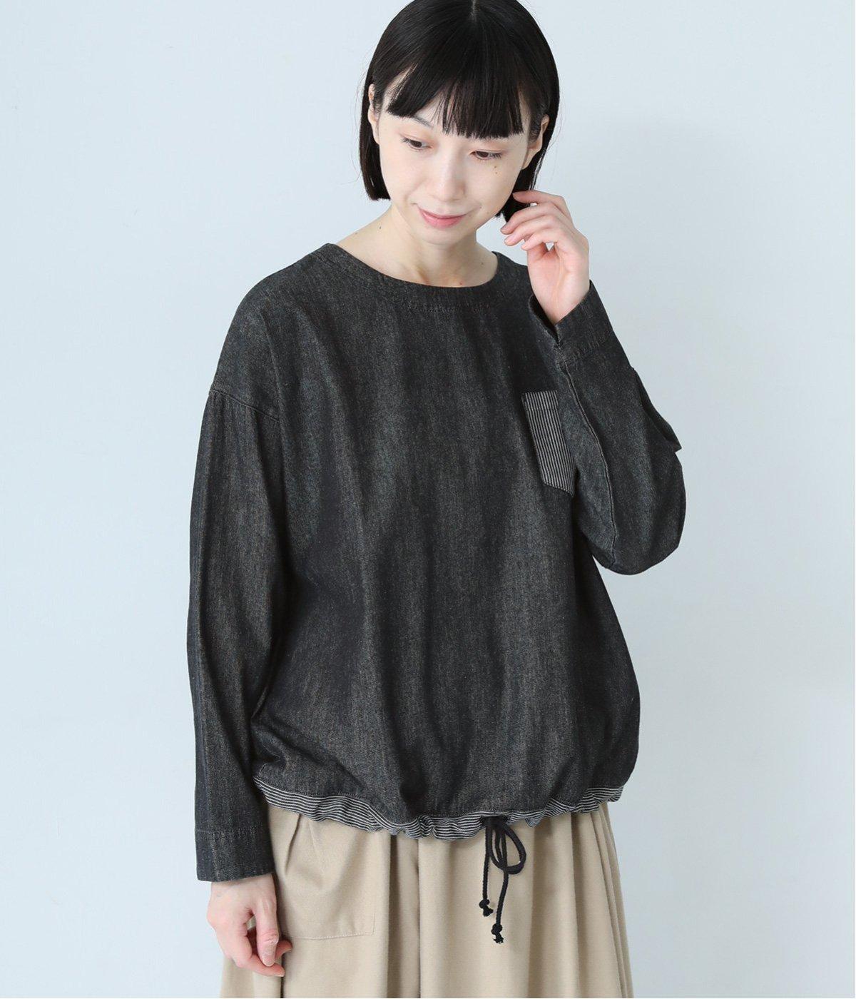 胸ポケットと裾にストライプ生地をドッキングしたデザインブラウス。後ろにタックを入れたゆとりのあるシルエットでラフに着用できます。裾の紐を絞れば丸みのあるフォルムにアレンジ可能。バックネックのボタンは着脱をアシストしつつ、後ろ姿のアクセントにもなります。