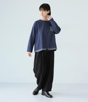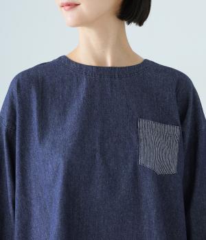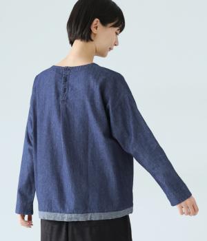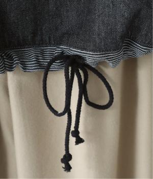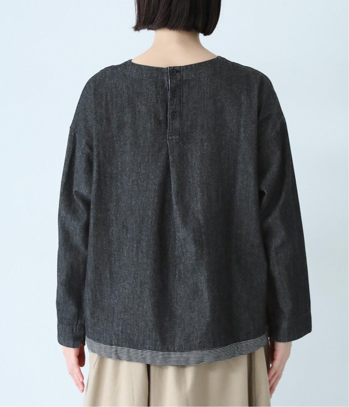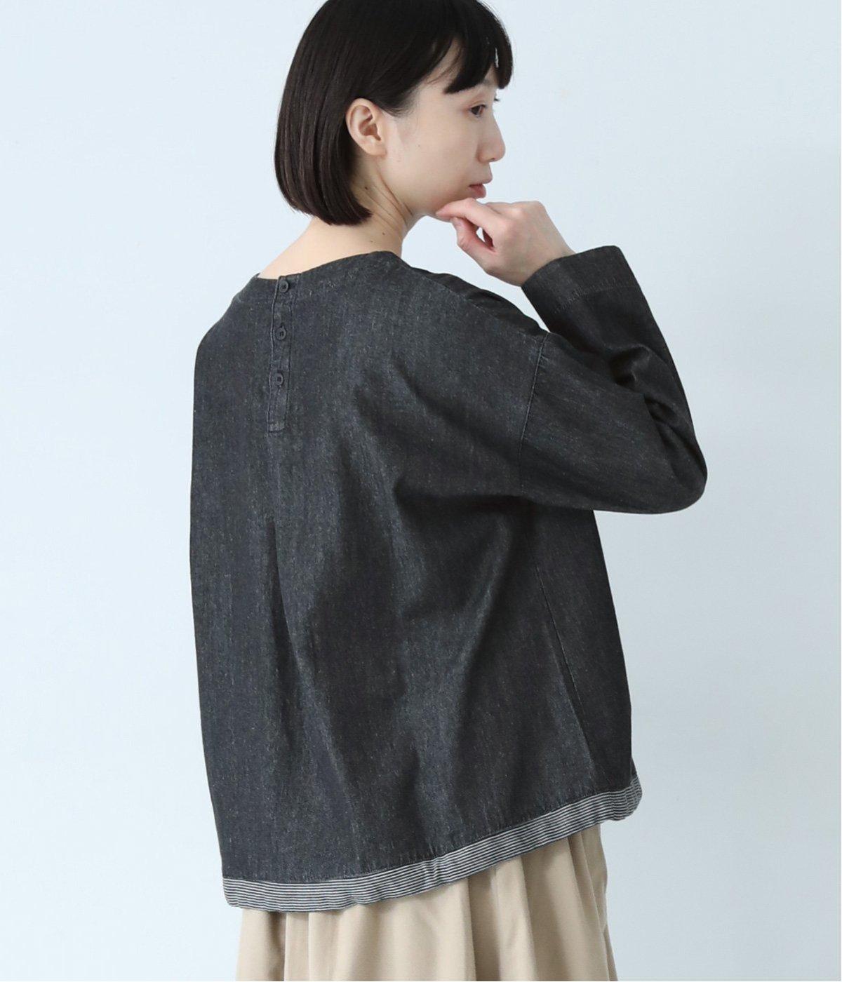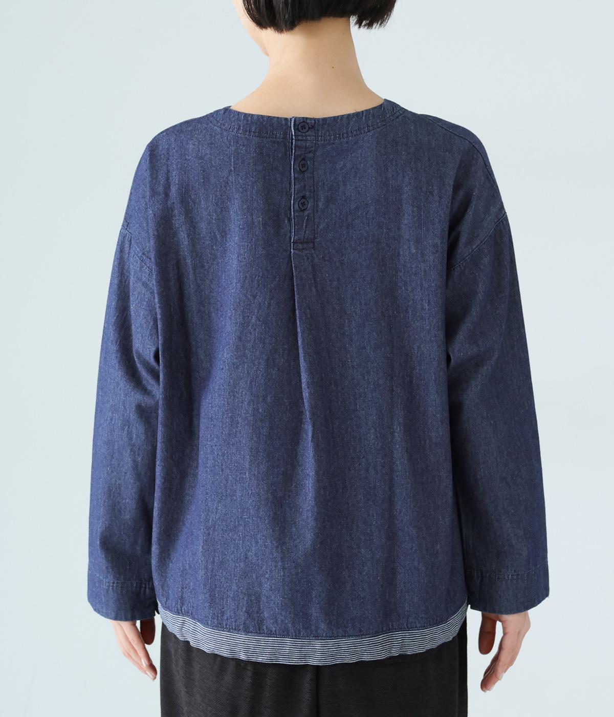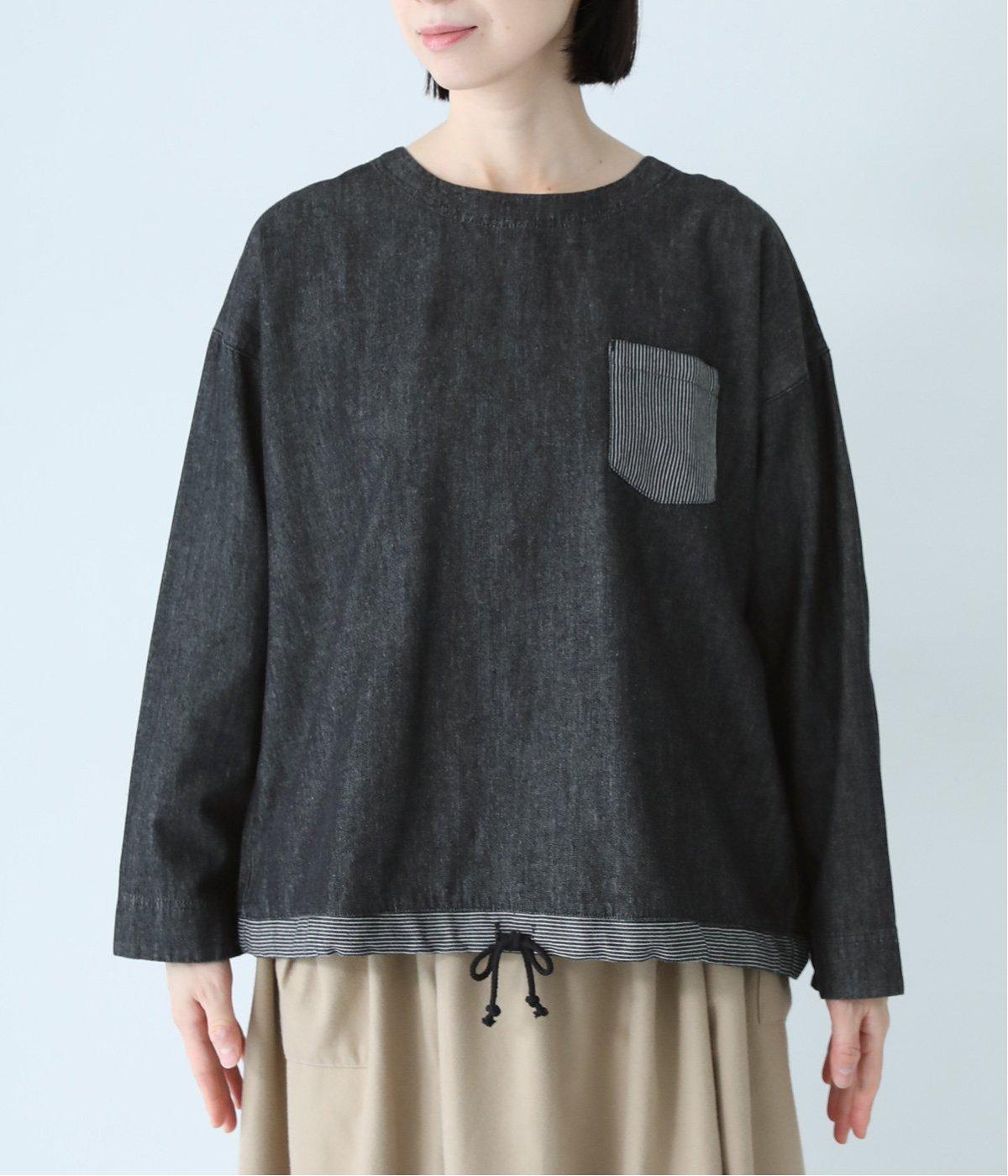 胸ポケットと裾にストライプ生地をドッキングしたデザインブラウス。後ろにタックを入れたゆとりのあるシルエットでラフに着用できます。裾の紐を絞れば丸みのあるフォルムにアレンジ可能。バックネックのボタンは着脱をアシストしつつ、後ろ姿のアクセントにもなります。