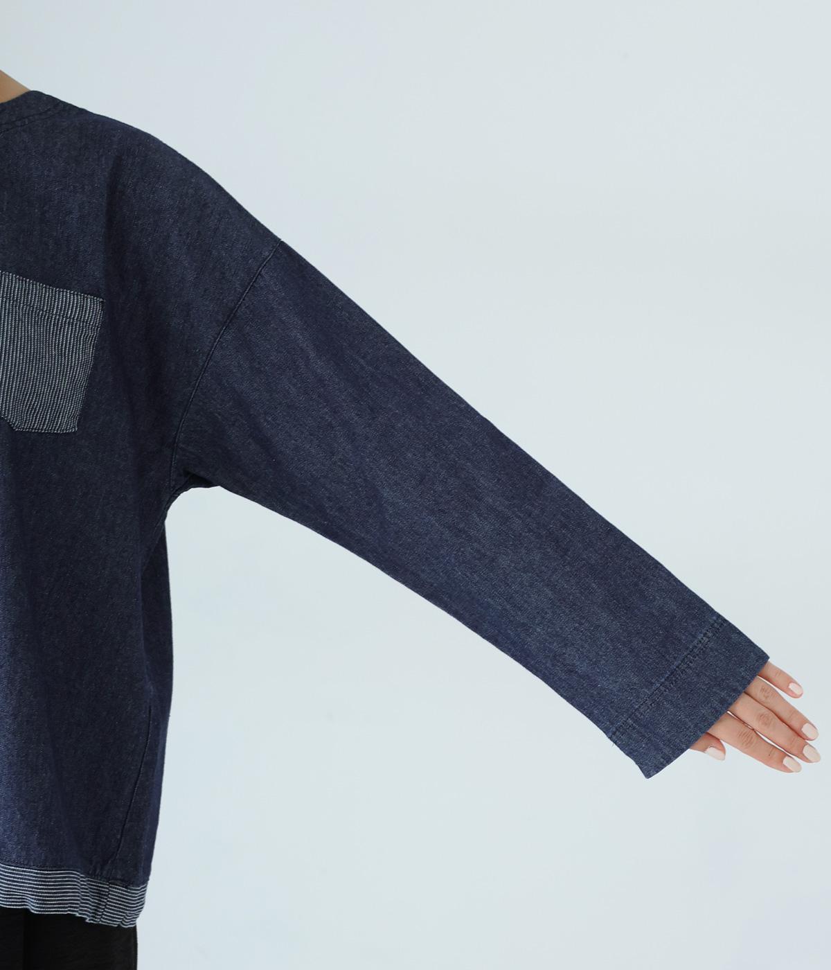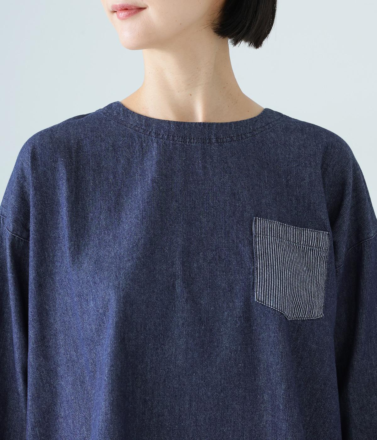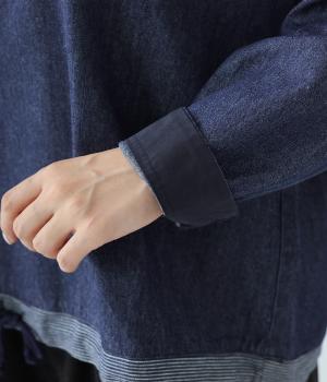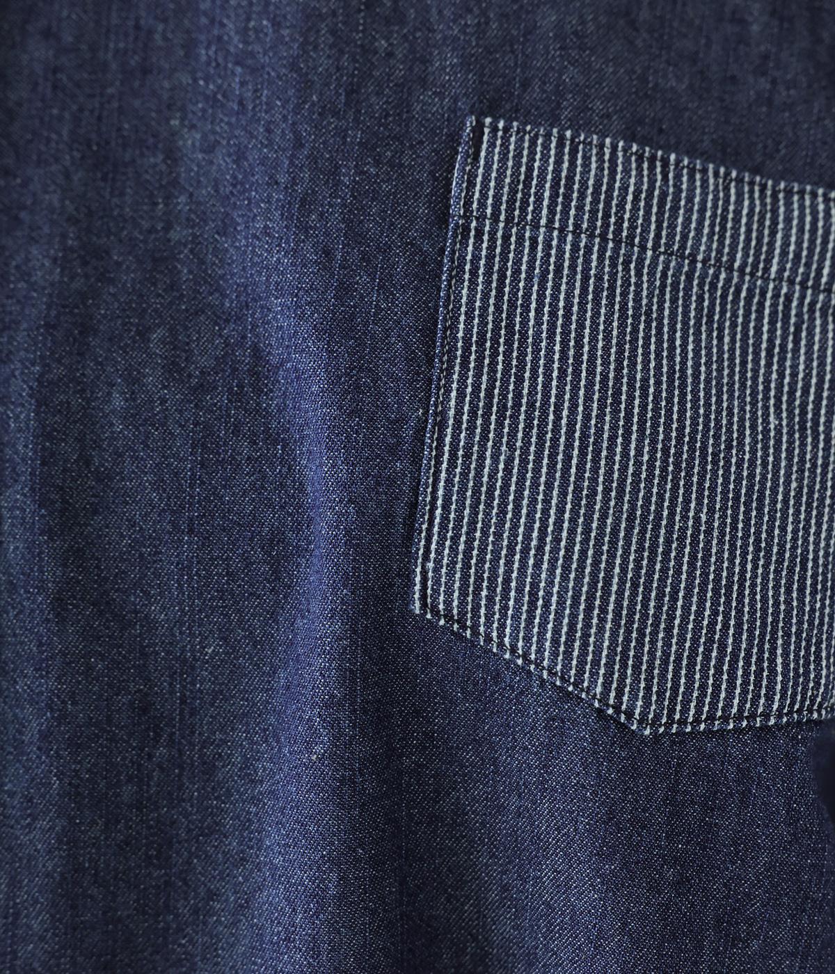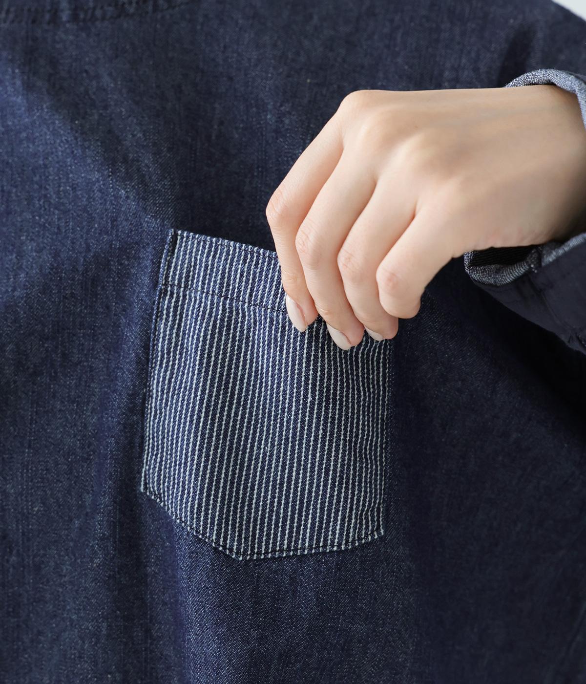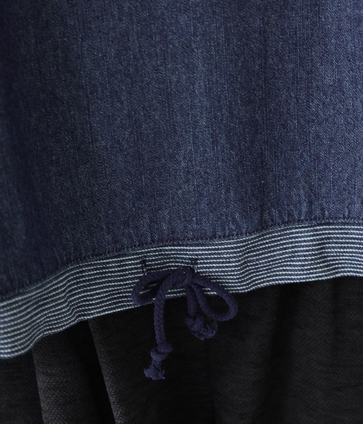 インディゴ染めならではの深みのある色合いと自然な佇まいがたのしめる、やや薄手のコットン生地。細いストライプ模様を入れた別布を組み合わせて表情豊かに仕上げています。