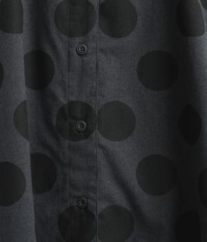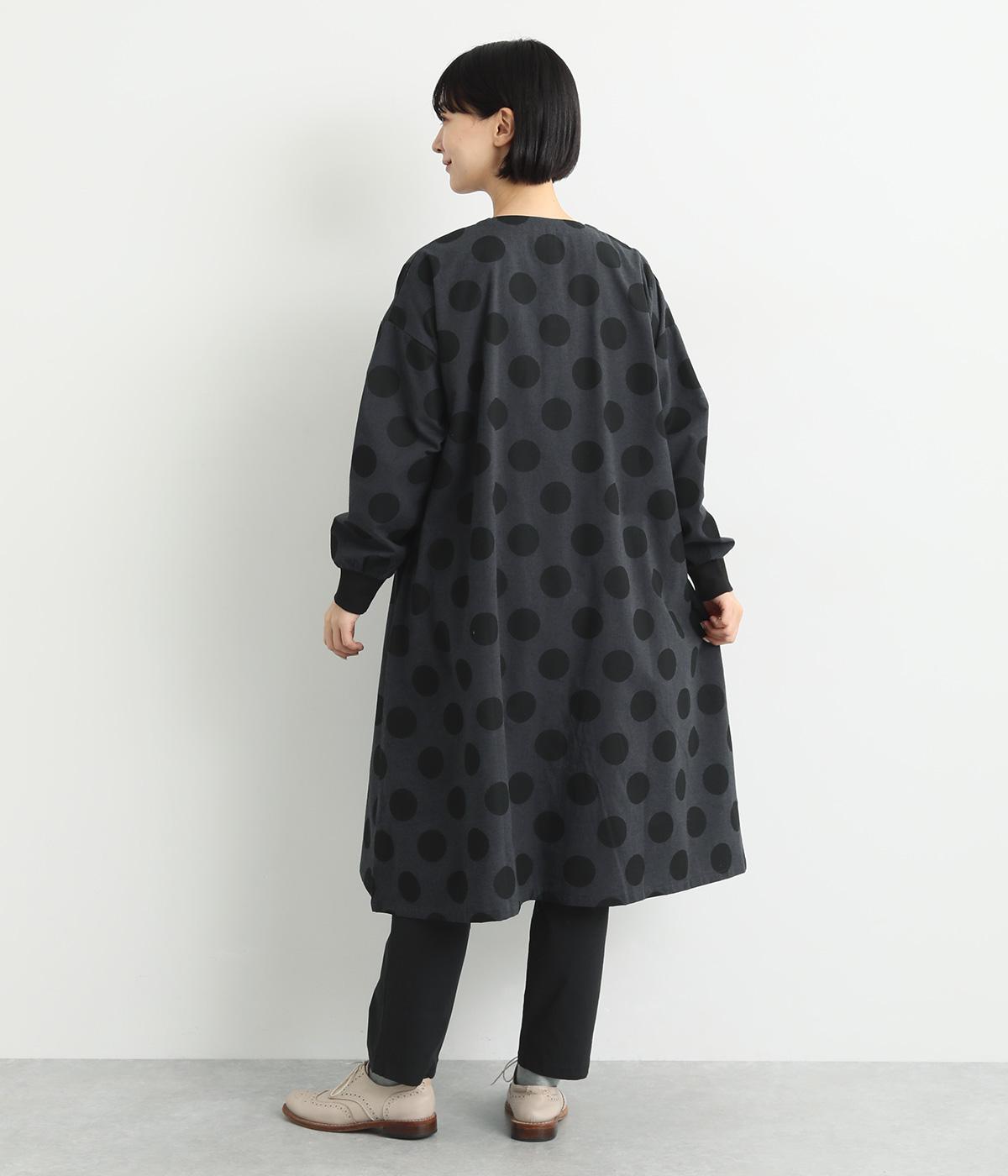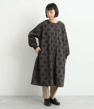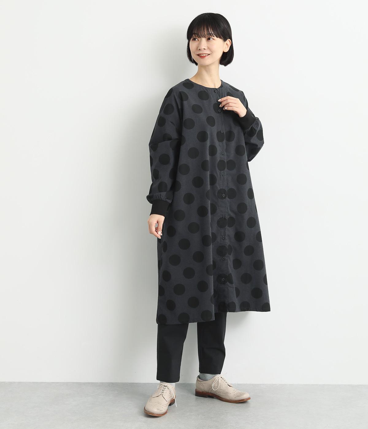 落ち着いた配色のドット柄がカジュアル&シックなワンピース。ゆったりとしたフレアシルエットにレイヤードもたのしめる丈感でデイリーに着まわせます。袖口はリブ仕様でたくし上げも◎。前あきなので羽織り使いもおすすめです。