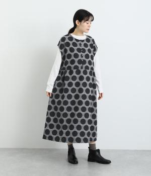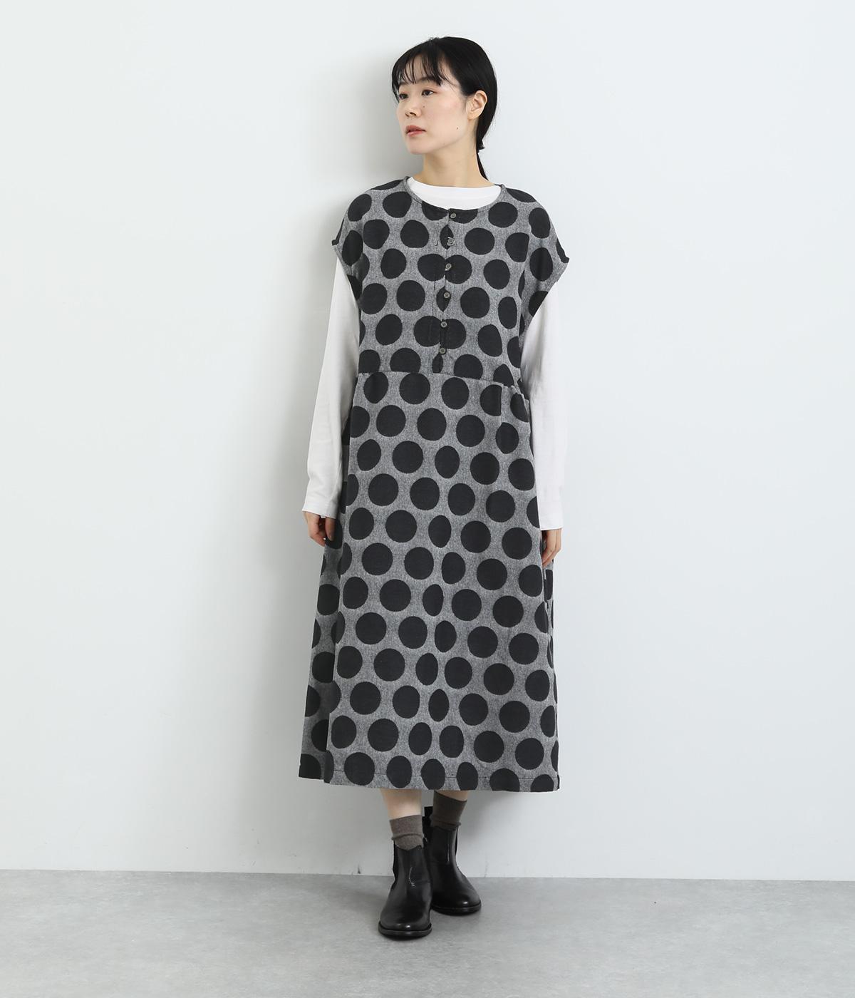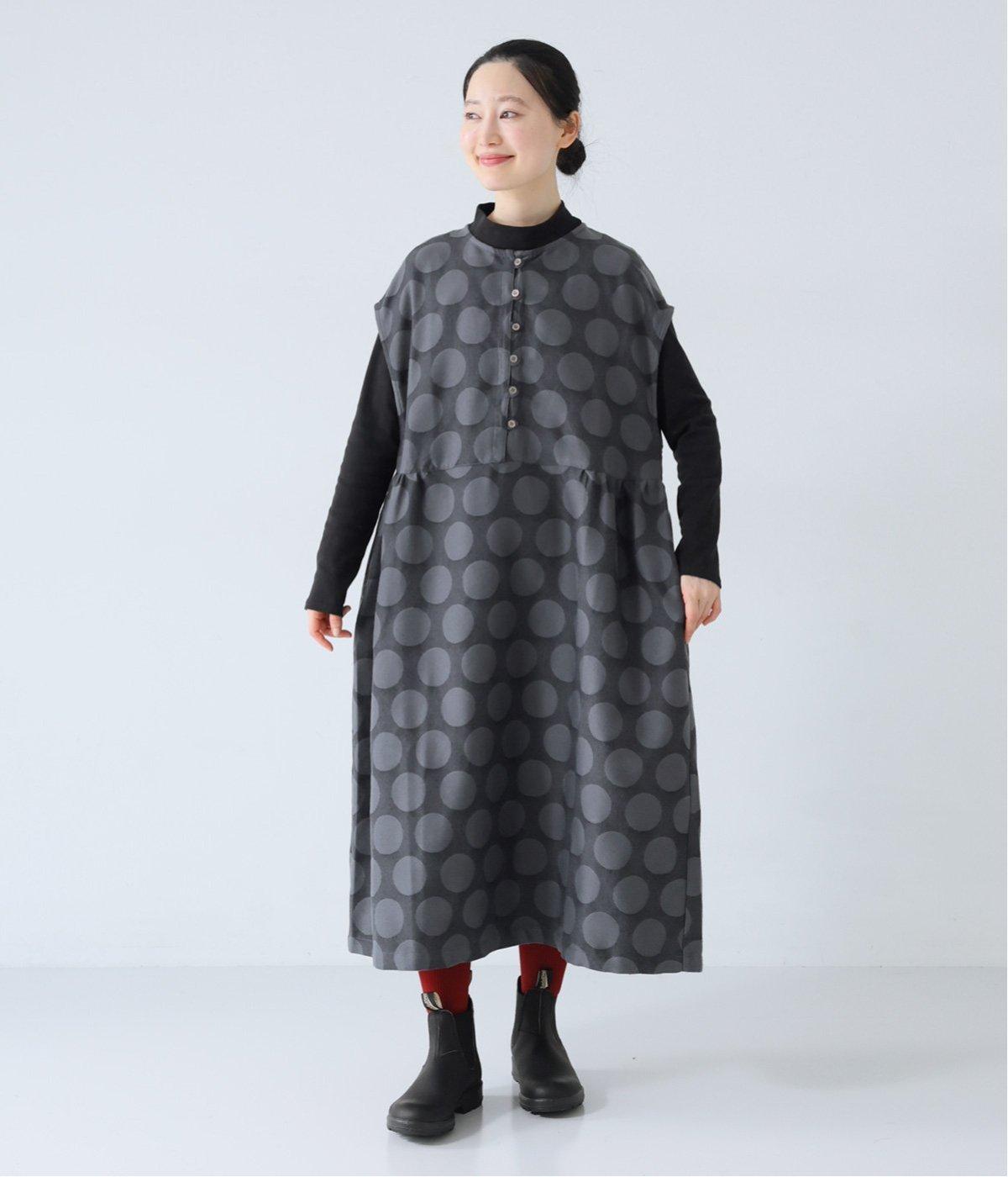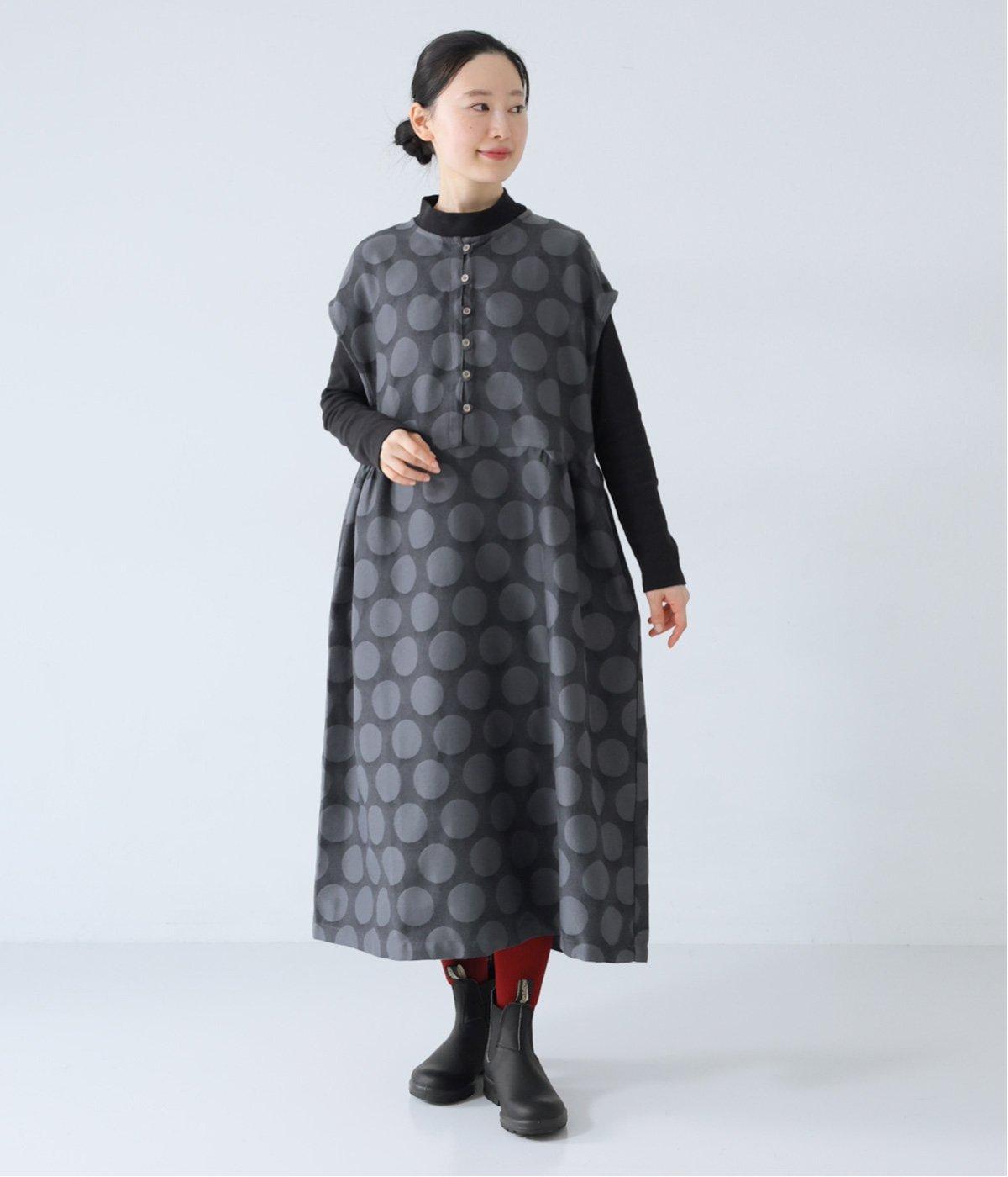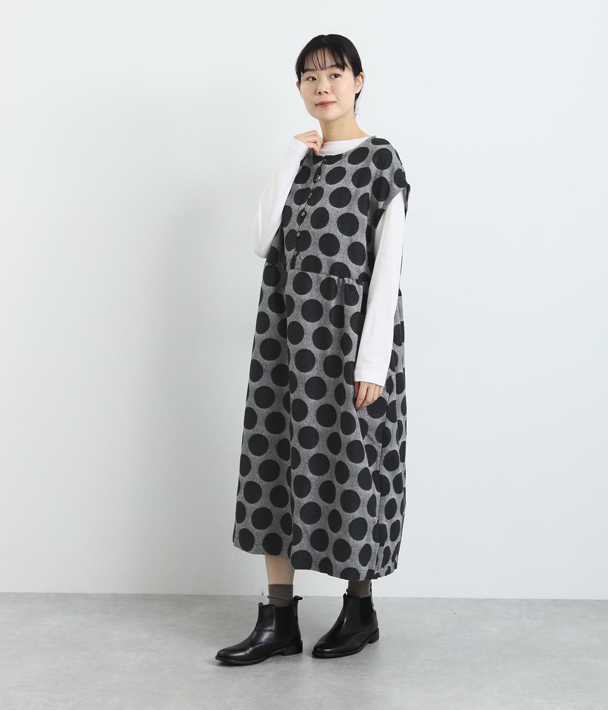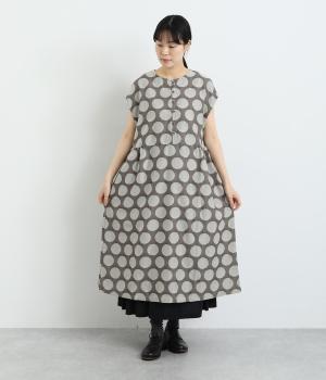 ドット柄を敷き詰めた、ガーリーさとモード感のバランスが絶妙なワンピース。フレンチスリーブでトップス合わせがたのしめ、ループボタンのハーフあきで脱ぎ着もスムーズ。足元を軽くした丈感で、ボトムとのレイヤードもおすすめ。