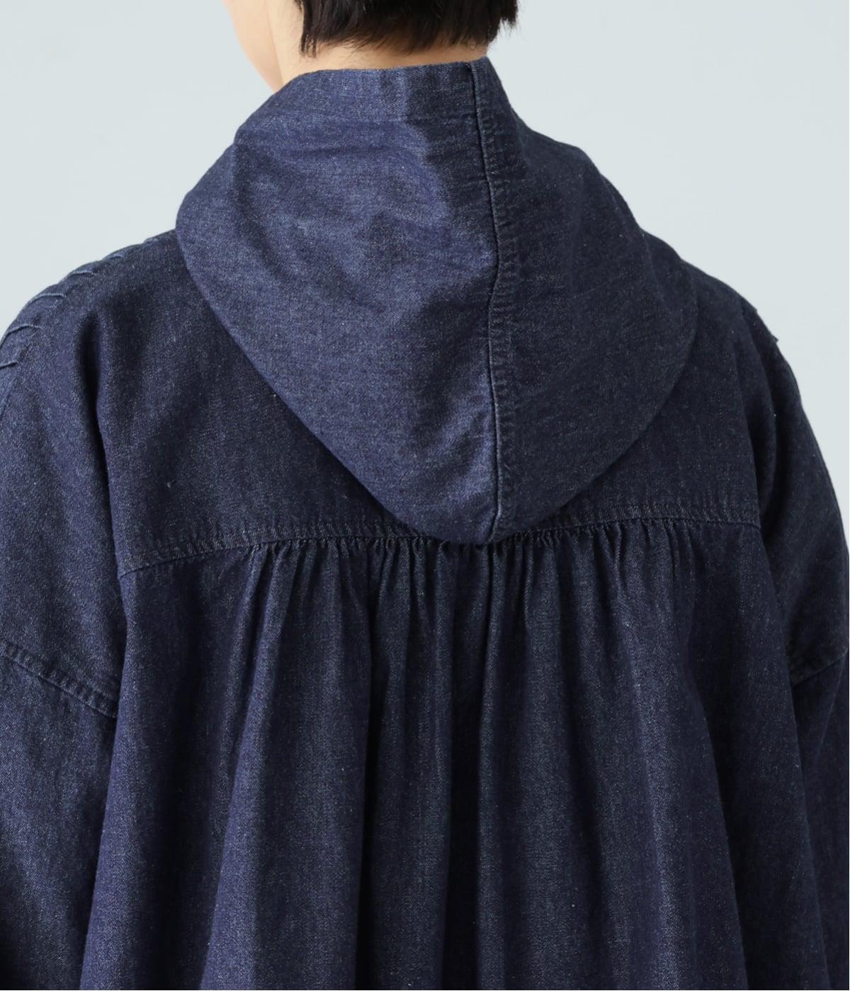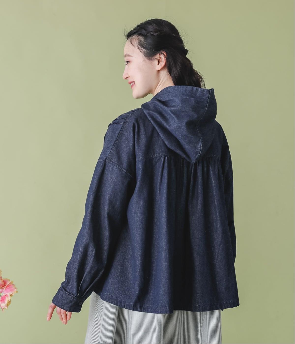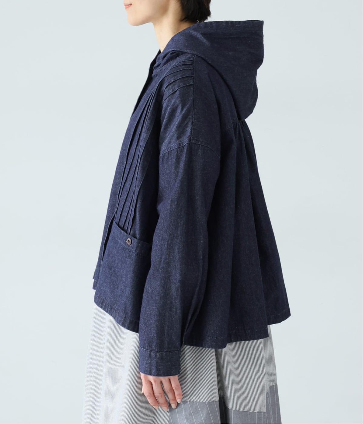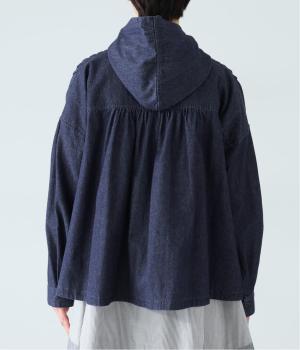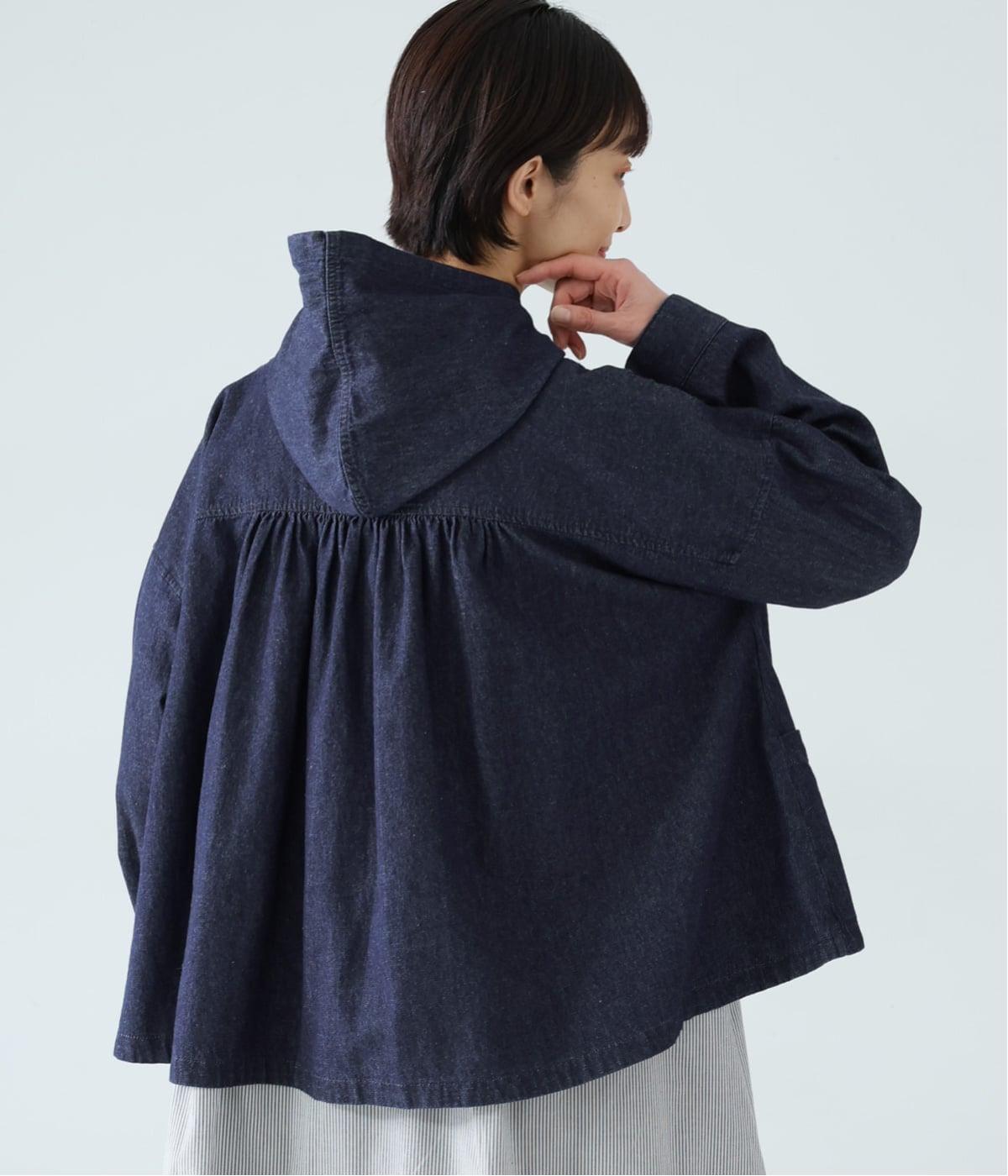 気軽に羽織りやすいライトオンスデニムのフードつきジャケット。フロントのピンタックと背中のギャザー使いで、カジュアルな中にもほんのりと甘さをプラスしました。ゆったりとしたシルエットと、やや短めの着丈のバランスもグッドです。