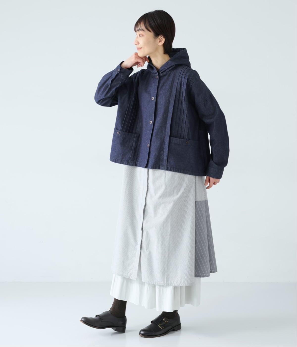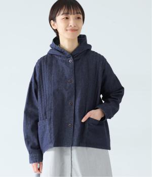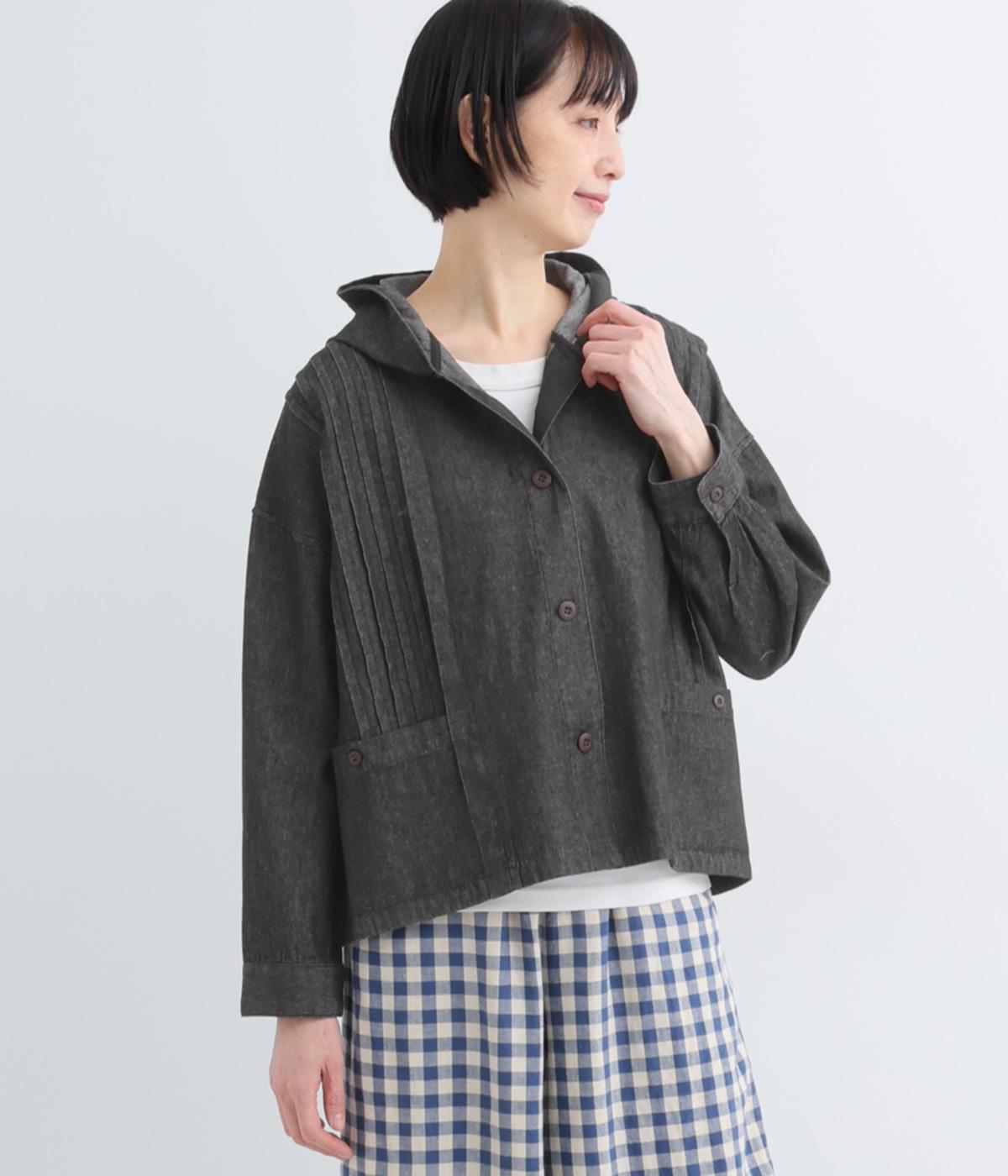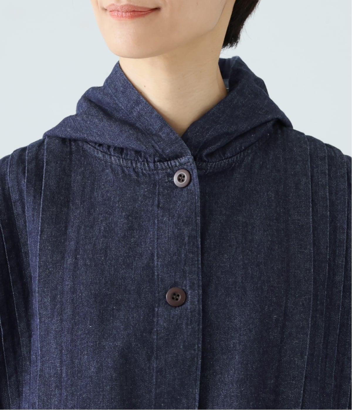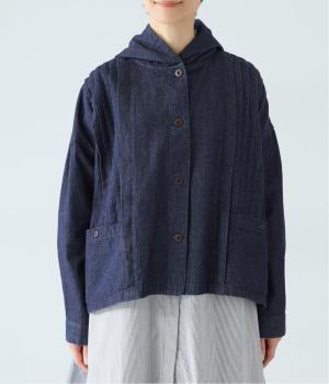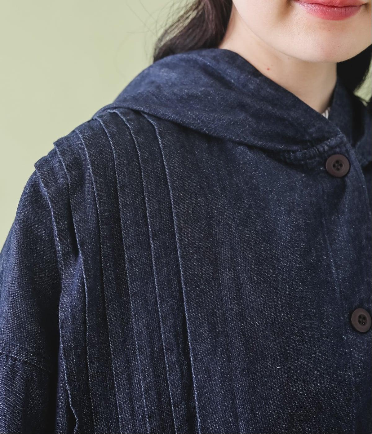 気軽に羽織りやすいライトオンスデニムのフードつきジャケット。フロントのピンタックと背中のギャザー使いで、カジュアルな中にもほんのりと甘さをプラスしました。ゆったりとしたシルエットと、やや短めの着丈のバランスもグッドです。