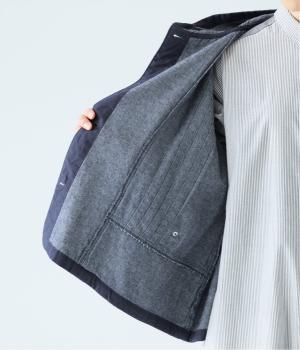 ゴワつきが少なく体になじみやすい軽量の6.3ozのデニム素材を使用しています。製品洗いをほどこして、より肌ざわりよく仕上げました。軽めの羽織りとしてデイリーに重宝します。