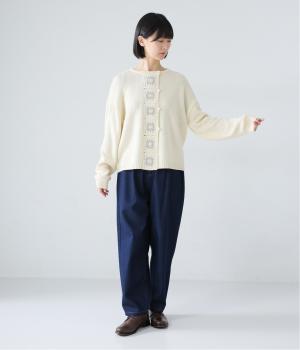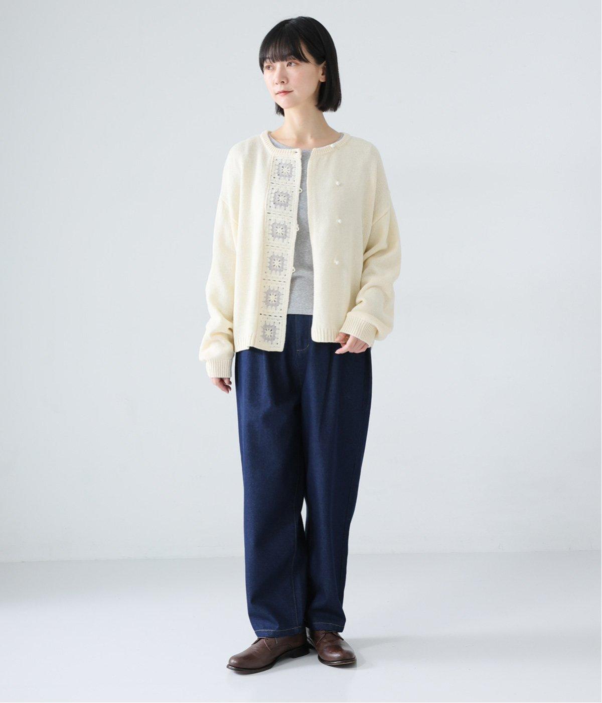 前立てにかぎ針モチーフをあしらった、まるで手編みのようなあたたかみを感じるカーディガン。ころんとした丸いボタンと、ルーズな袖丈が愛らしさを加速させます。さまざまなボトムスに合わせやすい、絶妙な着丈もグッドです。