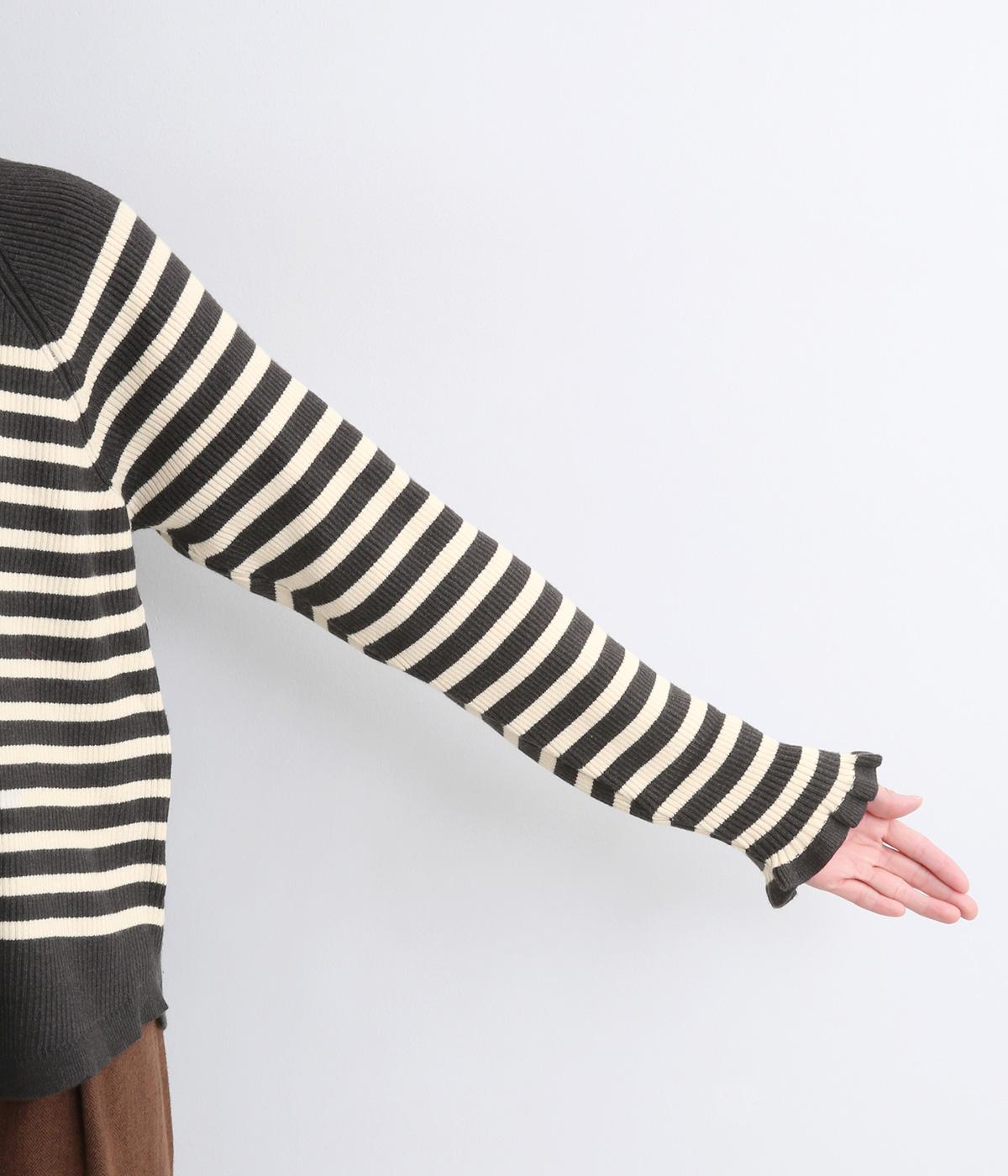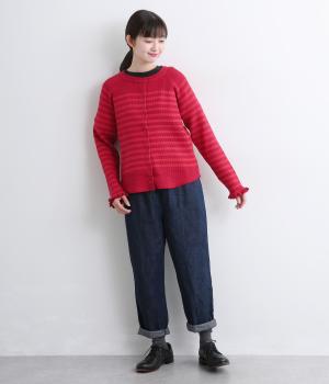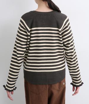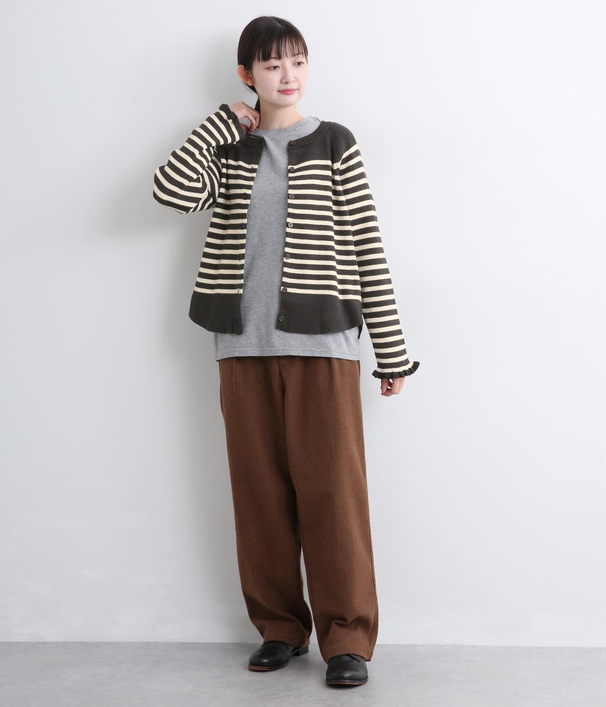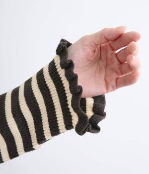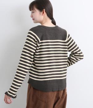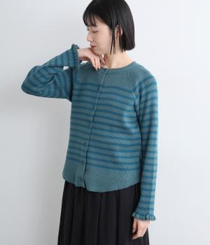 無地とのバランスや袖口のフリルでカジュアルすぎない印象に仕上げました。まあるい線を描く裾のラインが女性らしいシルエットをつくり、装いにニュアンスをプラス。伸縮性に優れた抜群の着心地で、思わず手に取ってしまう一枚です。