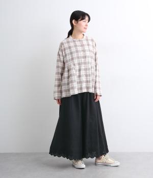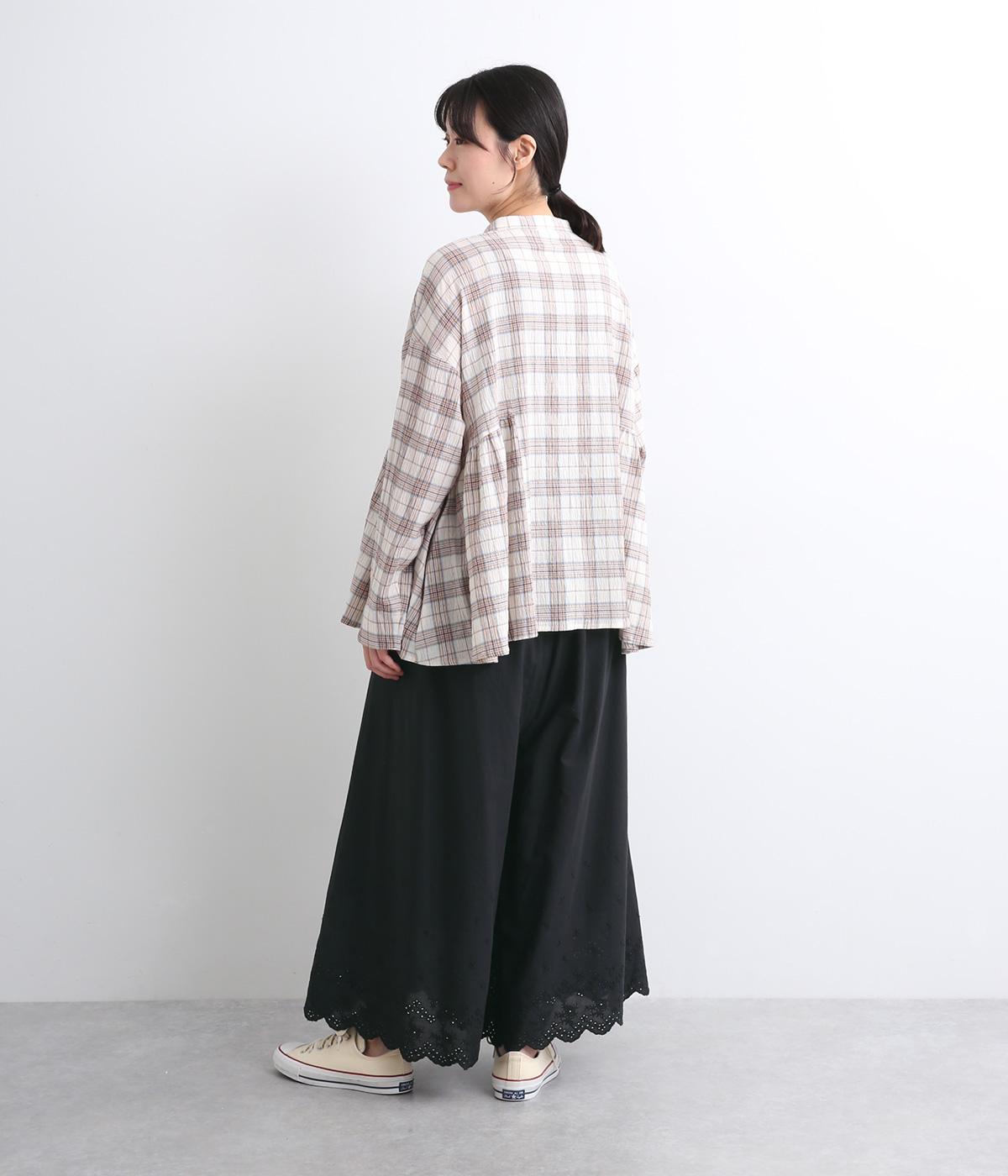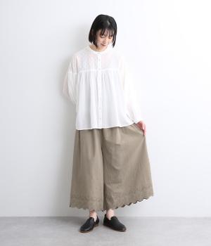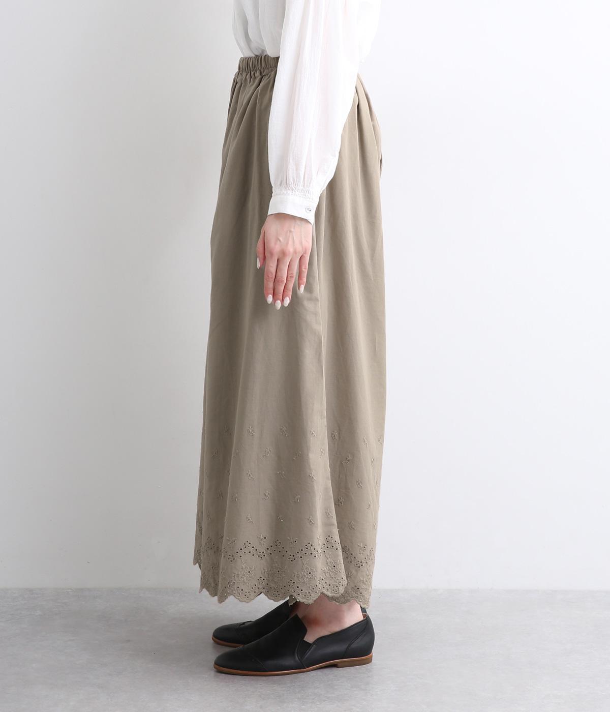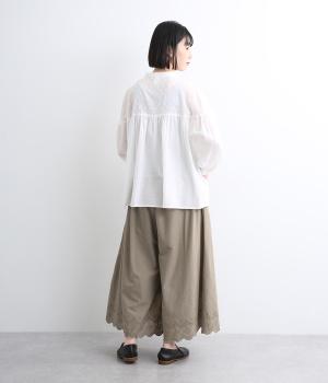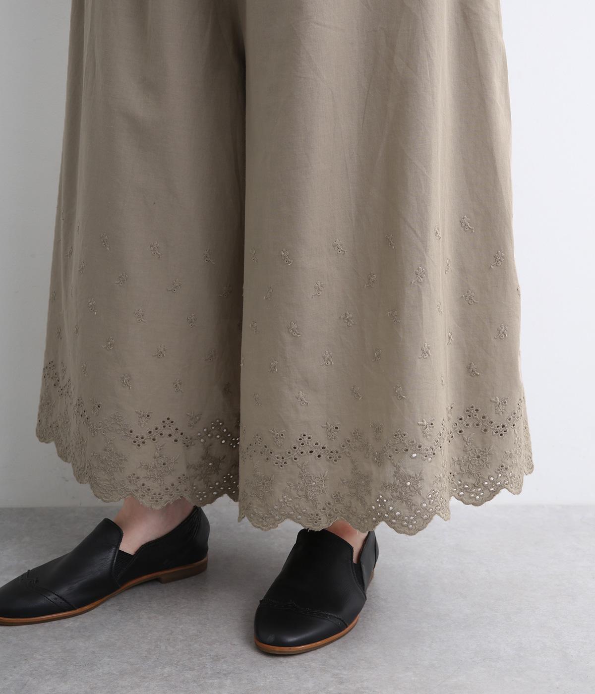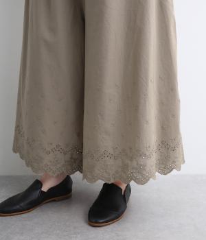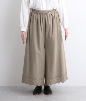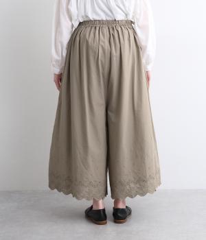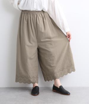 スカラップ刺しゅうの裾デザインが印象的なフレアパンツ。股上の深いはき心地の良さとスカート見えする分量感が特徴。ウエストはオールゴムでストレスを軽減し、内紐でフィット感や腰位置をお好みで調整できます。メインにもレイヤーのインナーにも活躍。