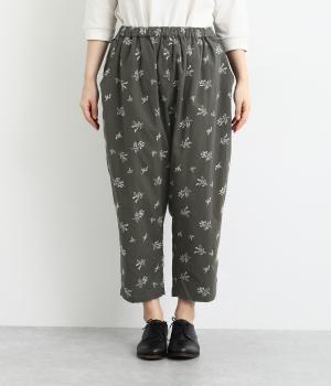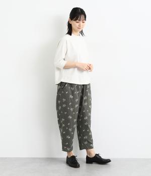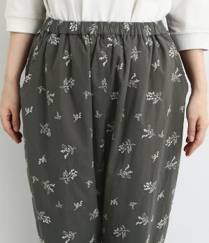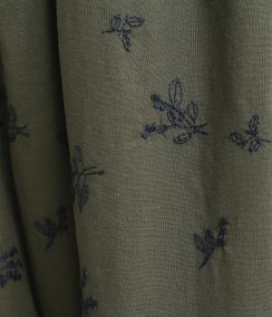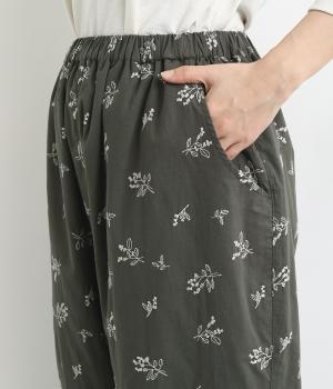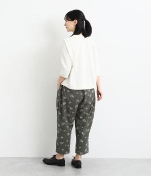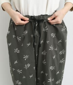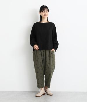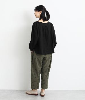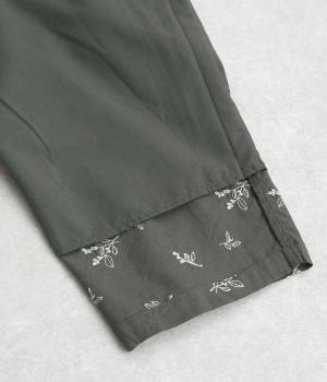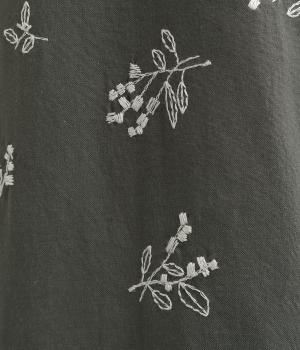 コットンポプリンにオリーブ刺しゅうを施した高級感のある生地です。麻のようなナチュラルな風合いが魅力的。綿混の裏地付きで刺しゅうが直接肌にあたらないよう、肌触りのよさにも配慮しています。